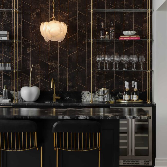 Custom Home up to 3,000 sq. ft. Lakefront Luxury This lakefront retreat blends bold contrast, rich textures and bespoke details. The client tasked the project team with creating distinct yet