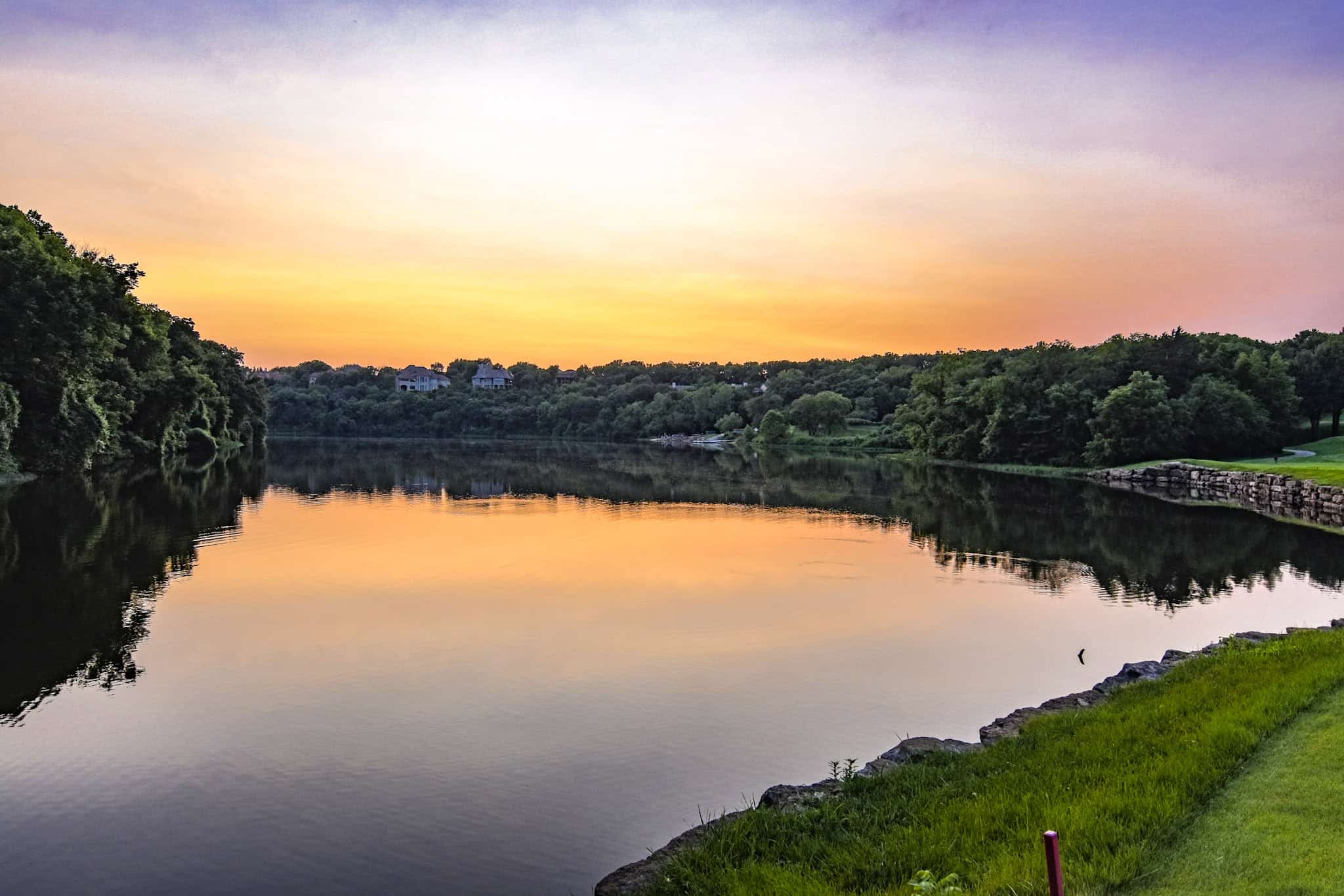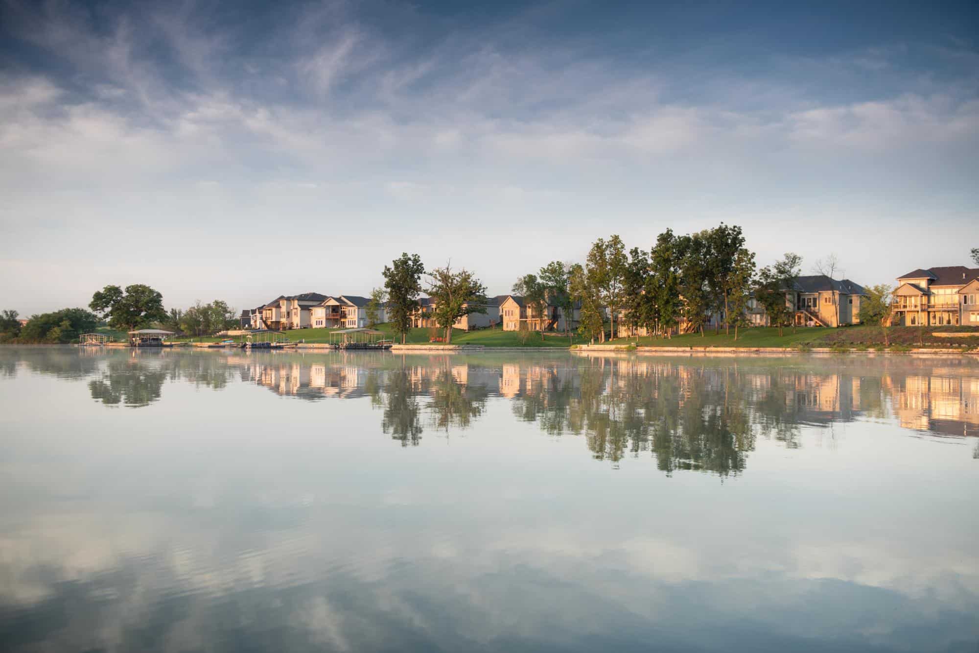 Residents have been enjoying this manmade 125-acre lake in Johnson County, Kansas, since the 1930s. Most homes are lakefront, with gently sloping yards down to the lake. Private docks are allowed.
