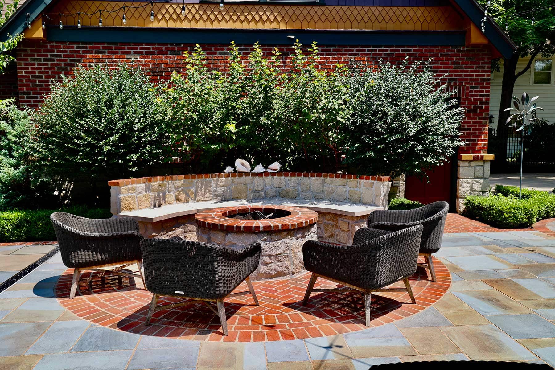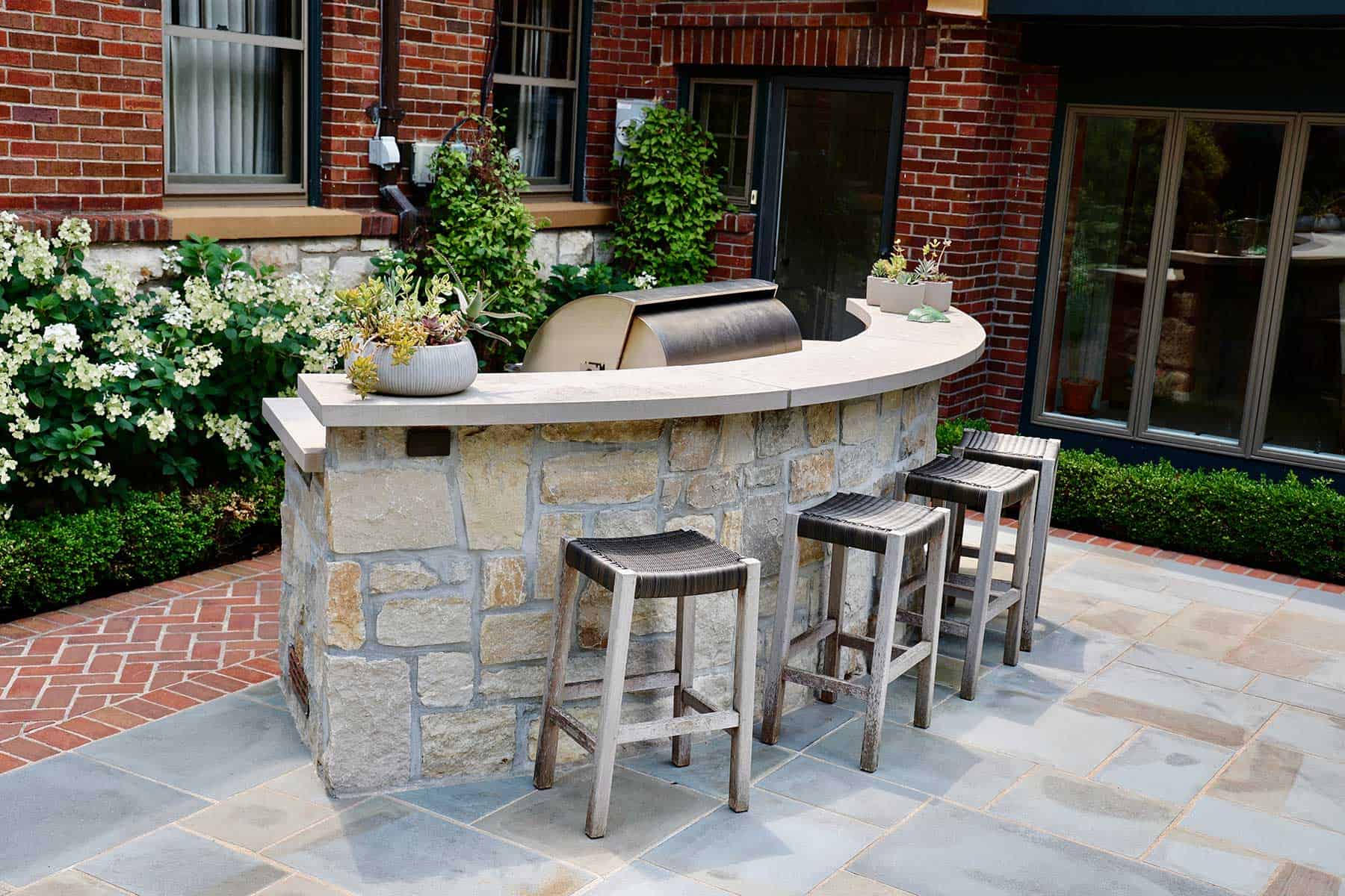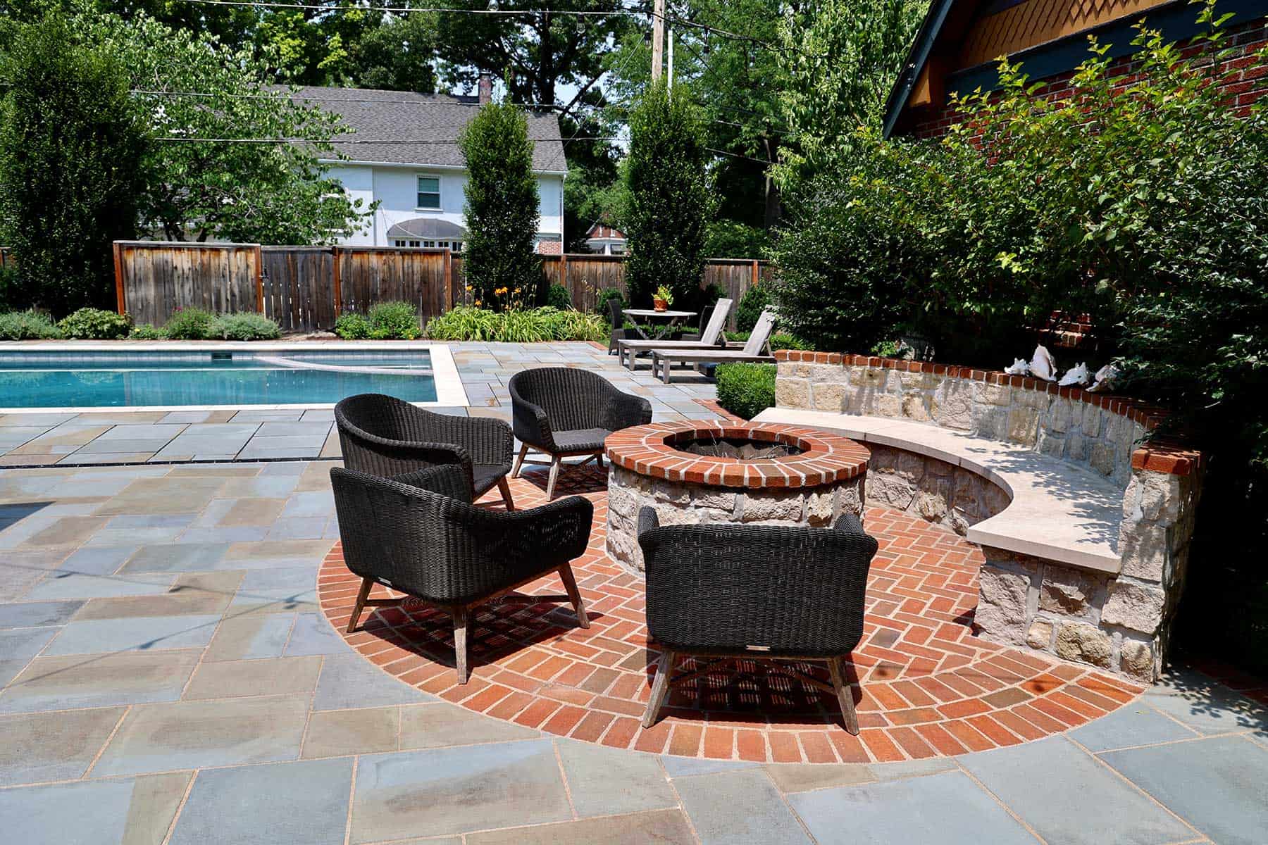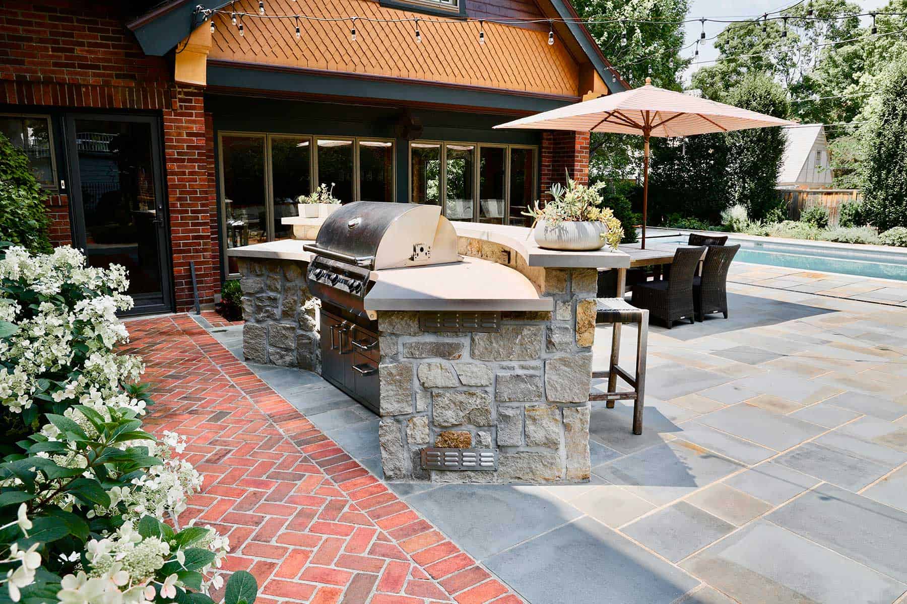 Paving brick, laid in an elegant herringbone pattern, forms the main material palette, while Ashlar bluestone marks transitions with circular motifs that naturally guide movement through the space. Drawing inspiration from the home’s raised stone foundation, Dabner also incorporated limestone touches on features like the grill island and fire pit zone.