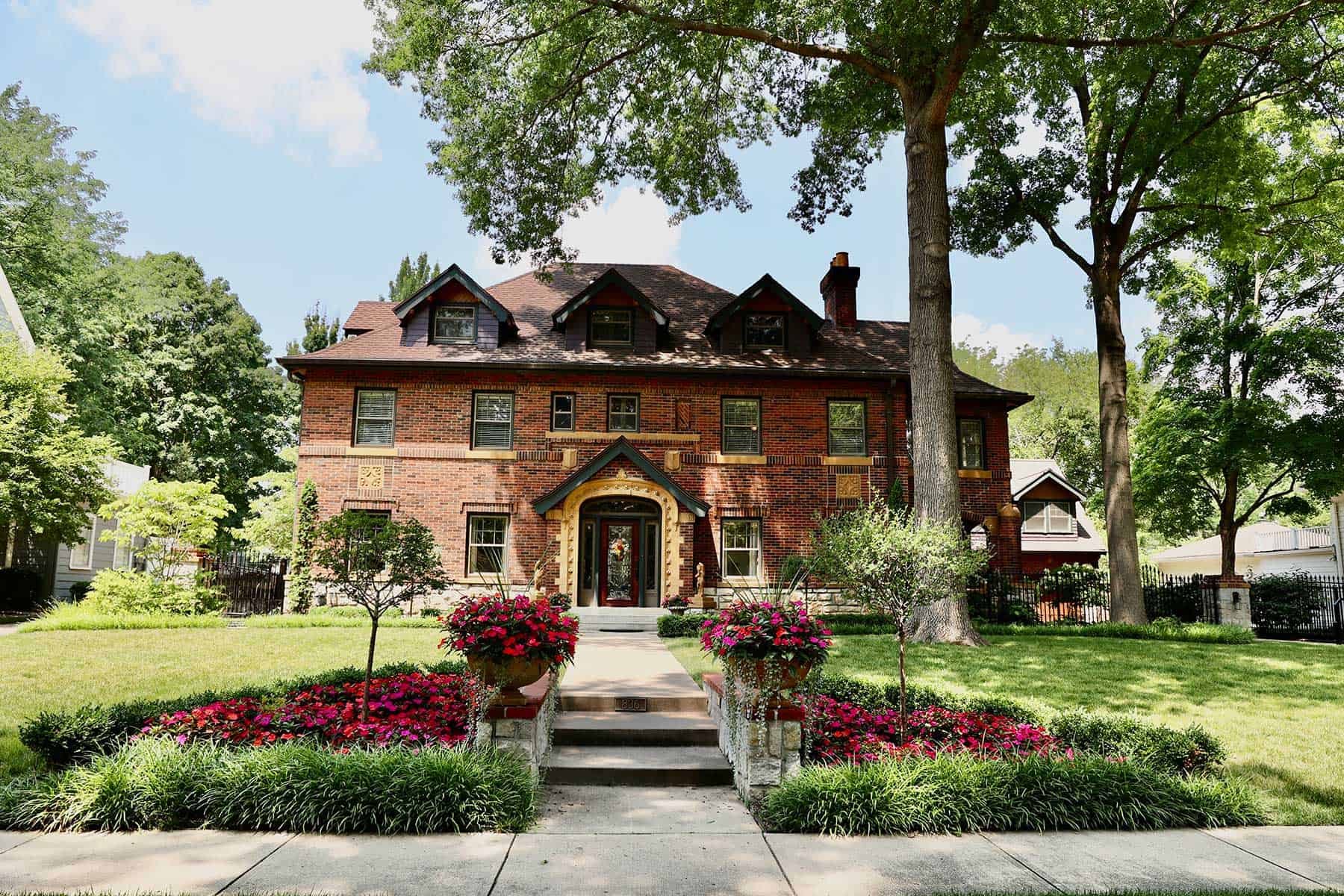 Traditional boxwoods frame the planting beds—a suitable choice for the era of the house and are often employed to add structure and define high-maintenance planting beds.