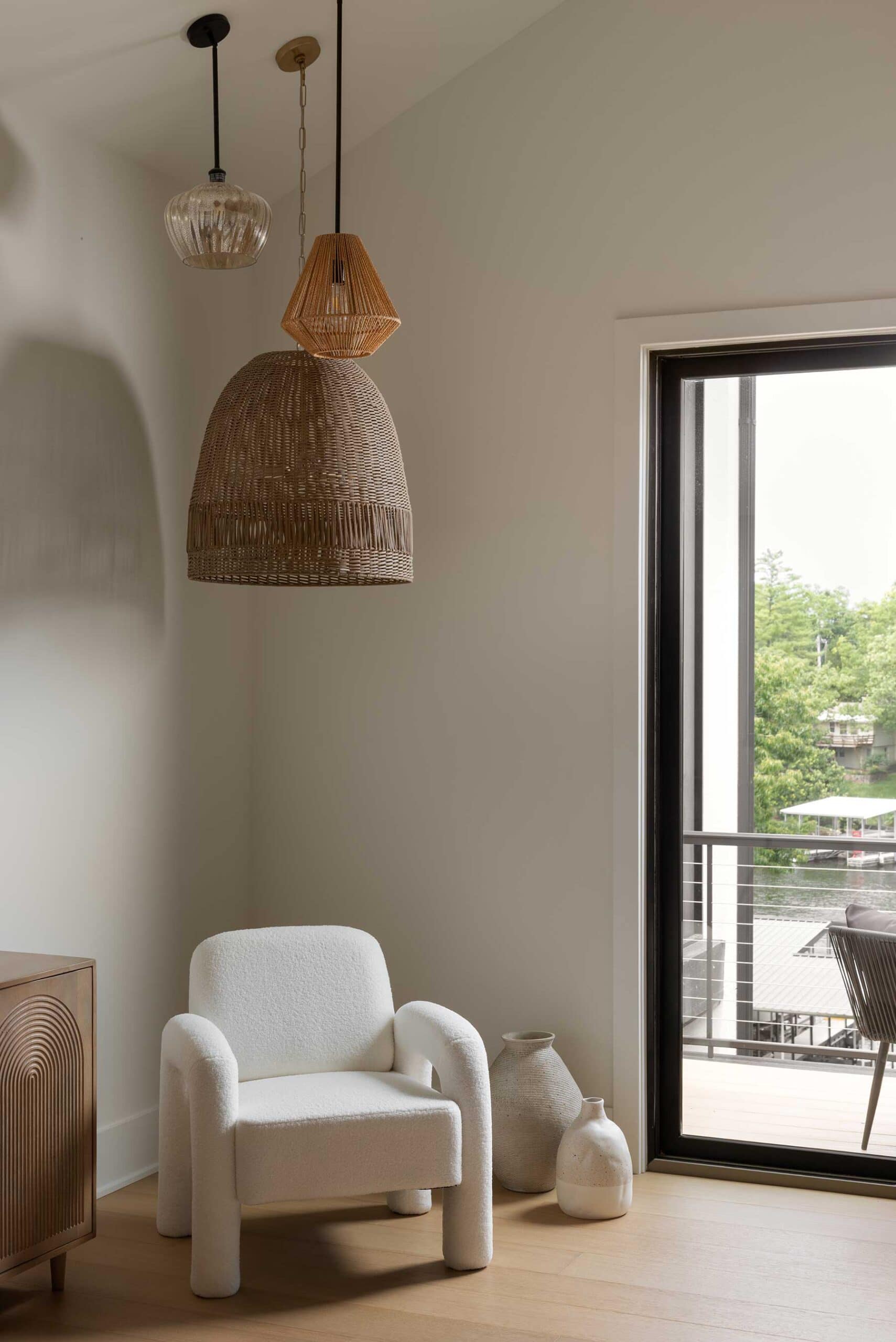 Other textural accents throughout the home include a bathtub nestled in a bed of pebbles, along with a plaster fireplace in the main living area that required a custom installation overseen by Walker and a framer. Natural materials like rattan, wood, and tile add to the uncluttered airiness of the home, creating soothing surroundings that make lakefront relaxation even easier.
