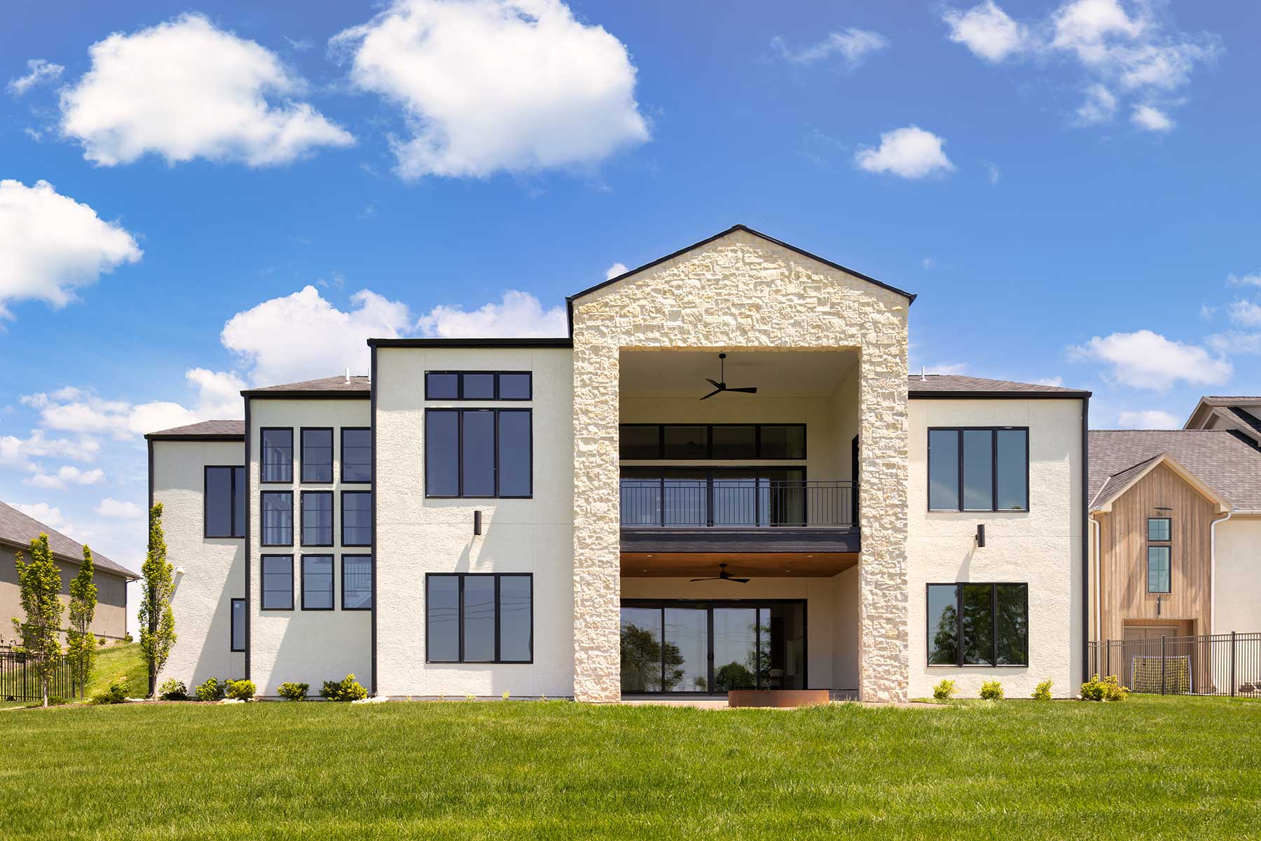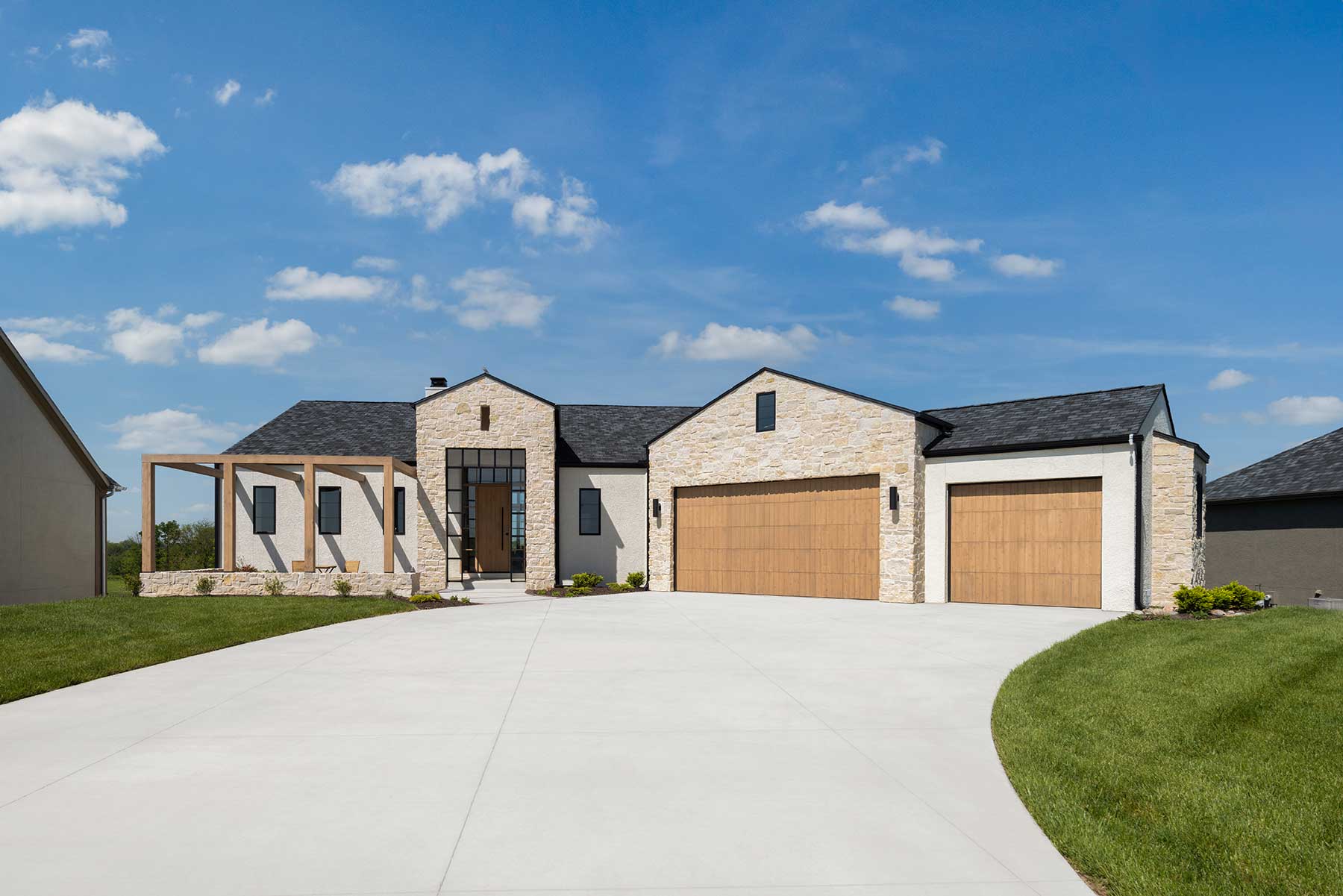 ul-de-sacs and pitched roofs often define the suburban outskirts of Liberty, Missouri, but one house in particular looks more Monterey than Midwest. Its pale limestone, black-framed windows, and stained wood garage doors mark it as California modern transplanted into Missouri soil—proof that warm minimalism can thrive far from the coasts.