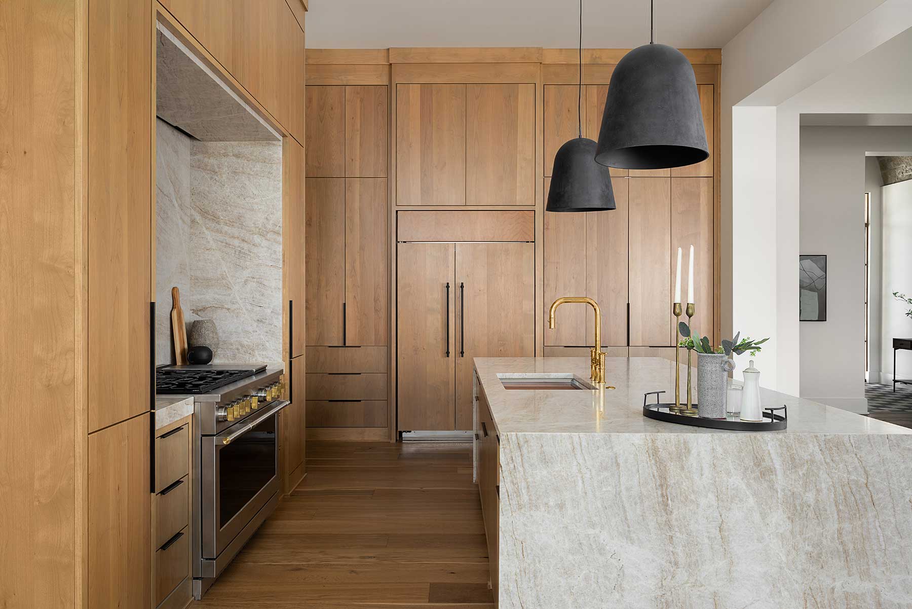 Even the structural details carry a quiet twist. The stained wood garage doors make a striking counterpoint to the limestone. Interior doors, too, are finished in warm wood rather than paint. In a bathroom, tile layouts feature dark tones that climb only three-quarters of the way up, topped with lighter finishes “just different enough to be noticed,” Liz says.