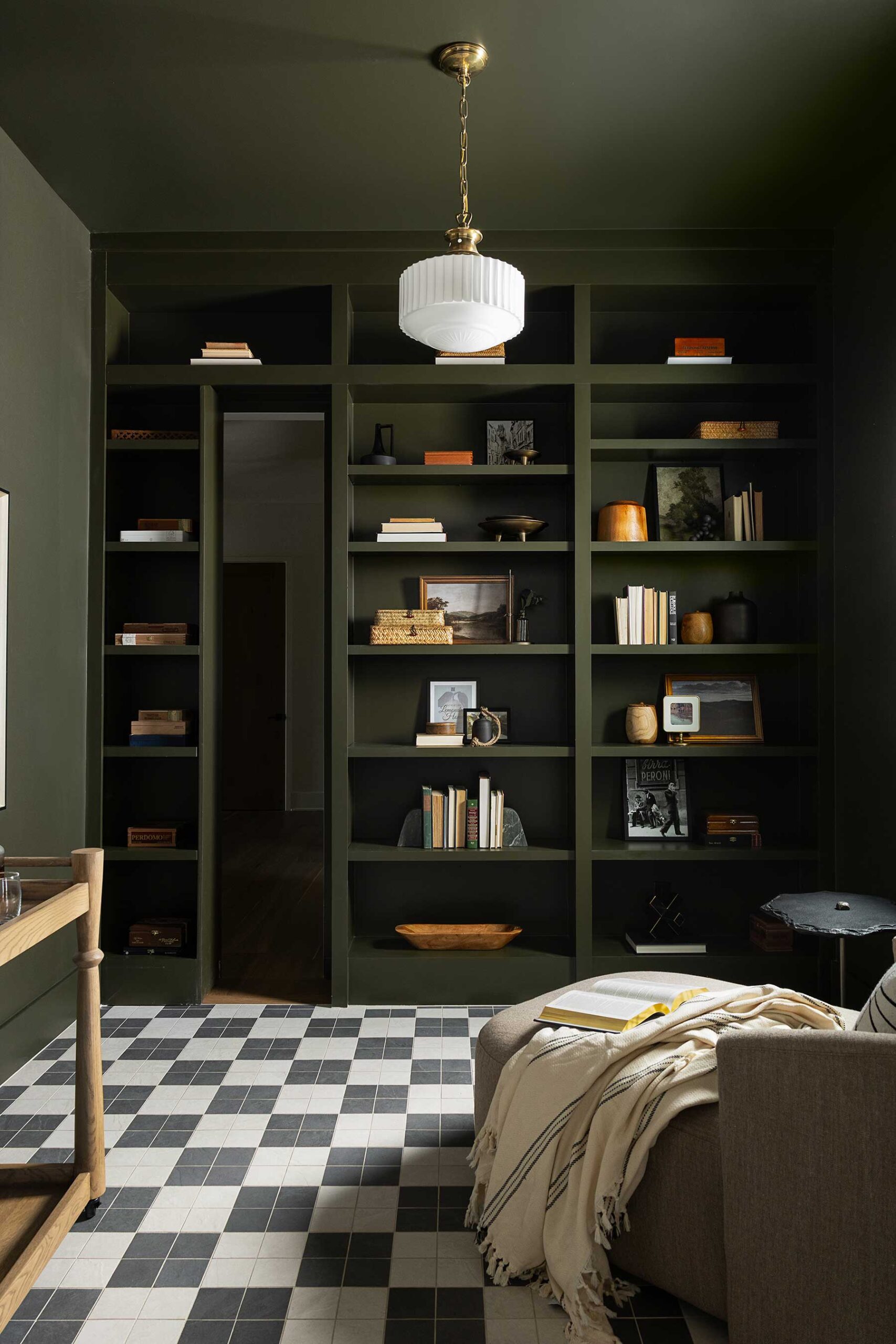 “We didn’t want to cut the wall in half,” he says. “This way the room keeps that expansive, calm feeling.” The cabinets stretch the full 12 feet as well and lift the room with a vertical cohesion that feels grand yet approachable and unfussy.