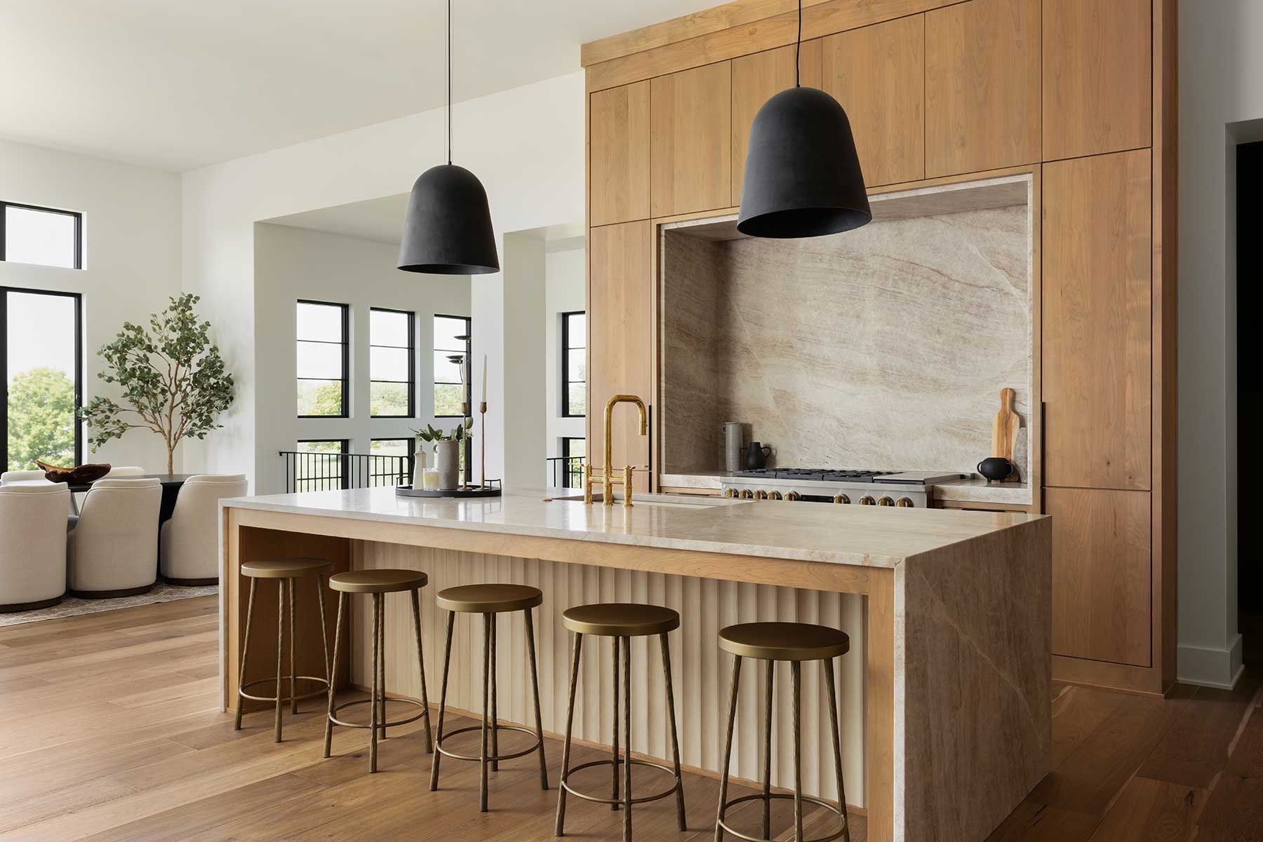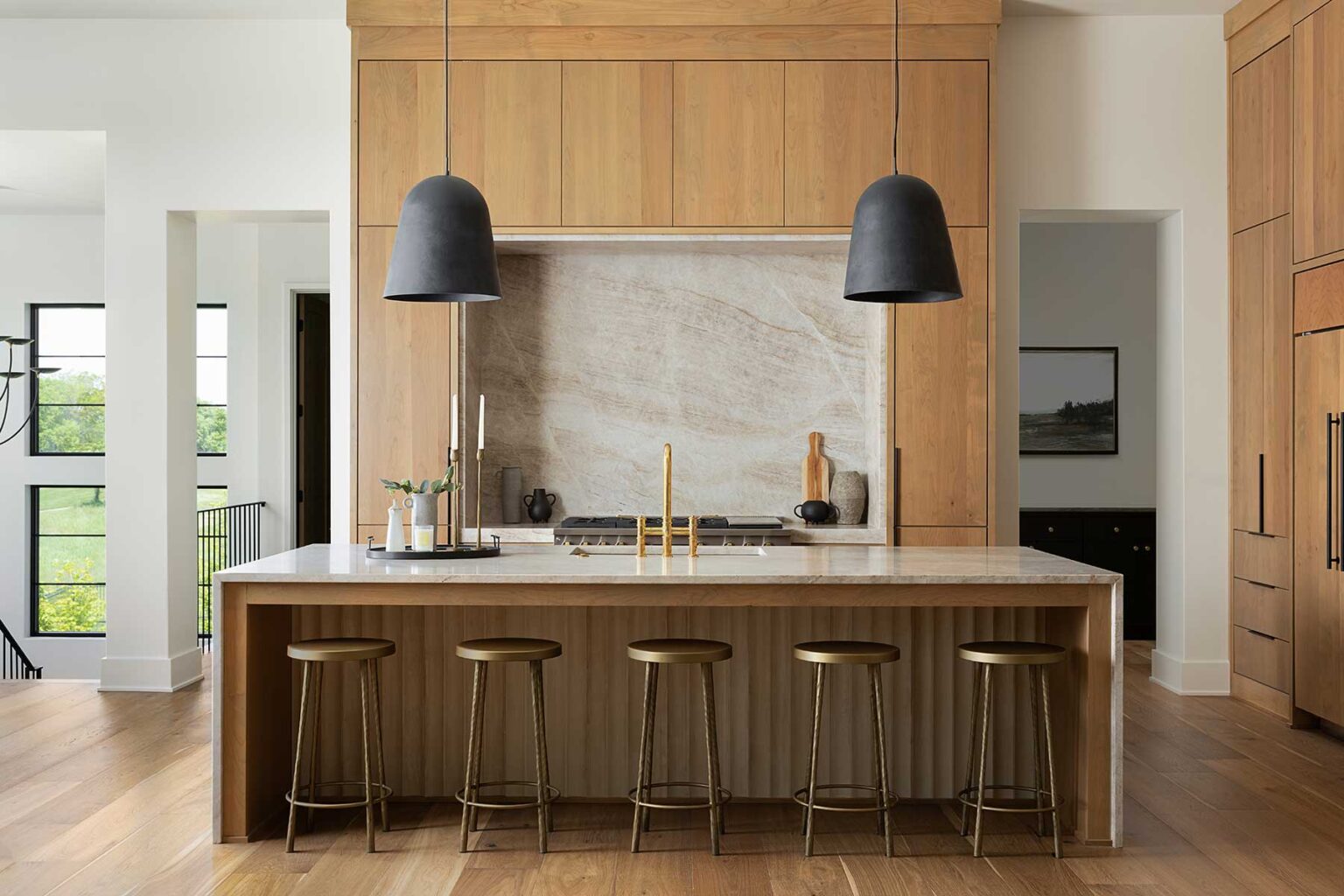 Inside, a barrel-vaulted stone arched entry way opens the home with soaring, 12-foot ceilings that evoke old European wine cellars. In the kitchen, a full-height backsplash—Taj Mahal quartzite for those who track such details—spans uninterrupted from the counters to the ceiling, thanks to a custom exhaust system Kyle engineered to eliminate the need for a standard range hood.
