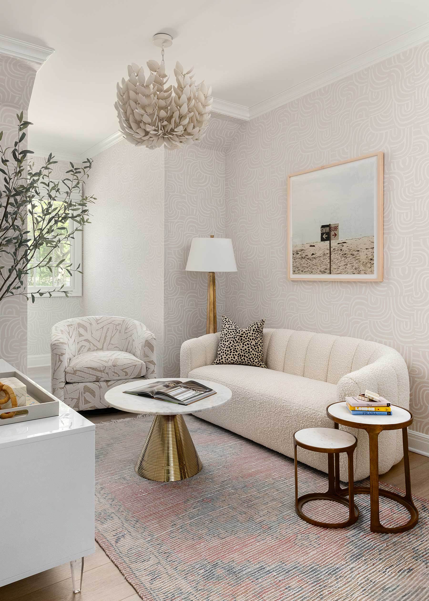 “We wrapped the loft walls in a playful Backdrop for Schumacher wallpaper, layering the room with cheeky art, tactile textures like printed hair on hide and bouclé, touches of gold, plaster, and marble. My favorite element in the space is the Palacek light fixture, which is an artful piece crafted from coconut shells, bringing in that beautiful natural texture. I love how this space feels both creative and cozy for a fun teenage retreat,” Baker says.