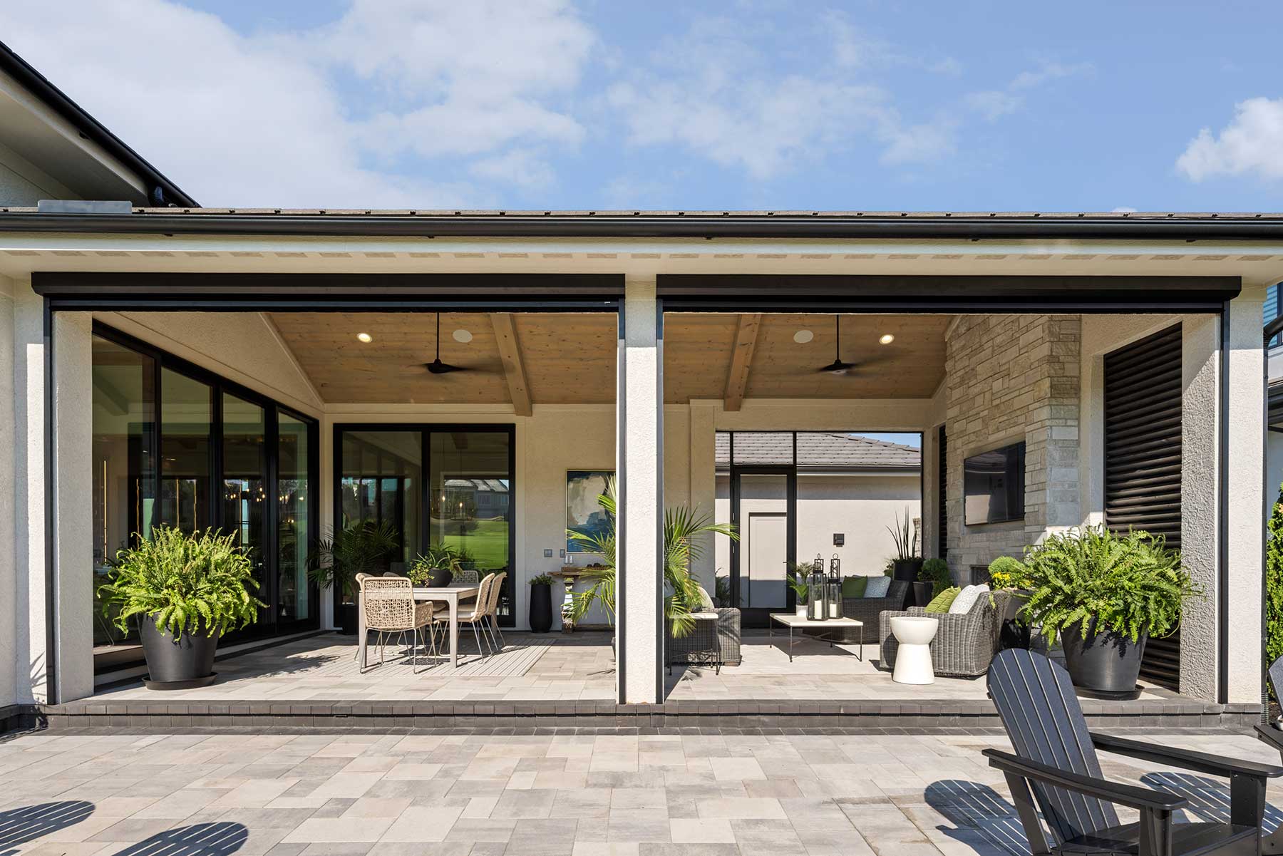 Two sets of slider doors offer multiple access points to the covered patio.