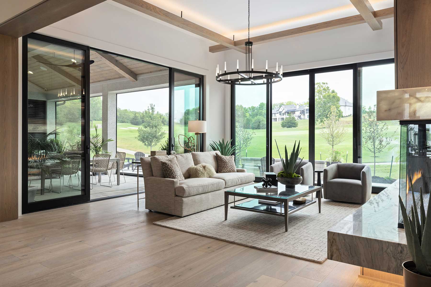 “It opens up to the patio with a linear fire pit and waterfall as a backdrop,” Willis says. And of course, to those amped-up greens, where golfers can gawk while putting by.