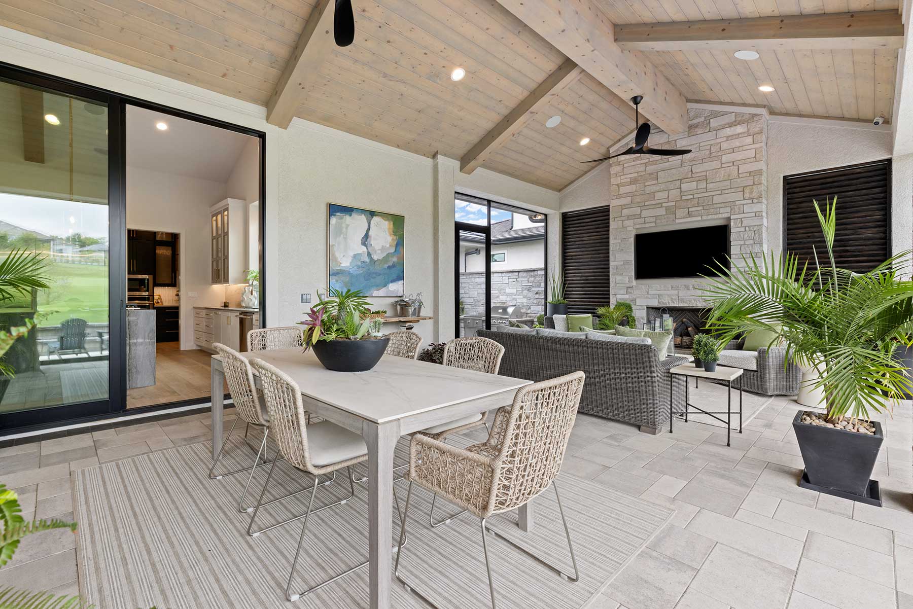 The same tones, comforts and sounds continue outside. Judd’s intent was a biophilic space filled with natural elements, including Kansas limestone, natural-fiber furniture and potted plants. Overhead, outdoor-grade wood is stained in the same ashy tone as the living room, while on the floor, travertine tiles create a seamless transition from the covered space to the uncovered patio.