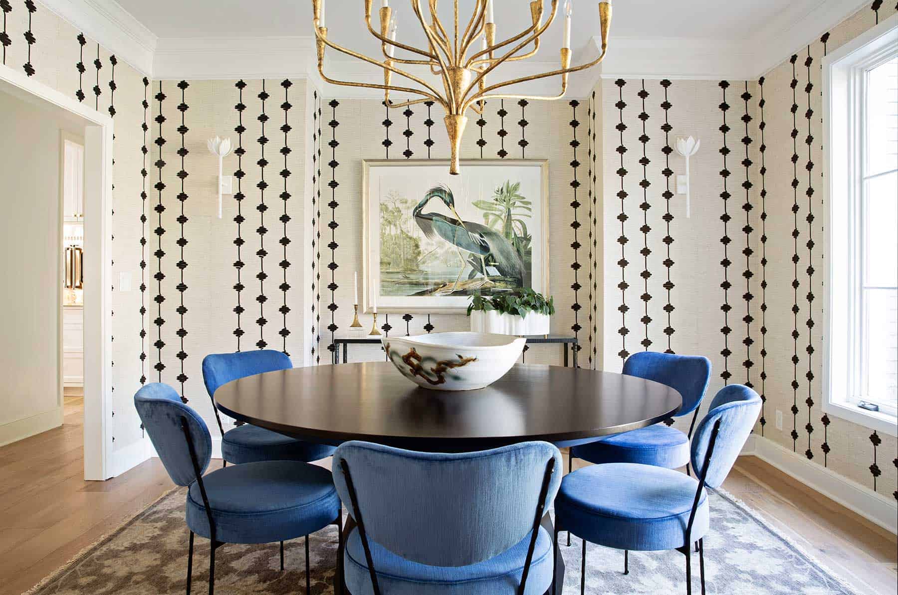 A few steps away is a newly created flex room that serves as Josh’s office by day and a poker room for him and his buddies by night. It can easily transform into a guest room with a full bath and a wall unit accommodating a slide-in bed. Josh brought in curated collectibles and found the large classic painting at auction, making the space a real reflection of him. A nearby small powder room—designed with statement-making wallpaper and a stunning, custom marble vanity—winds full circle toward the front hallway, conveniently tucked between the back stairwell and mudroom on one end and the dining room on the other. A chic mix of furnishings, standout lighting and specially embroidered wallpaper give the dining room a glamorous feel and major wow factor, impressing guests as it opens up to the entrance hall across from the music room.