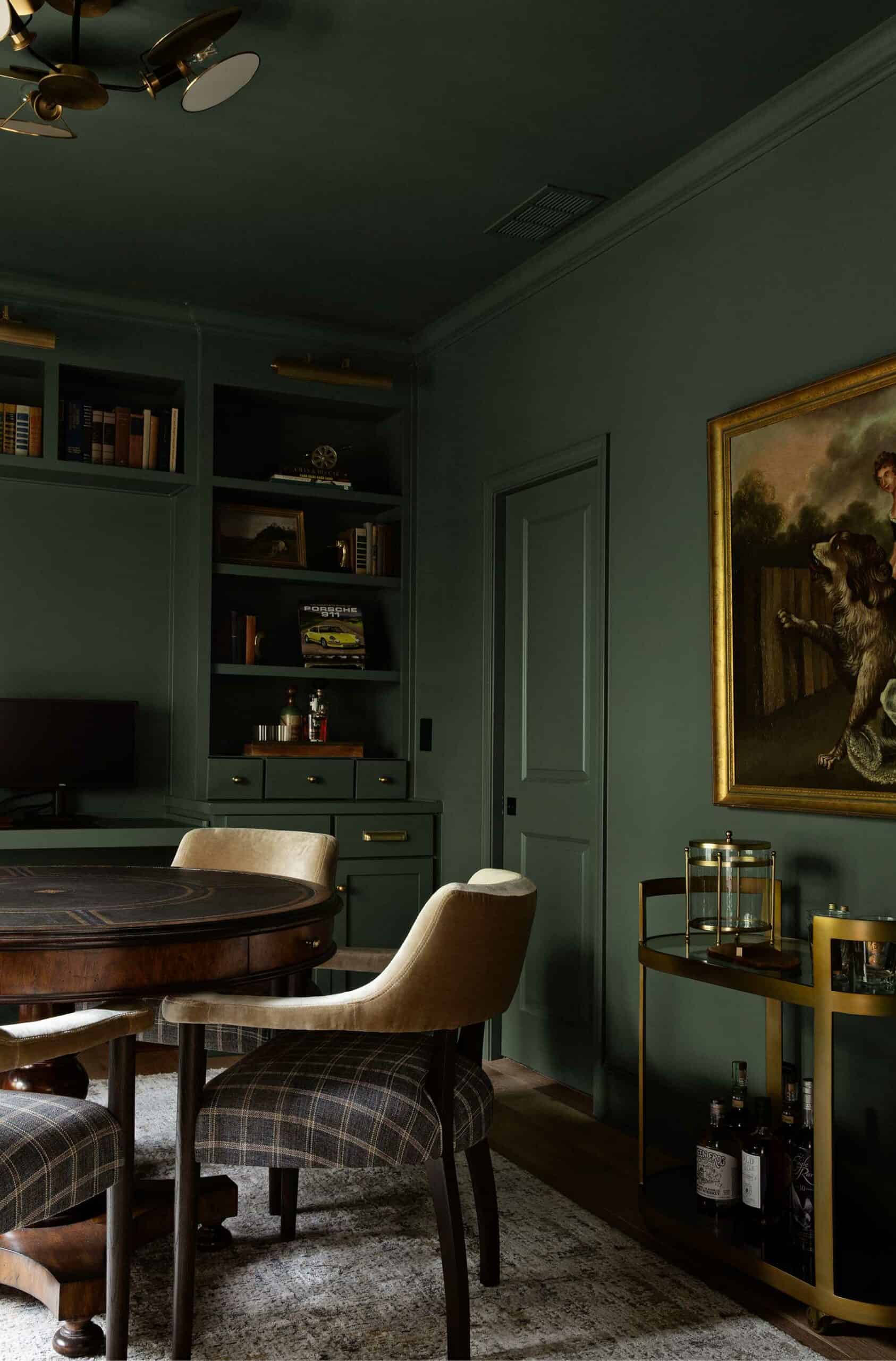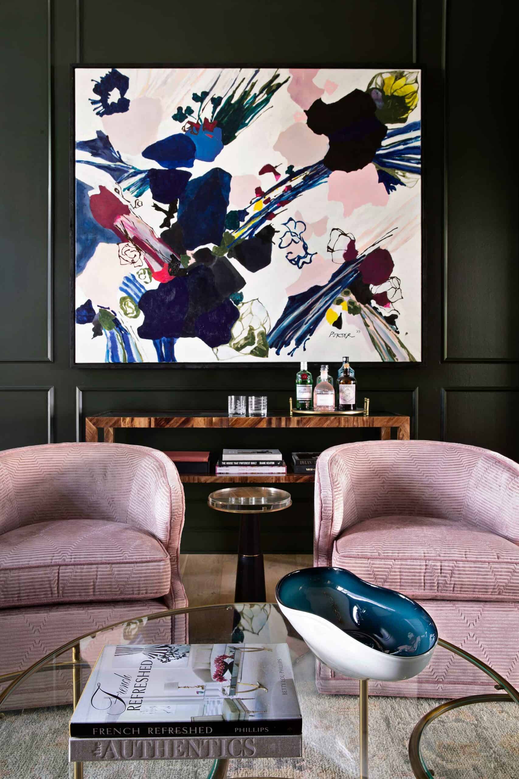 The alluring music room, located to the left of the entry, beckons visitors with its rich, dark-colored walls and shiny black grand piano. It exudes sophistication with cozy velvet seating, custom-built cabinets and a vibrant contemporary painting. The new cabinetry accommodates a bar on one side of French doors and a turntable and LP vinyl records on the other. However, the room perfectly serves two purposes, which is a testament to the designers’ clever problem-solving.