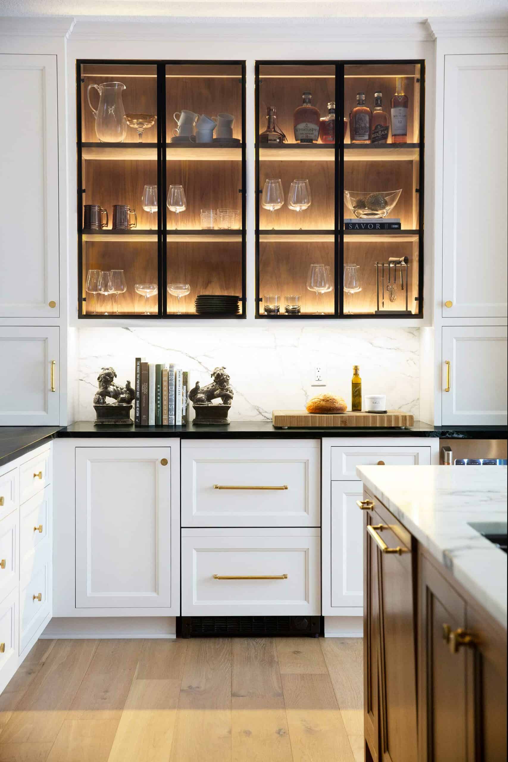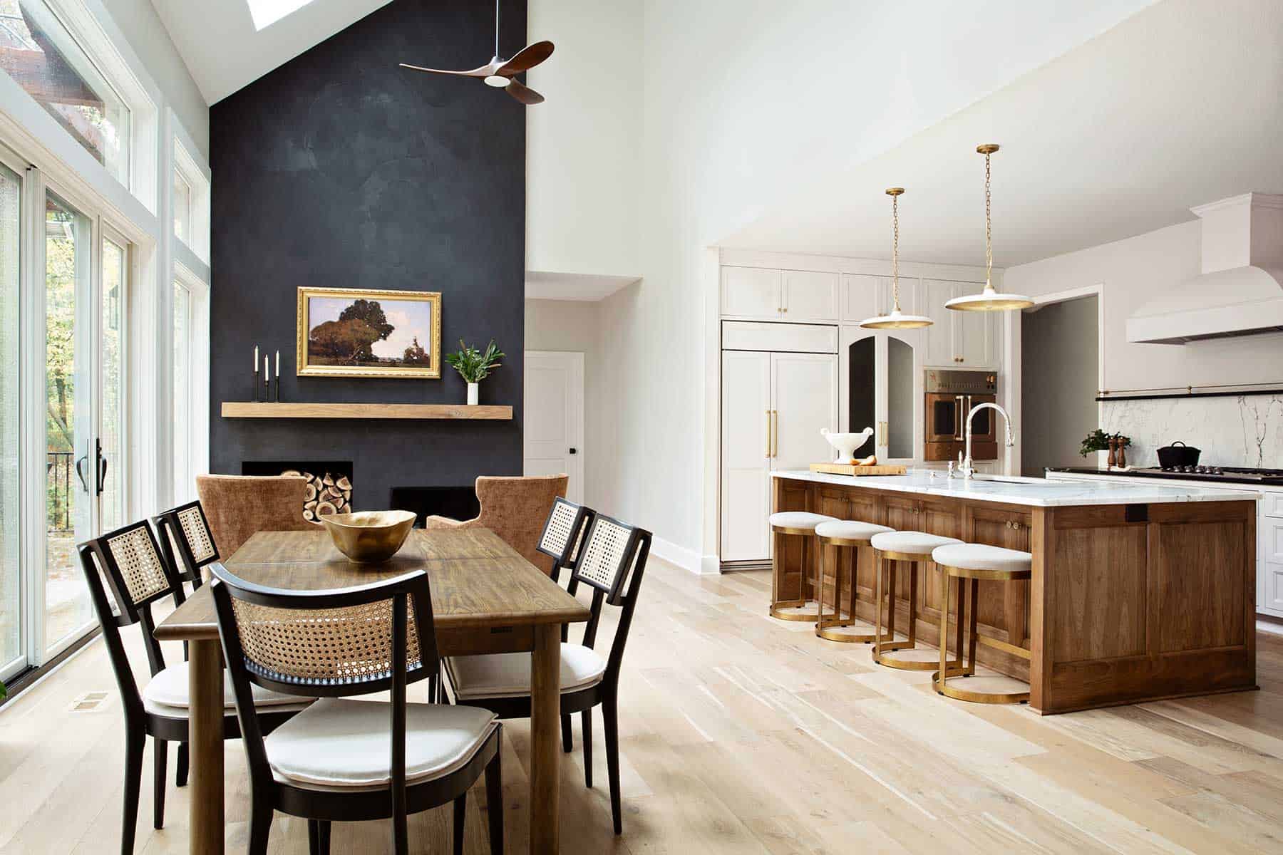 Because the living room flows into the hearth room and kitchen, the design team put extensive thought into modernization, detail, tone and texture, creating a sense of cohesion that is reserved yet elegant. They also incorporated high-quality surfaces and furnishings throughout. For example, the hearth room was pared back to showcase its newly plastered black wall as the key design element within the space.
