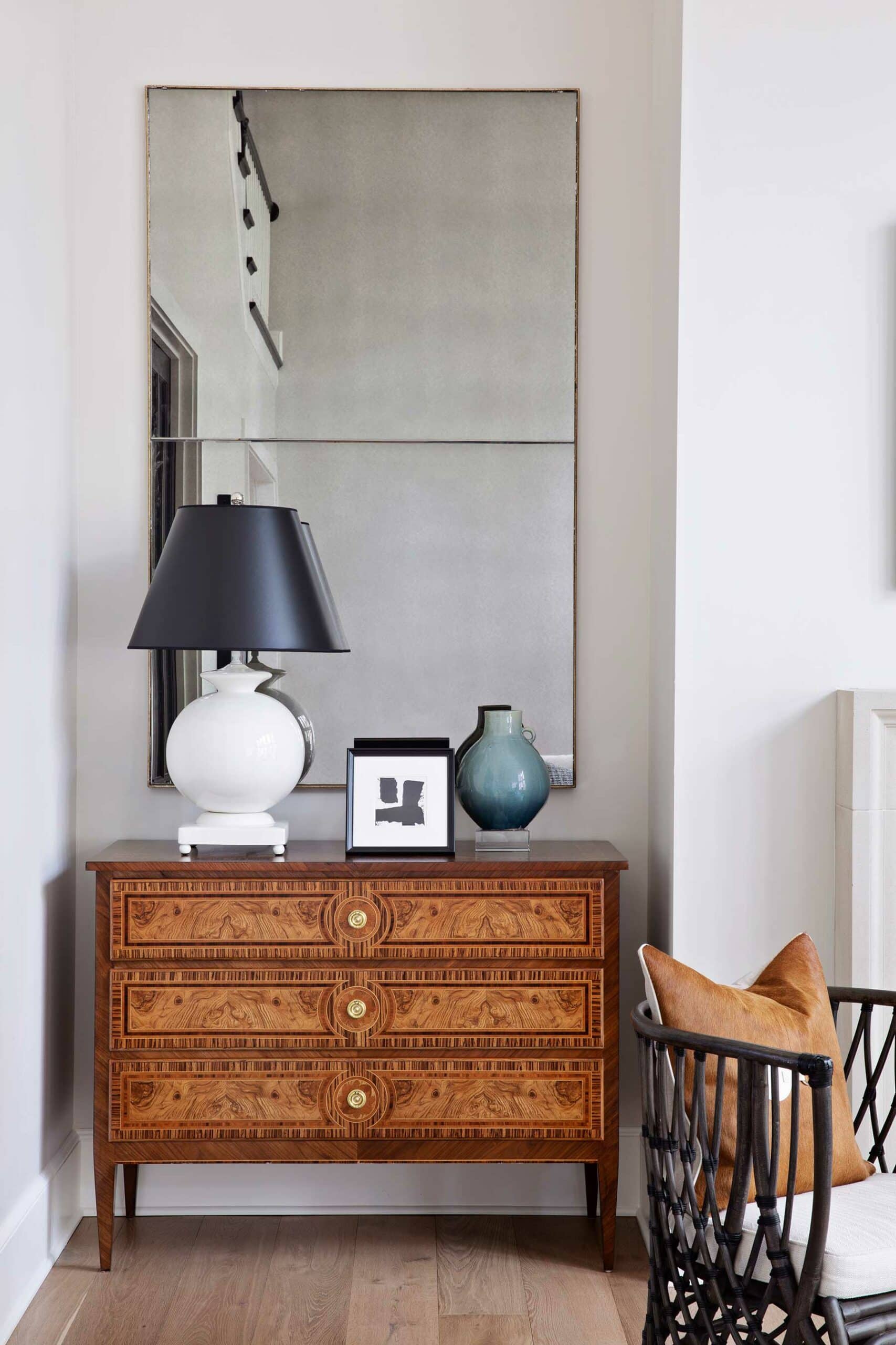 Upstairs, the relaxing redesign of the primary bedroom—replenished with customized furnishings—carries over into the renovated primary bath, to which the designers also gave bespoke treatment. Each element was thoughtfully considered, including the tiled floor pattern that emulates a throw rug, adding interest to the elongated space.
