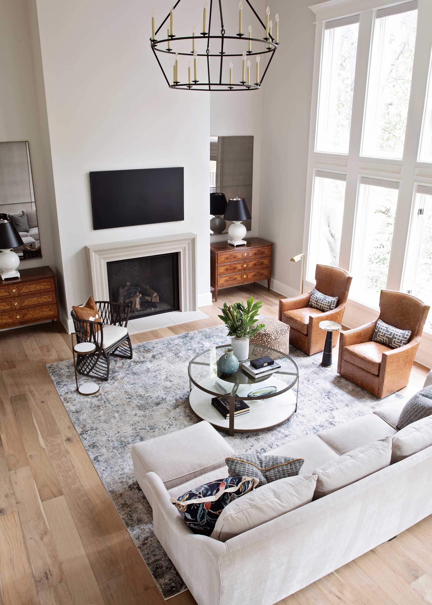 Beyond the musical alcove, an impressively airy, grand-scale living room boasts two stories of floor-to-ceiling windows. The designers conceived a more modern space by removing the grandiose woodwork extending to the ceiling above the fireplace. They also eliminated the adjacent wall’s lit-up nooks and built-in cabinets in favor of a brand-new, custom-designed modern fireplace.