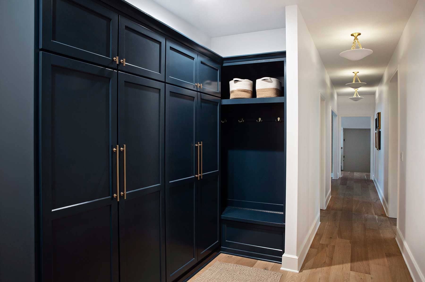 Stephanie brought in Jim Kostusik, the owner of Redstone Homes, as the contractor. Nearly the entire main floor had to be taken down to the studs to reconfigure the interior spaces. Once they were working with a blank slate, the designers’ first step toward modernization was to unify the flooring with light-toned hardwoods installed throughout the home. They then stripped the entryway of distracting wallpaper, replacing it with attractive, floor-to-ceiling wainscoting. Other outdated features—such as the contrived wood detailing and the arched windows above the entrance and flanking coat closets—were also removed. To elevate the entry, the designers created discreet pocket doors for the closets and turned the single front door into paned double doors, adding the perfect touch of modern elegance to the large space.