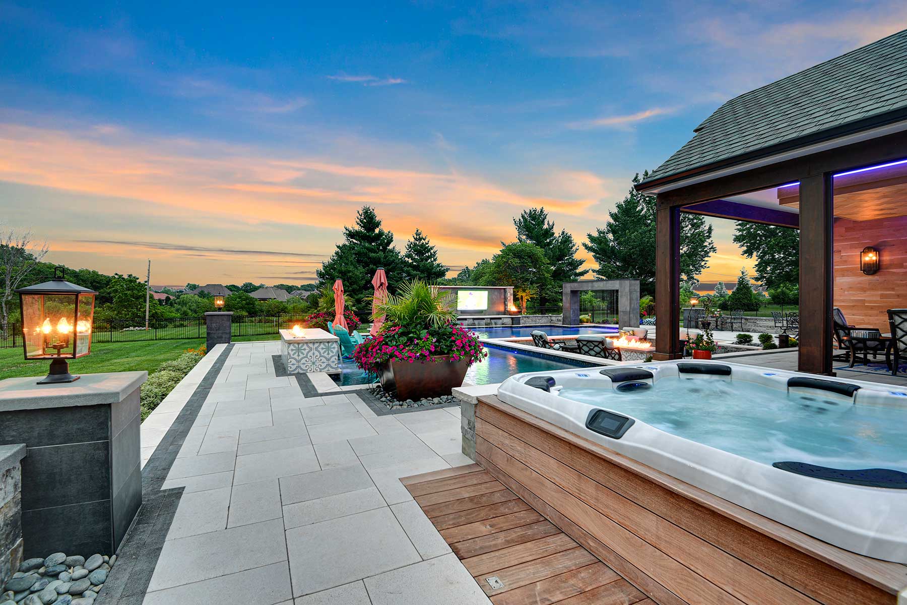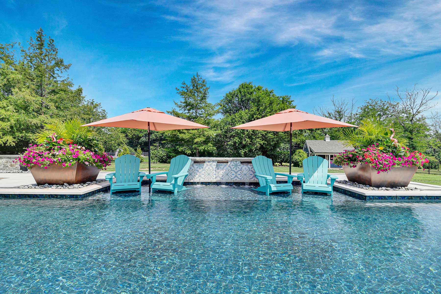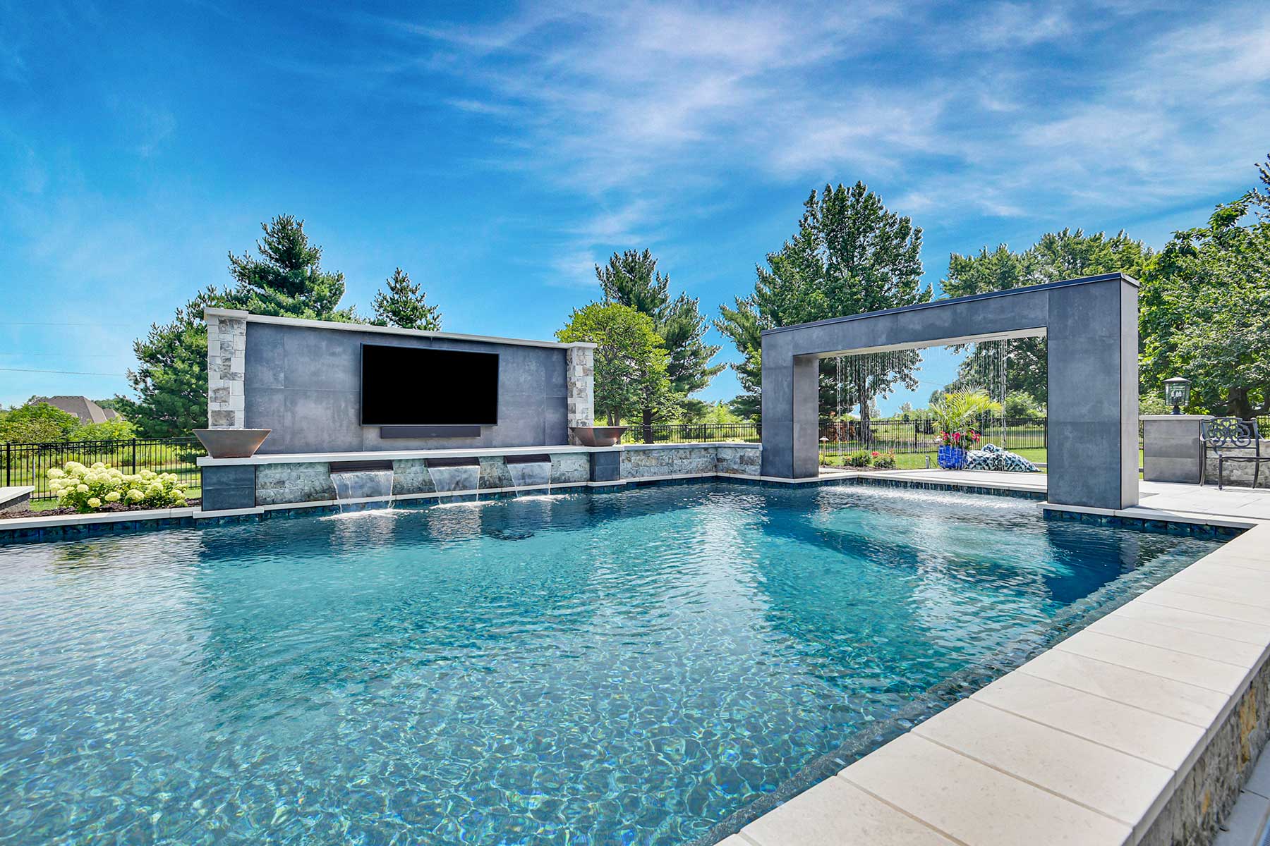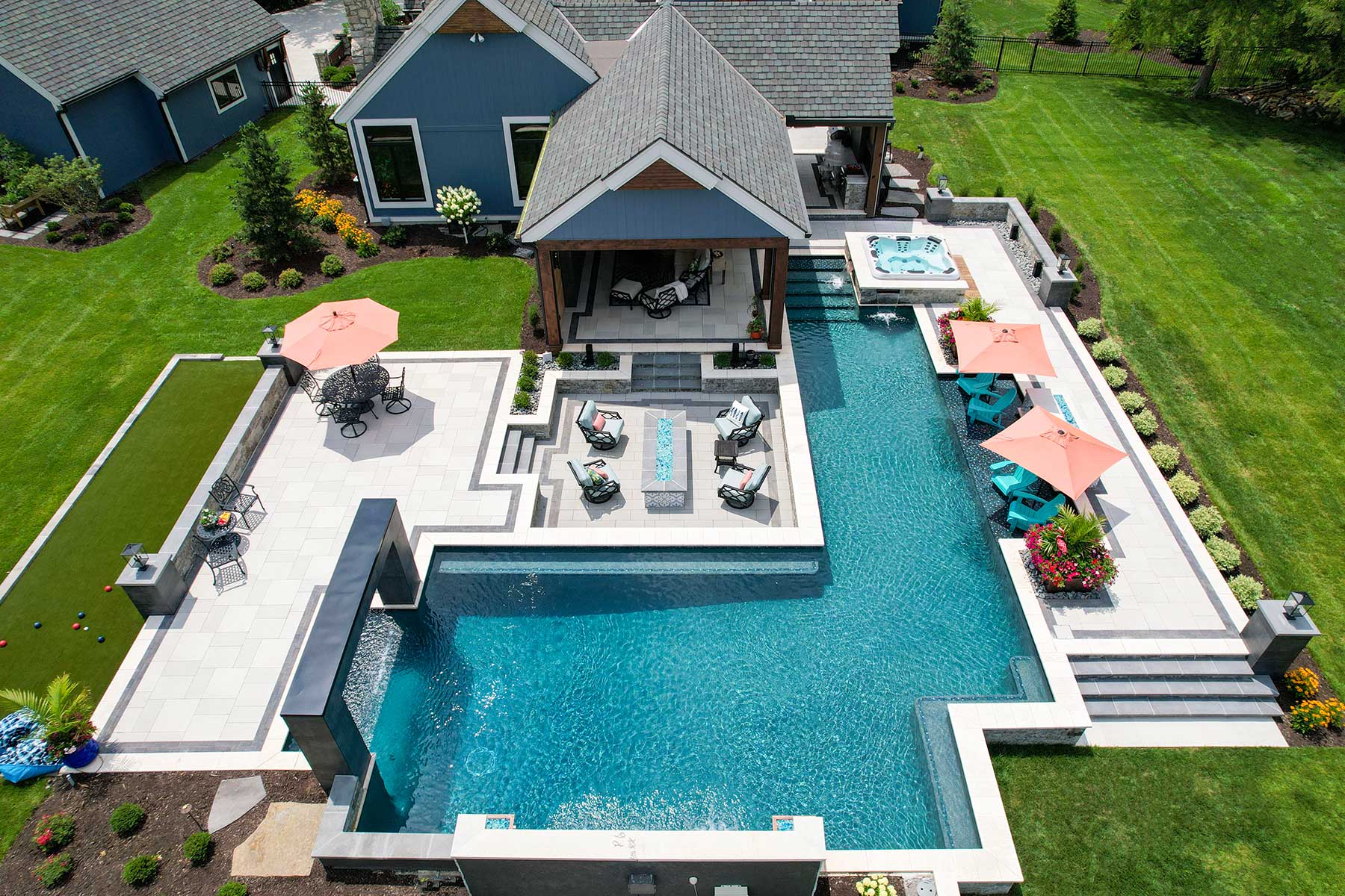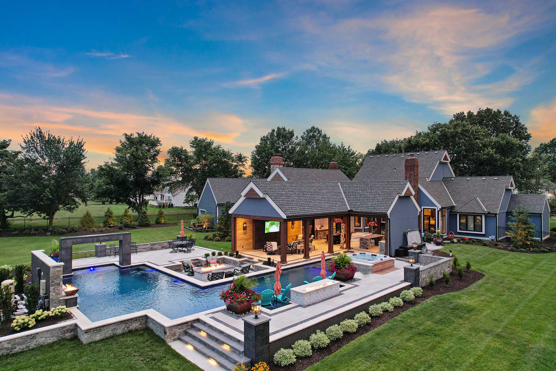 The lap lane then opens up into a second, larger rectangle-shaped pool with a prominent backdrop that incorporates an outdoor TV, three waterfalls and two copper fire bowls. Everyone loves to float there at night watching Royals games.