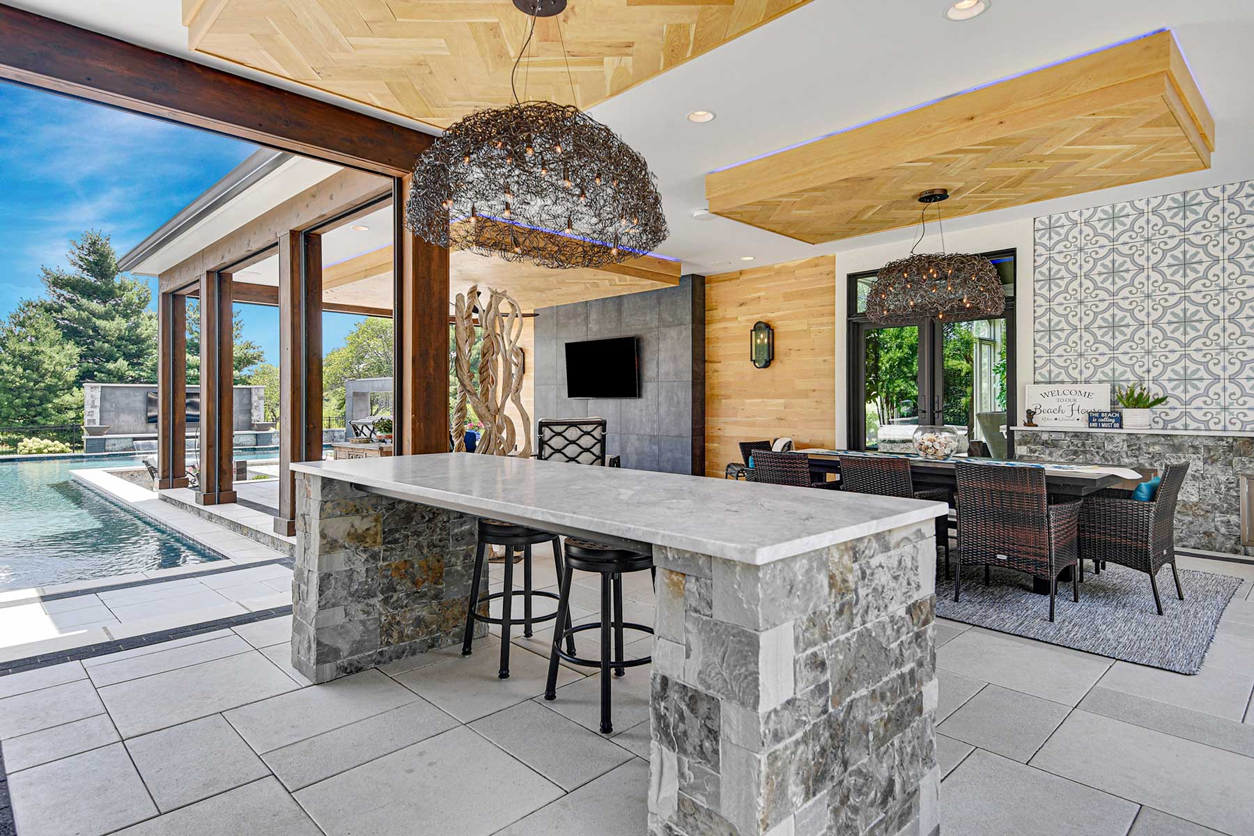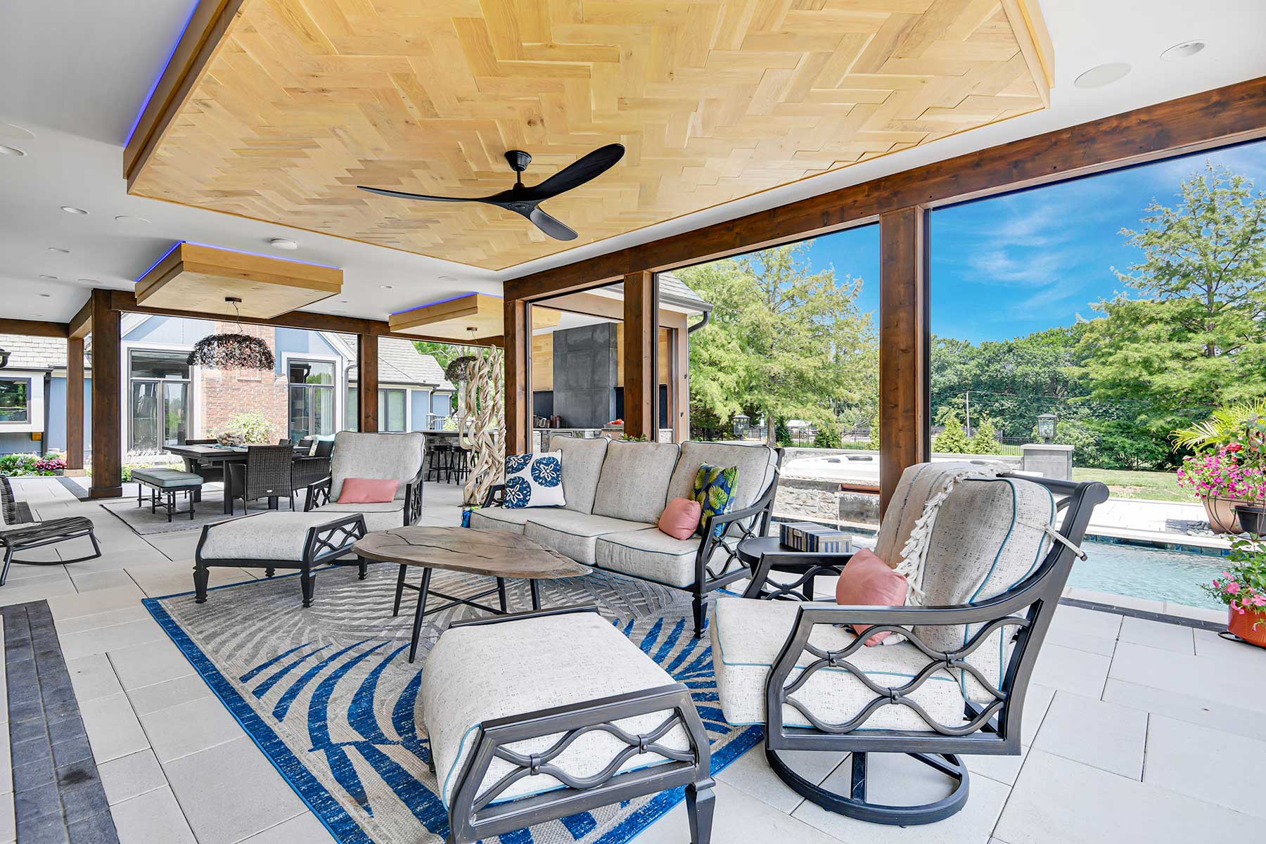 Another sticking point Higgins wanted to get just right was the cabana. The best design stemmed from this covered outdoor space attached directly to the living room, allowing family and friends to flow outside no matter the weather. Just as important, the cabana provides a visual block of the neighbor’s house and pool, offering privacy.