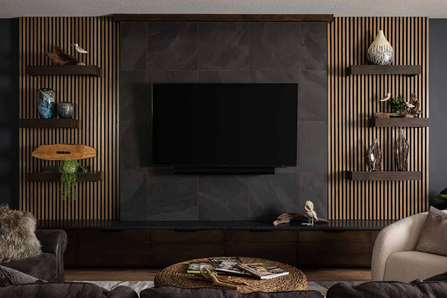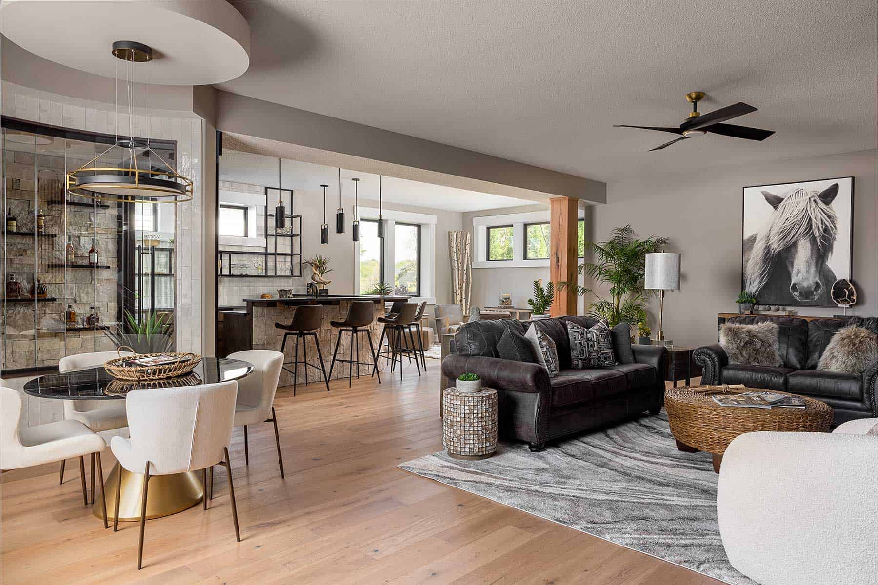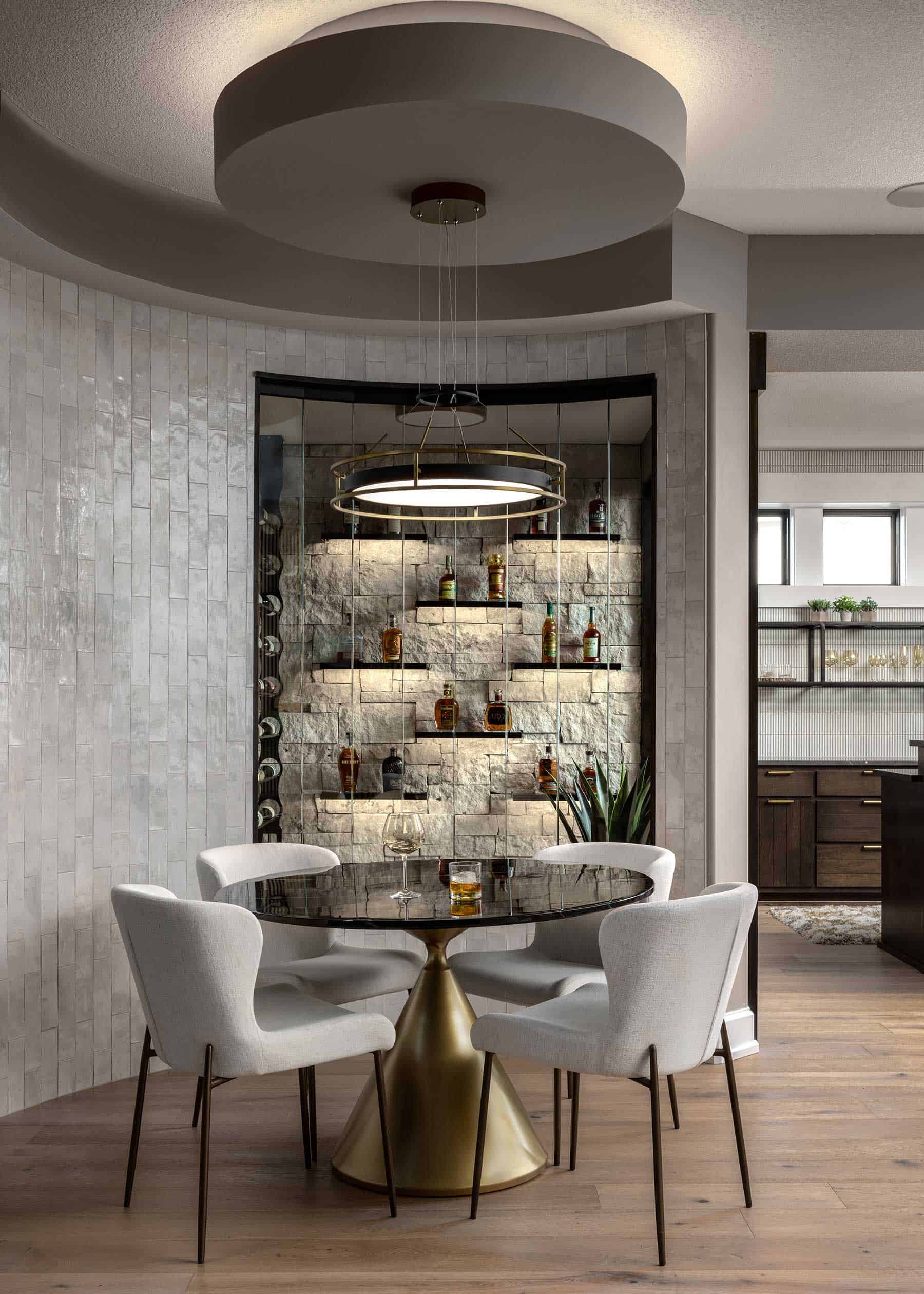 The lower level continues this intentional layering through texture, geometry, light, and a few hidden gems. A rounded wall of vertical glass panels frames the game niche, guiding visitors into a whiskey-and-wine room outfitted with floating iron shelves, custom wine racks, and subtle libation-themed details revealed only at certain angles—a playful addition by iron artisan Jack Brock. A comfy barside lounge and adjacent theater are anchored by individually cut and painted wood slats, adding dimensional warmth. Triple picture windows flood the space with daylight, while ceiling accents, uplighting, and repeating geometric motifs ensure cohesion.