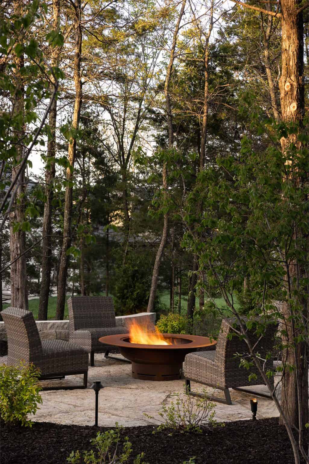 “We nestled [the outdoor living space] into the trees and natural setting of the lot,” Bruce says, adding that trimmed up and thinned out trees made way for the design.