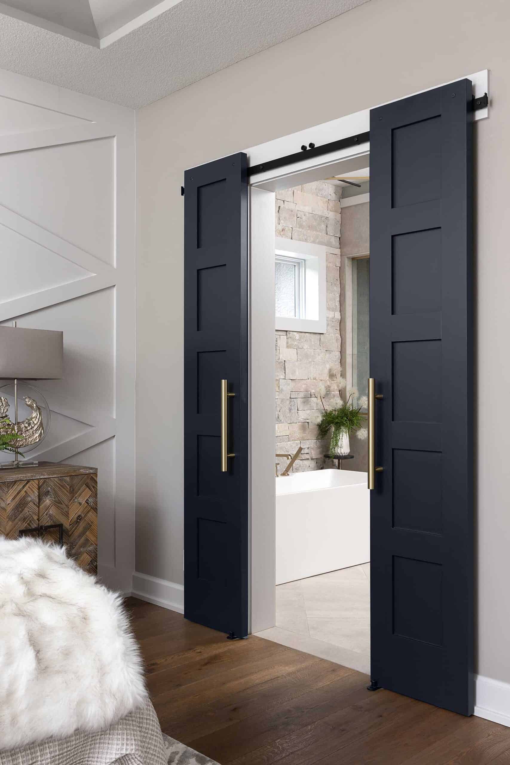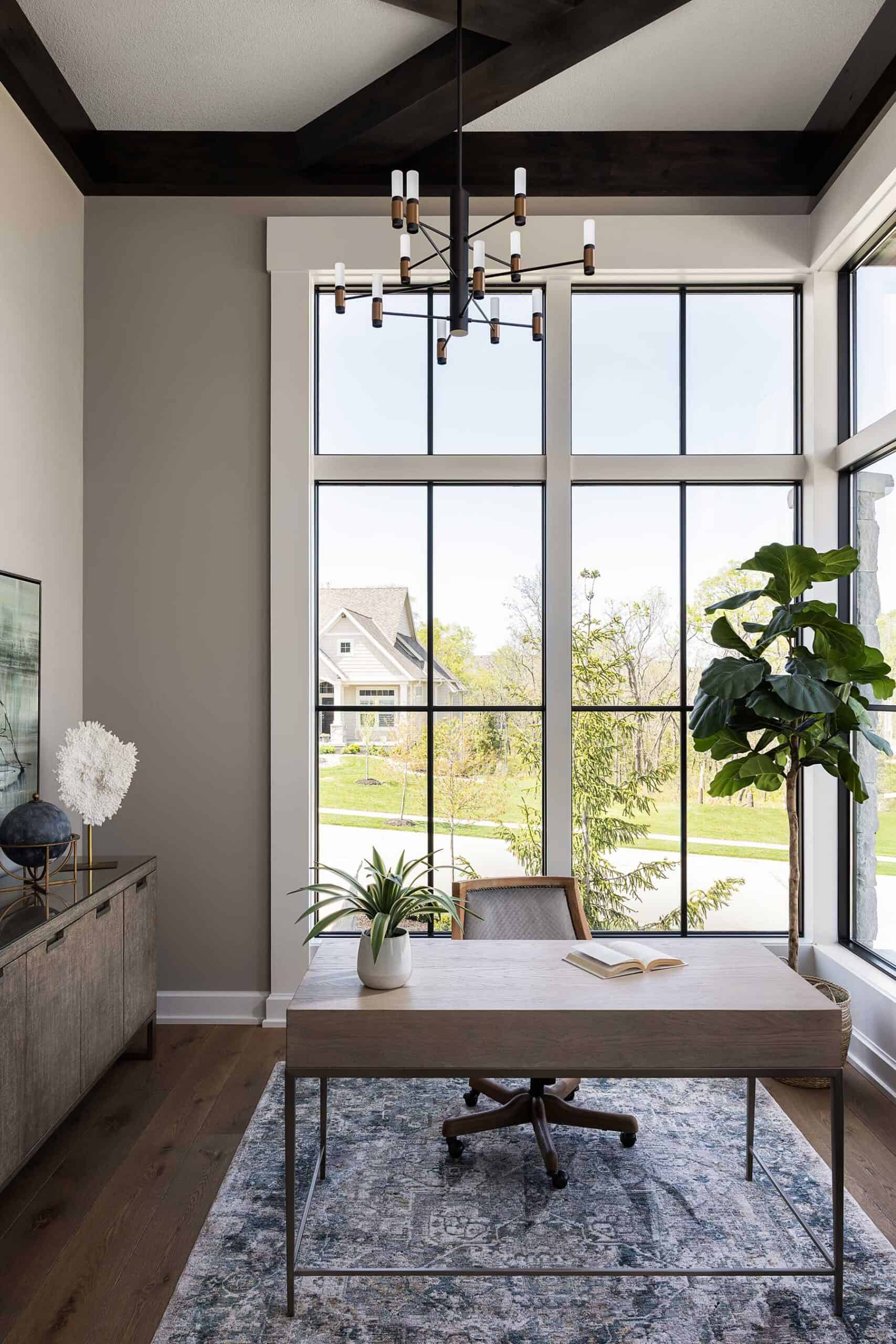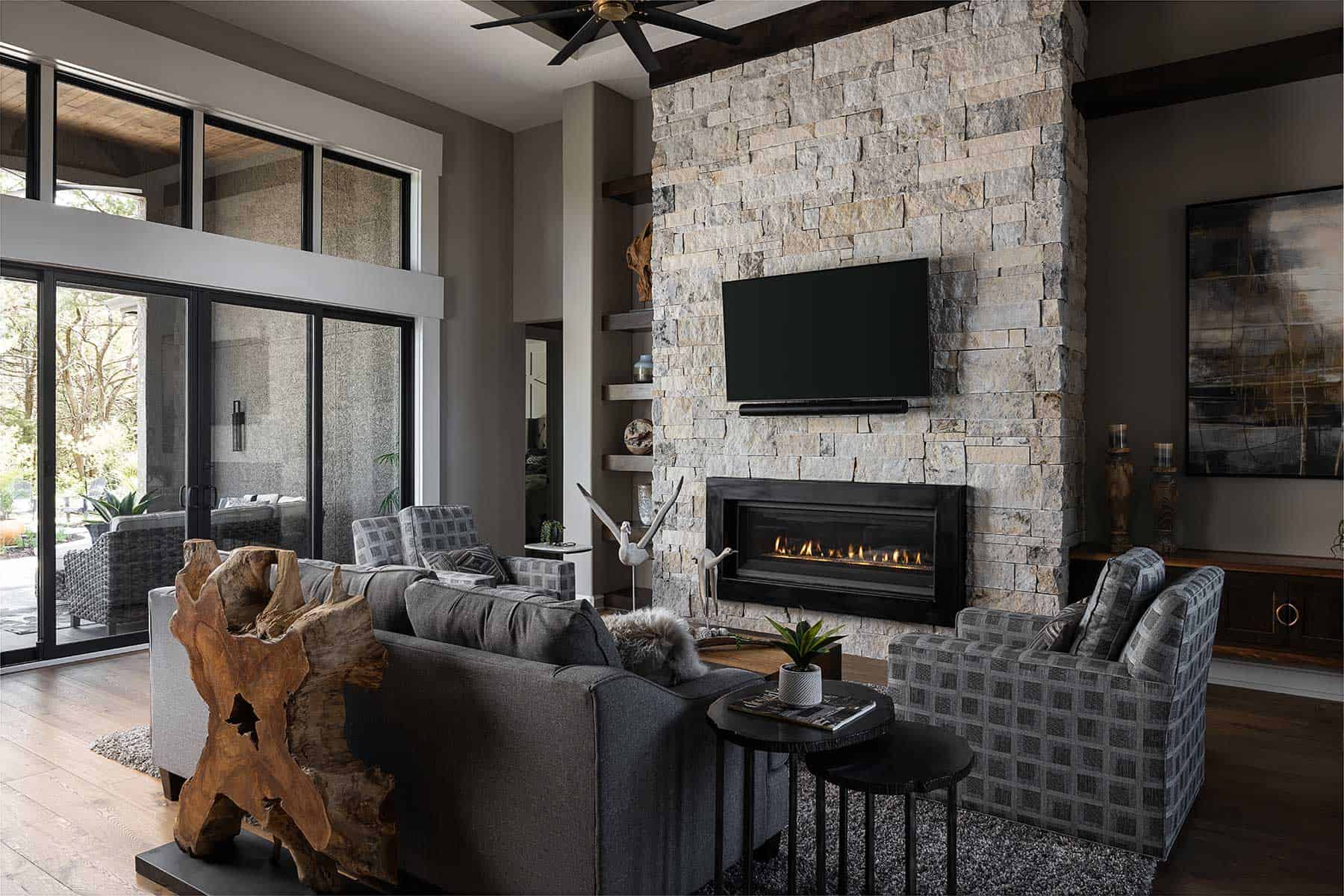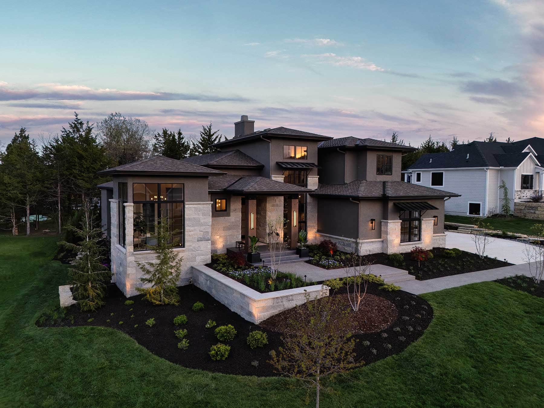 Drawing inspiration from Texas Hill Country architecture with a touch of Frank Lloyd Wright, the Pensacola’s exterior pairs native Kansas limestone and hand-scraped timber posts accented by custom iron brackets with expansive black-framed Andersen windows and signature metal awnings. Oversized soffits and a low-pitched roofline introduce geometry and proportion, while the interplay of stone, wood, metal, and glass strikes a balance between natural and contemporary.
