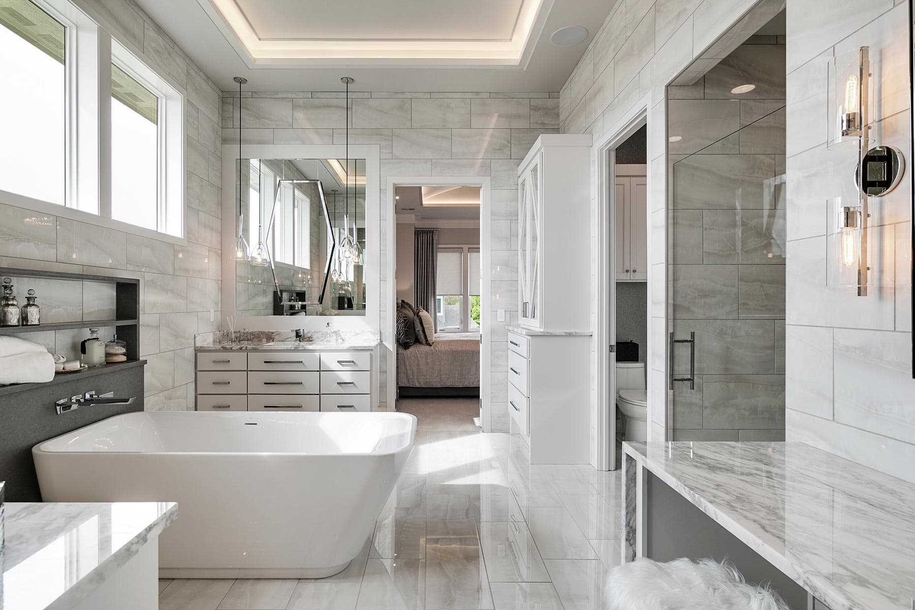 After an evening entertaining in the main living-dining space, homeowners can escape to the primary suite, where a centered soaking tub is fit for an upscale boutique hotel. Floor-to-ceiling tile, floating quartzite vanities, and wallpaper silvered with mica create a monochromatic shimmer.