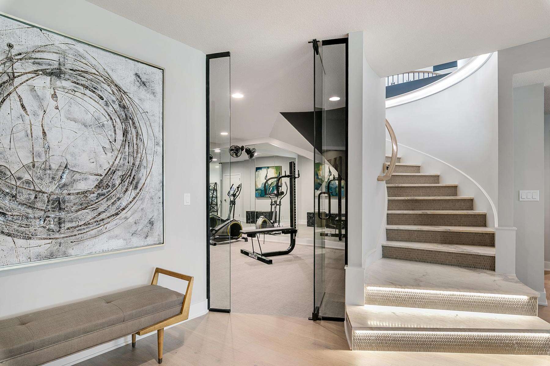 As an example of Patrick’s “fit for life” philosophy, there is what first appears to be a closet in the entry of this model. But that floor can be removed for space to hold an elevator. It’s a mindful accommodation for the future without sacrificing the details of fabulous living now, like that honed marble stairway.