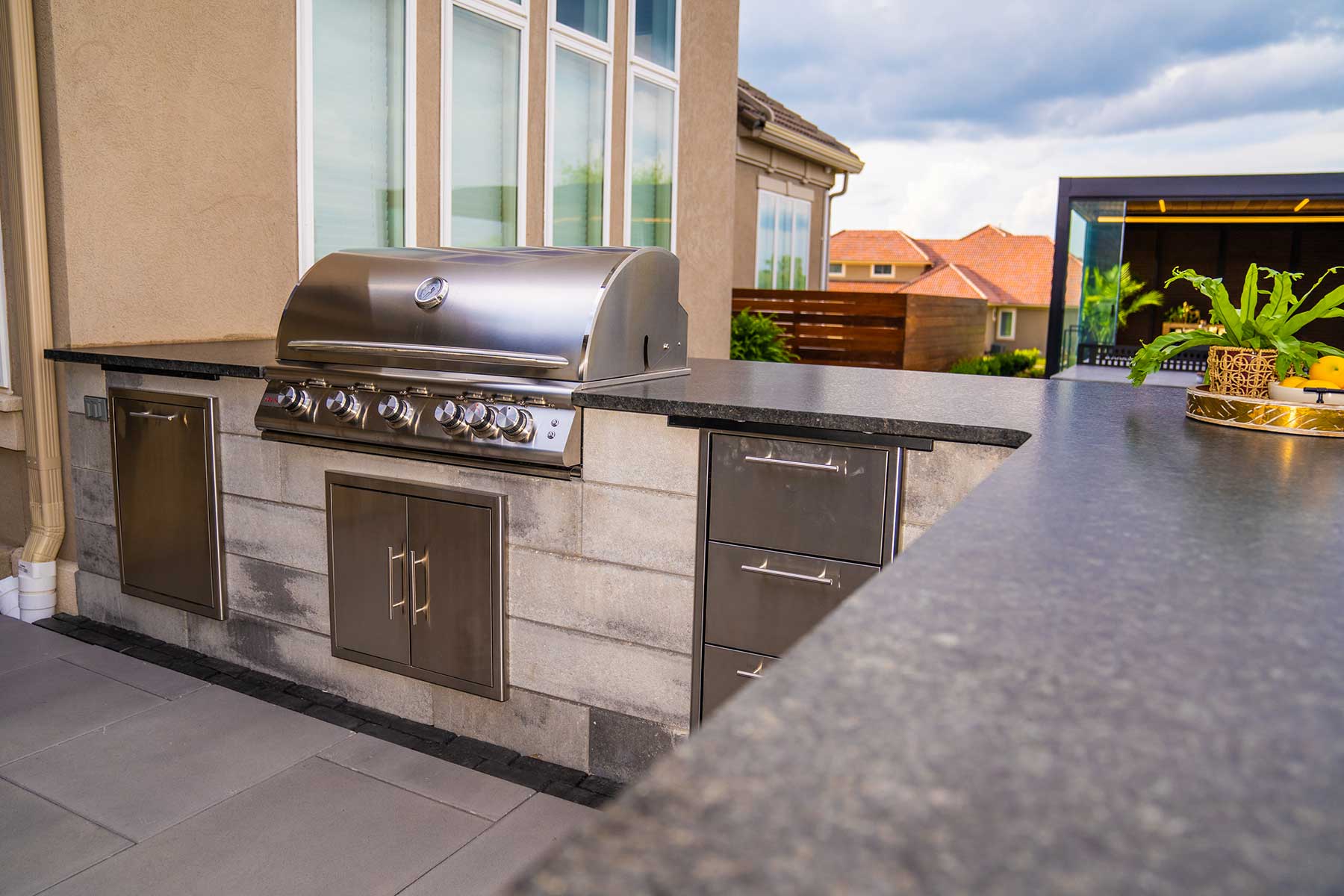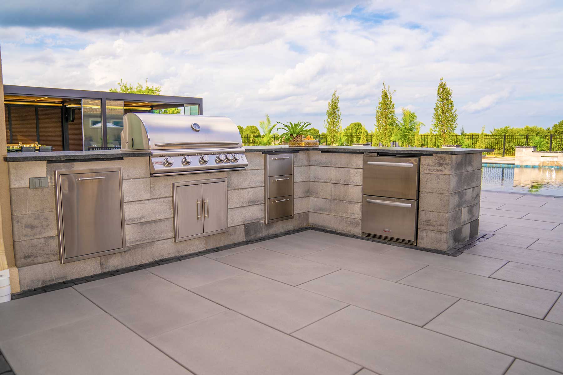 Adjacent to the house, the Windhausens added a full outdoor kitchen designed for both intimate dinners and large gatherings. The kitchen features Unilock SiennaStone wall construction and Black Pearl granite counters, combining durability with sophistication. The expansive pool deck, made from Unilock Beacon Hill Smooth XL pavers, includes a hidden drainage system to maintain a pristine appearance.