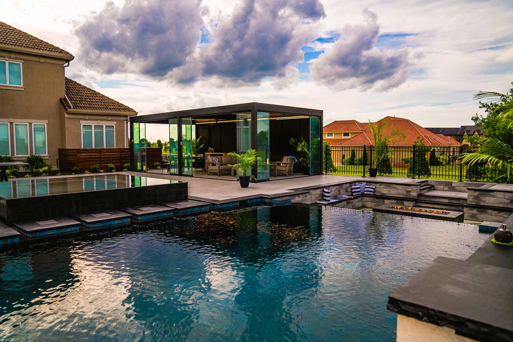 Complementing the pergola is a multifaceted pool and patio. The design features a four-sided infinity spa, a Baja shelf, a six-fall waterfall wall, and an infinity edge that cascades into a sunken fire pit area. This multi-level design not only creates a striking visual impact but also offers a variety of spaces for relaxation and socialization. From the integrated steppers connecting the spa to the Baja shelf to the soothing sound of water flowing into the fire pit area, every detail invites the family and their friends to unwind.