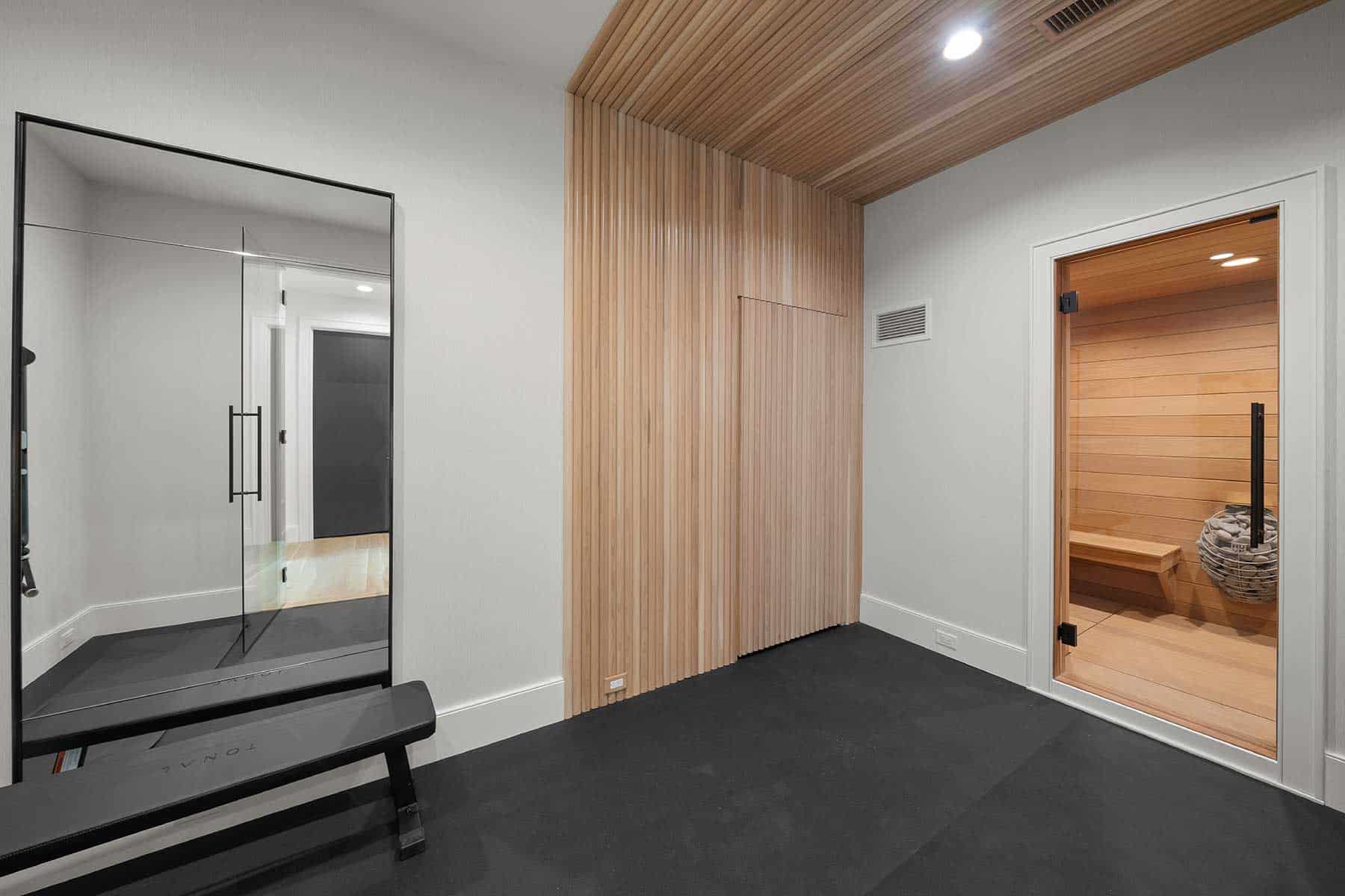 This level also features a home gym with a custom sauna.