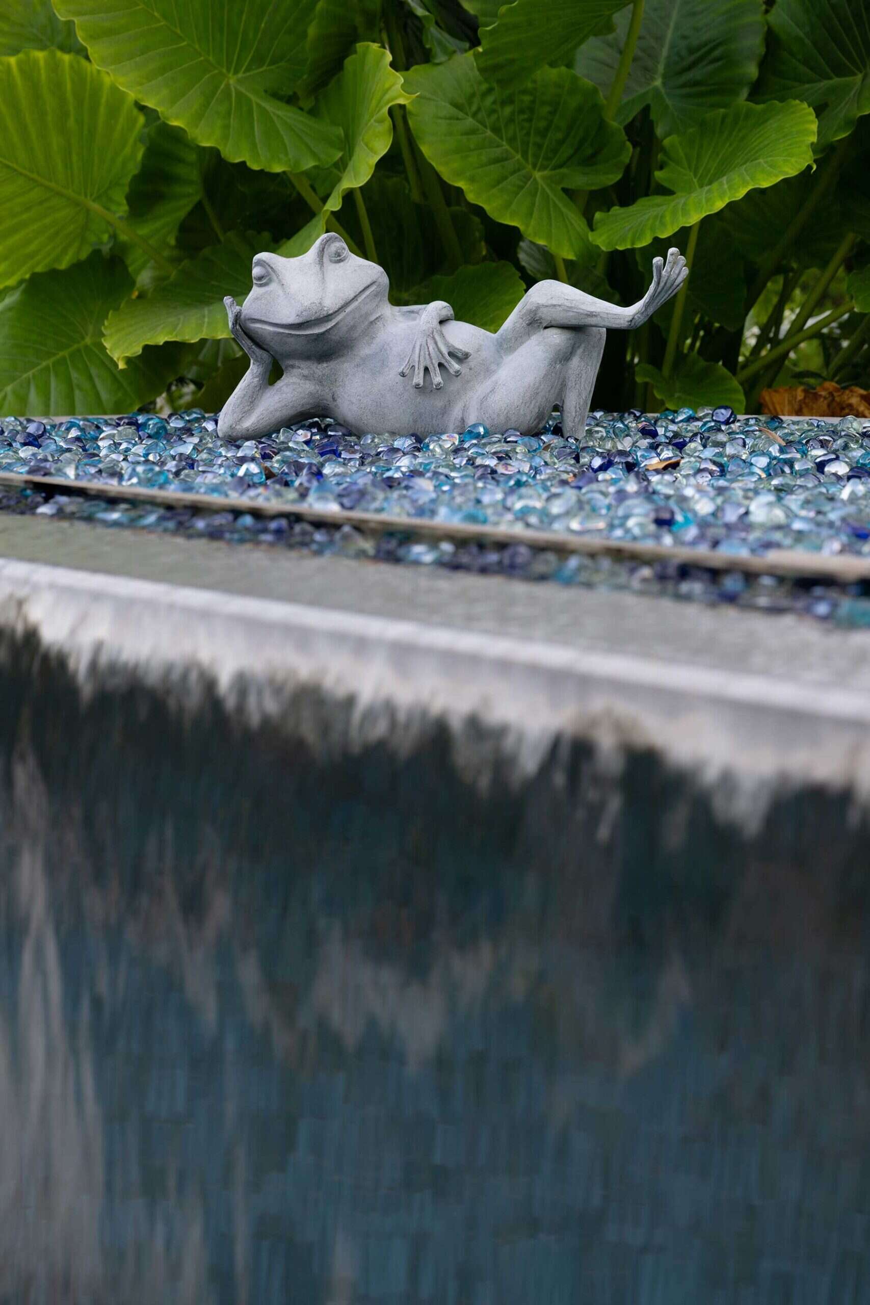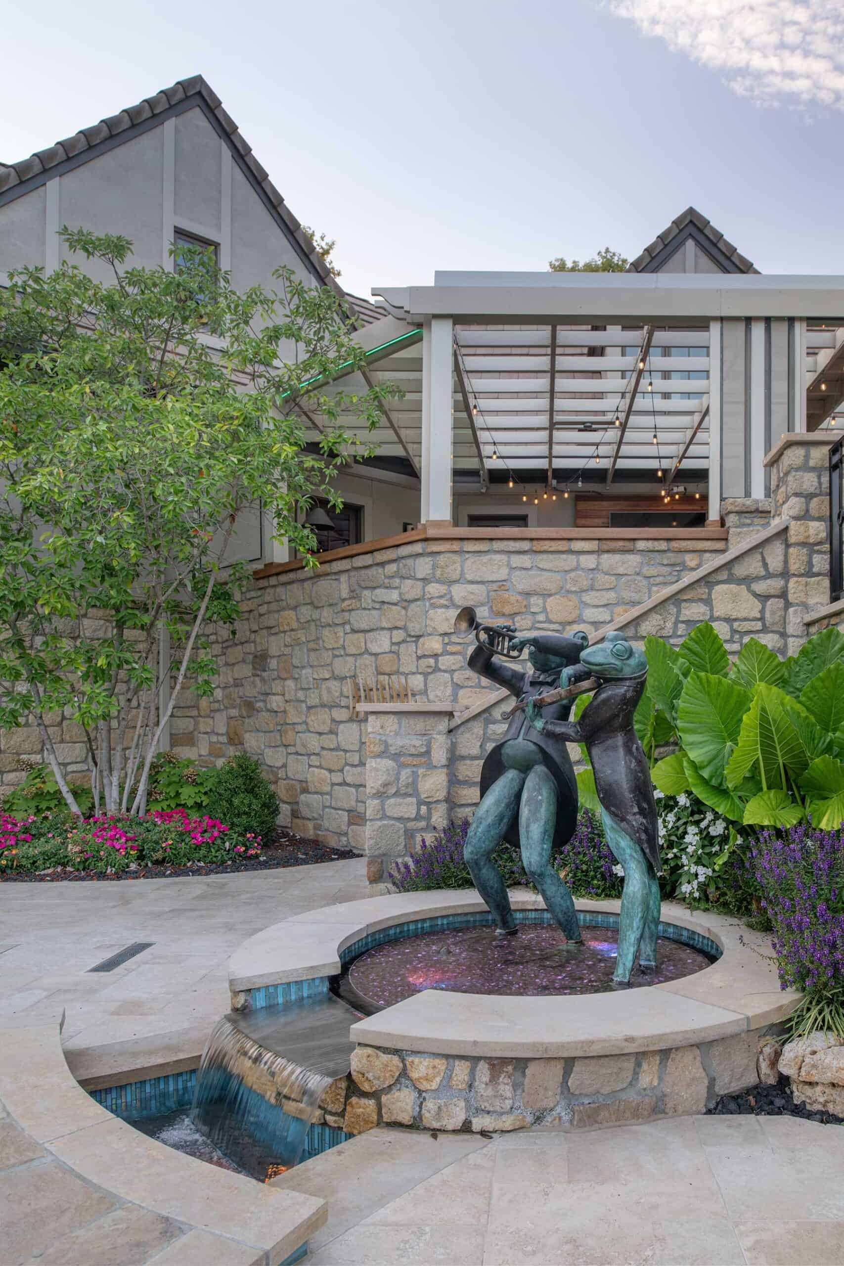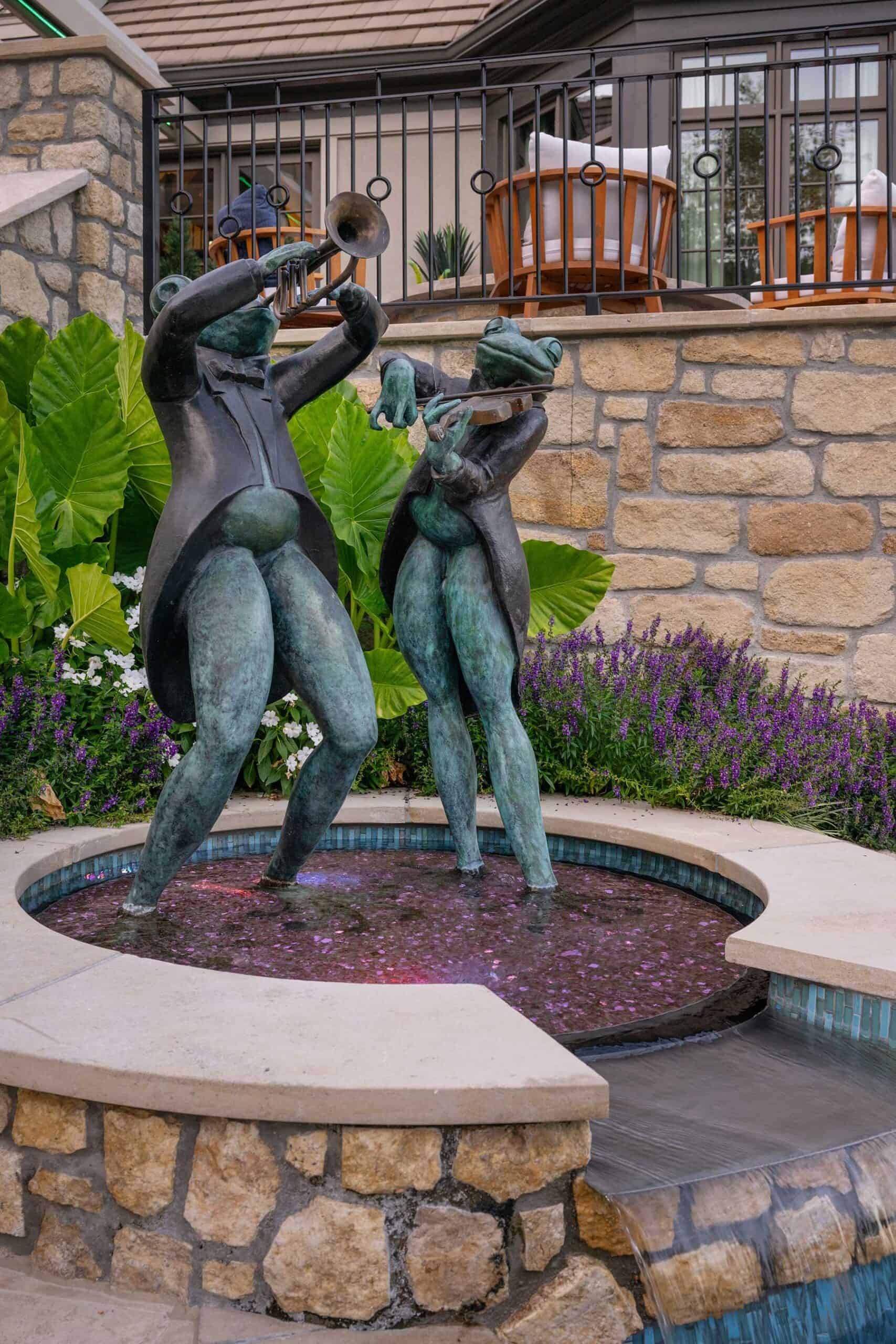 The metaphor works for Sheldon and Megan, both music lovers—Megan holds a doctorate in classical saxophone performance. Music even appears in the landscape as two life-sized bronze frogs playing instruments in a reflecting pool. Once intended by the original contractor to be a hot tub, the space is especially magical at dusk, when LED-lit glass casts a soft, atmospheric glow across the water’s surface.