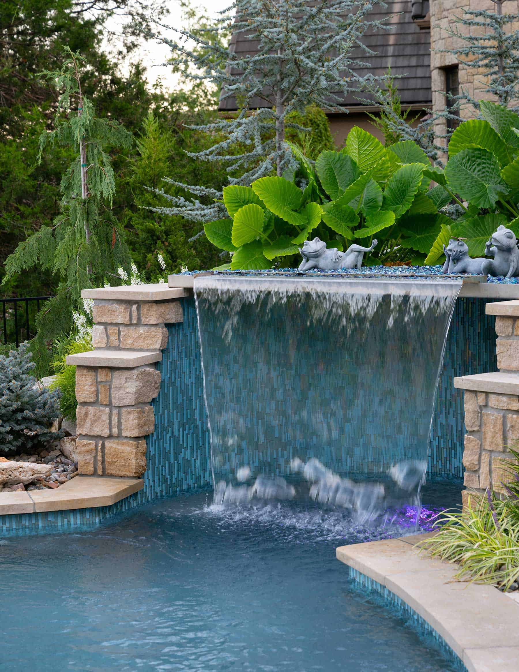 The waterfall—a focal point of the project—was redesigned from its original concept of a rock grotto. Bledsoe opted for a more enduring structure, using vertical glass tile that mimics the movement of falling water even when dry.