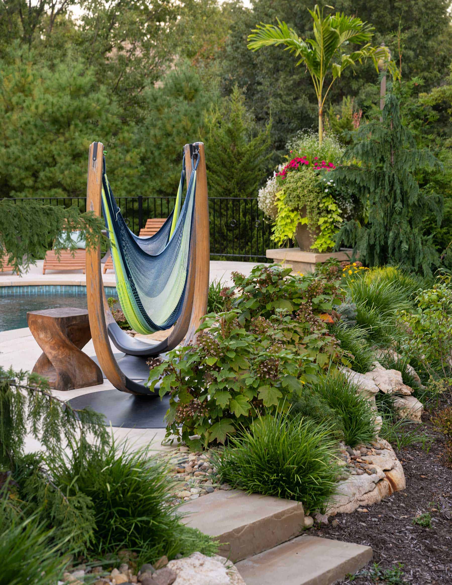 The completed space is versatile and soothing, offering multiple areas for gathering, relaxation and solitude: The fire pit lounge provides warmth and conversation, hammocks invite quiet retreat, and the sun shelf offers a place to simply drift. Each corner has a unique purpose, balancing active and restful spaces equally.
