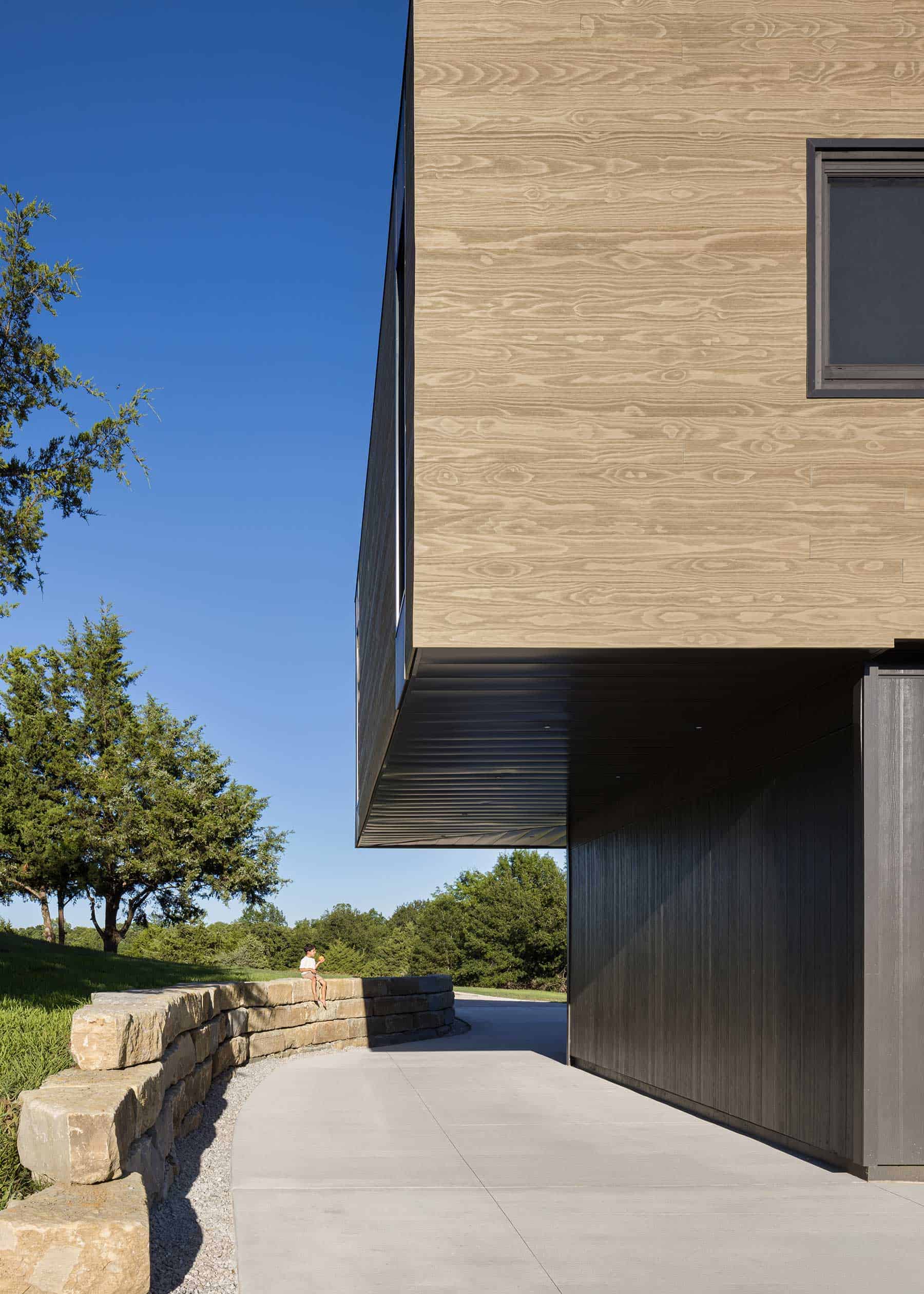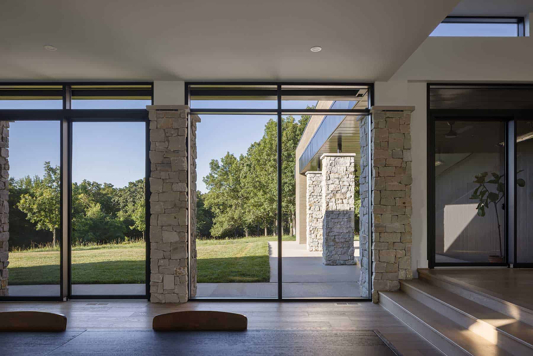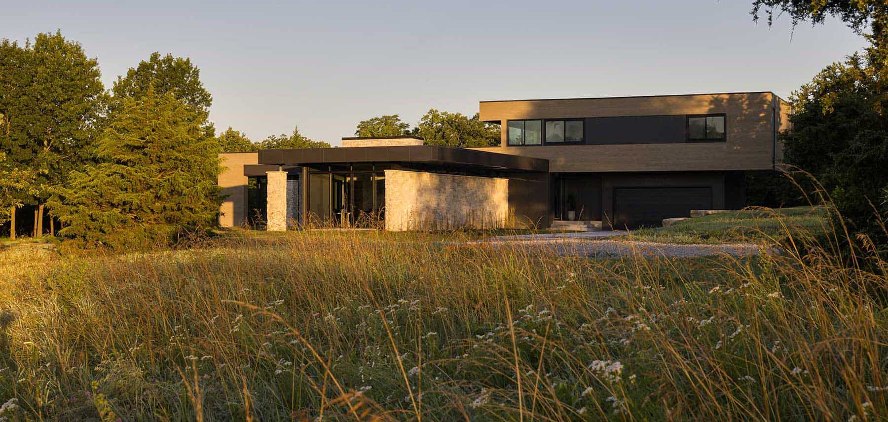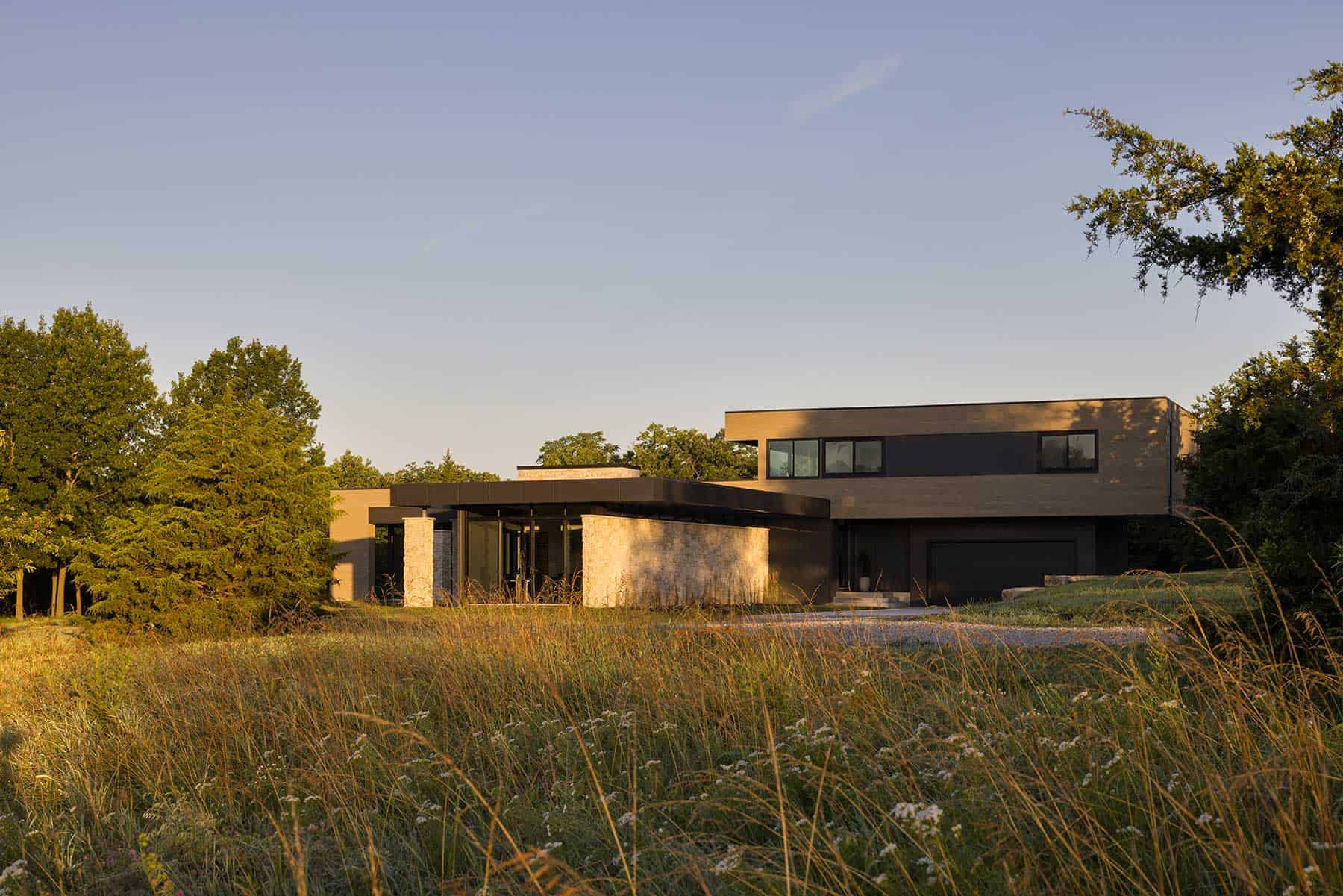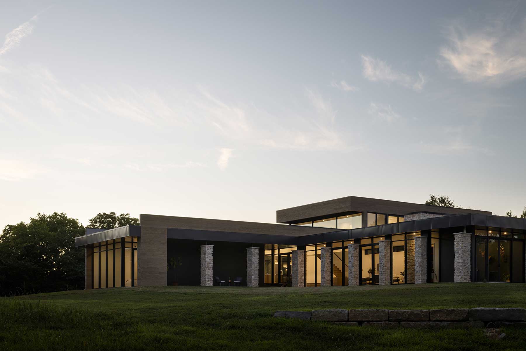 et on 25 open acres in north Cass County, Missouri, this modern home is a study in balance—between light and mass, openness and shelter, organic shape and structure. Designed by David Herron, FAIA, the house responds to its prairie setting with a straightforward, restrained approach.