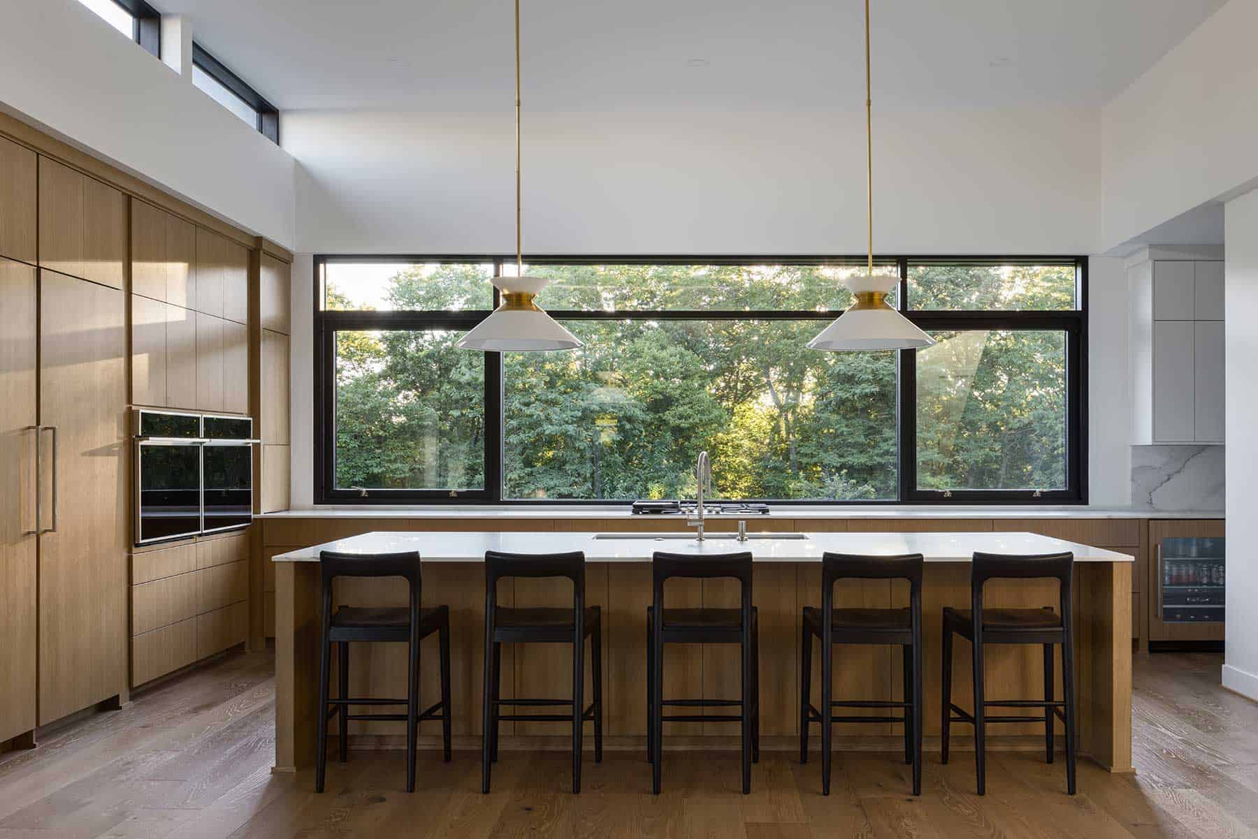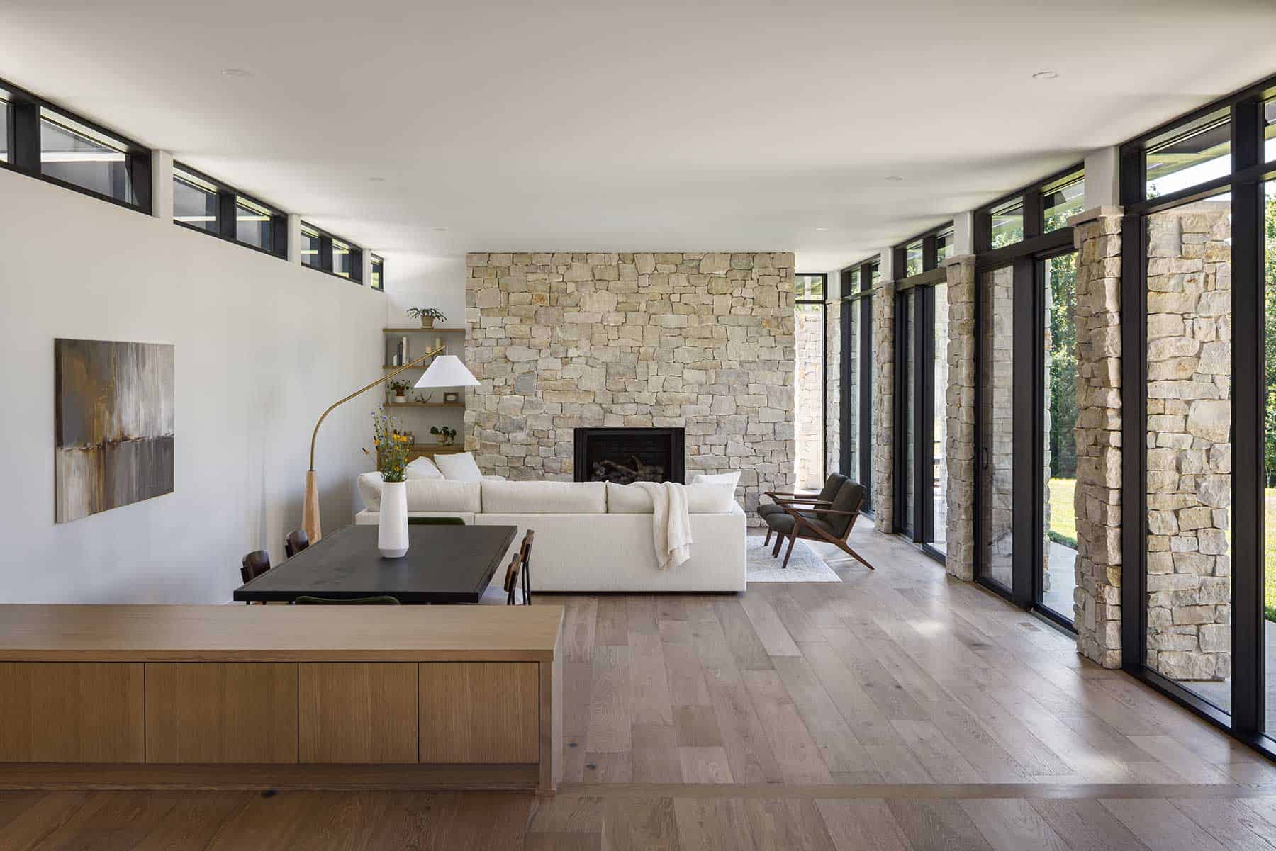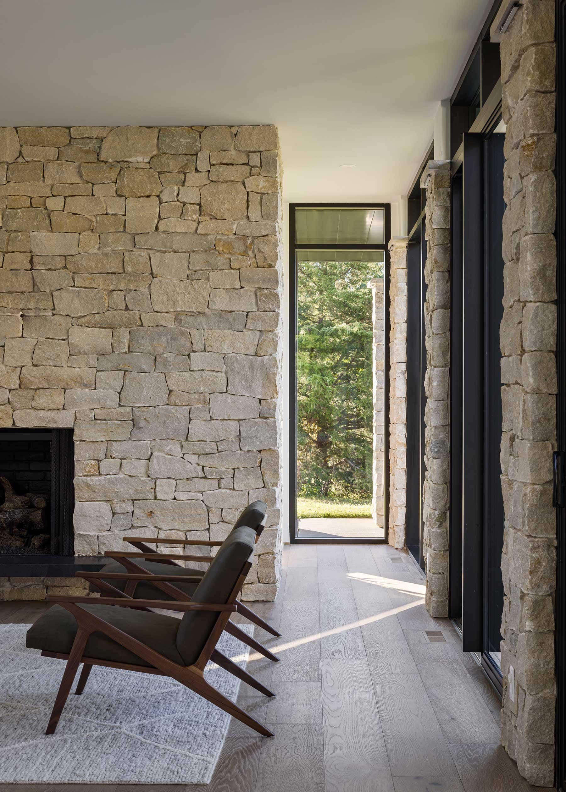 Stone carries through the project. Outside, it shapes walls and columns. Inside, it wraps the fireplace and continues into the kitchen, where it meets clean-lined cabinetry and natural wood. Clerestory windows bring light from above; long horizontal windows frame the trees and pull the landscape into the home.