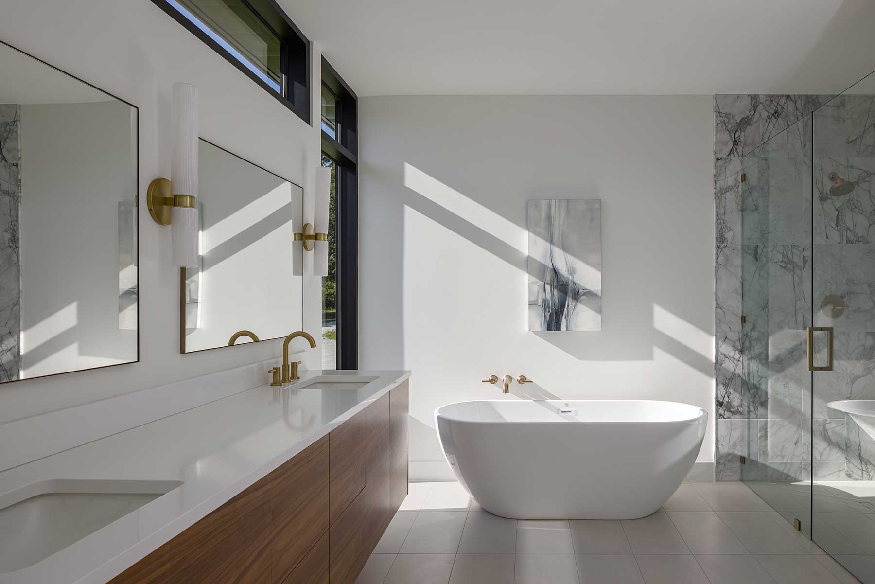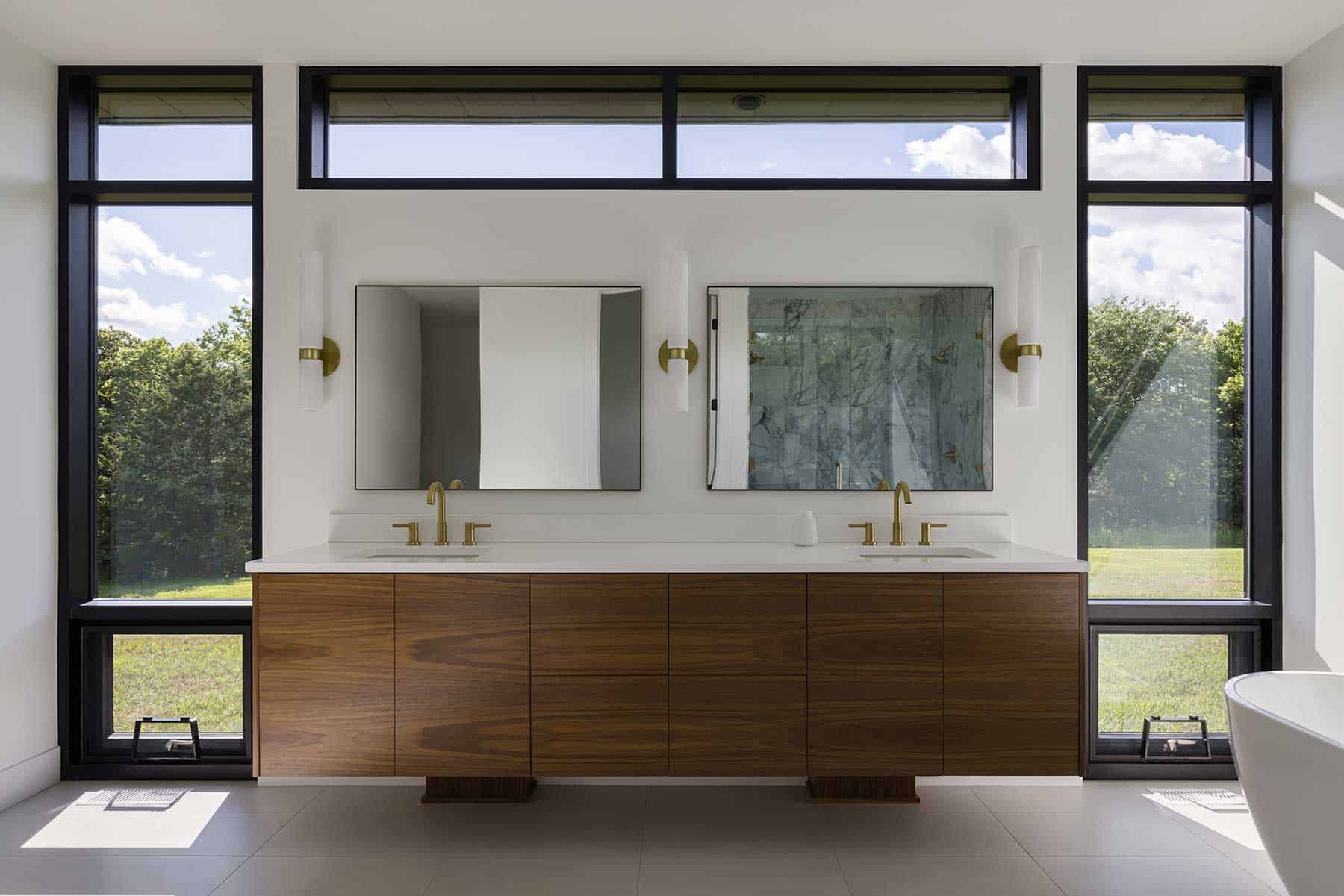 In the kitchen, vertical grain cabinetry, open shelving and built-in appliances offer warmth without clutter. In the bathrooms, walnut vanities sit between narrow windows, and a freestanding tub rests beneath a shaft of natural light. Materials were chosen with intention. The limestone was locally sourced and hand-laid. The wood siding came from a Texas mill treated for durability and grain. Black-painted panel siding—typically economical—was detailed carefully to feel cohesive.