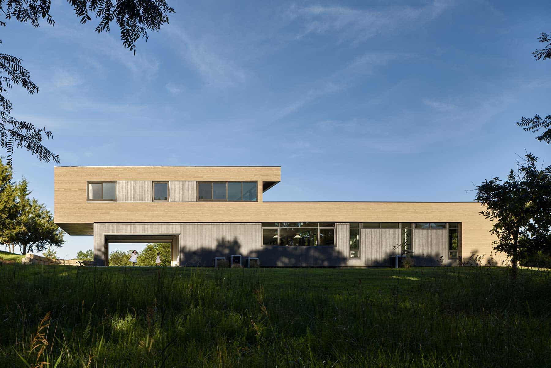 Though the design uses modern tools—cantilevers, clerestories, steel framing—the house doesn’t feel cold. Centered in a meadow and surrounded by trees, it partially cantilevers over a slope, staying clear of mature trees and letting the topography stay intact.