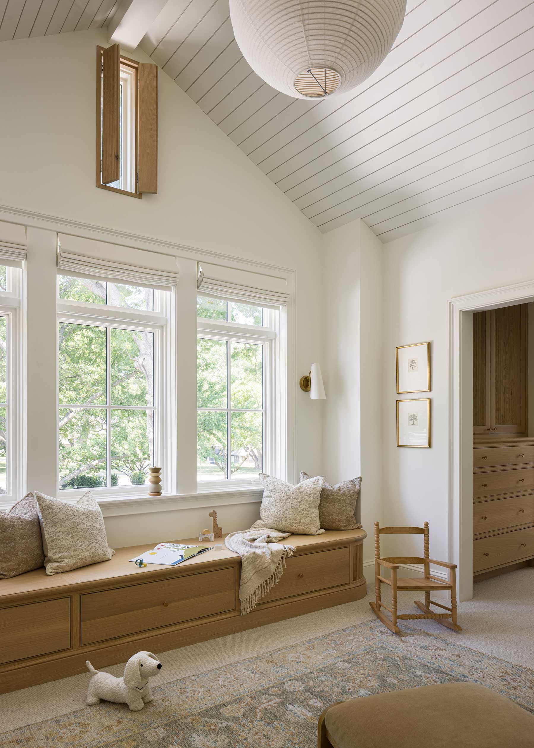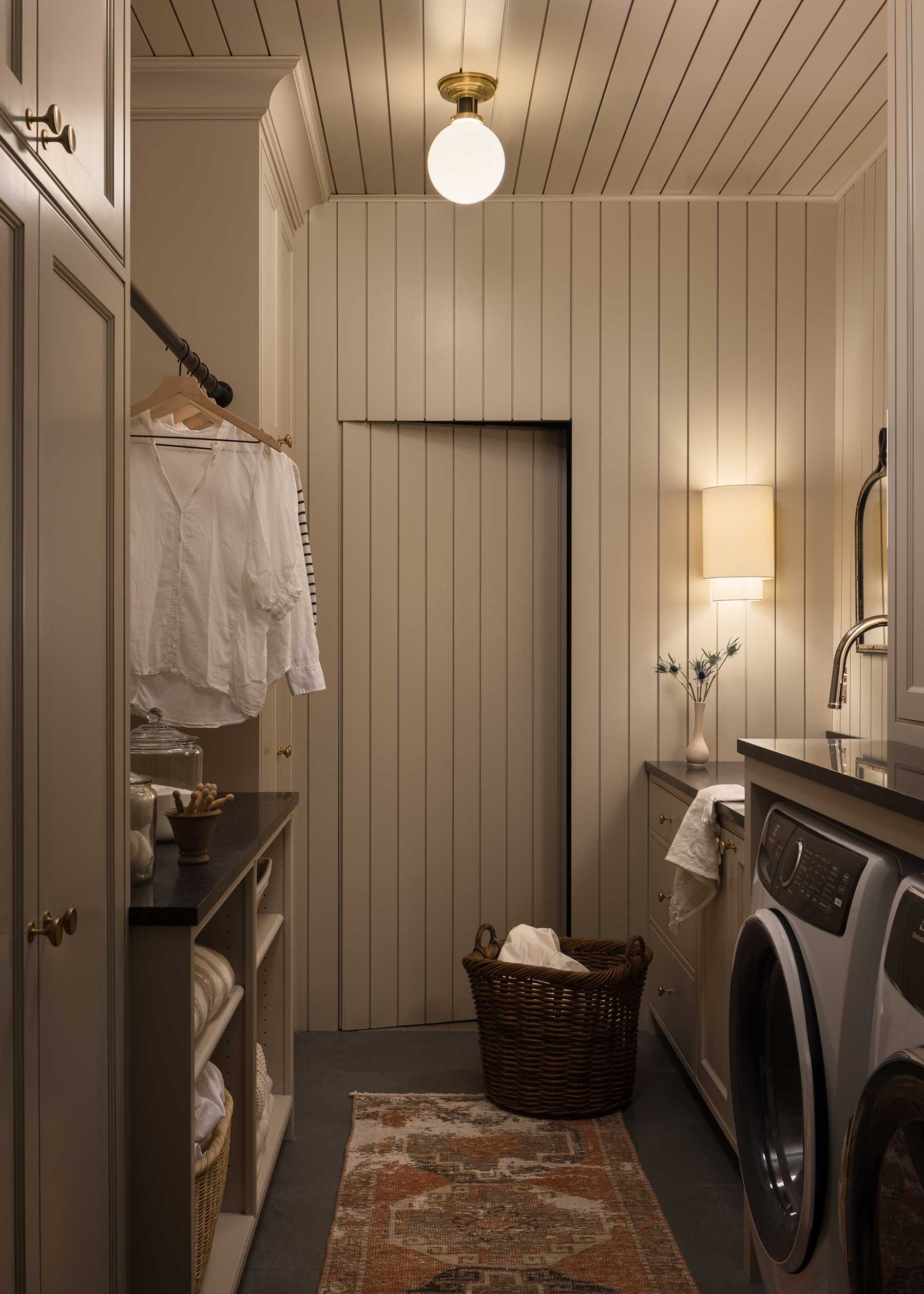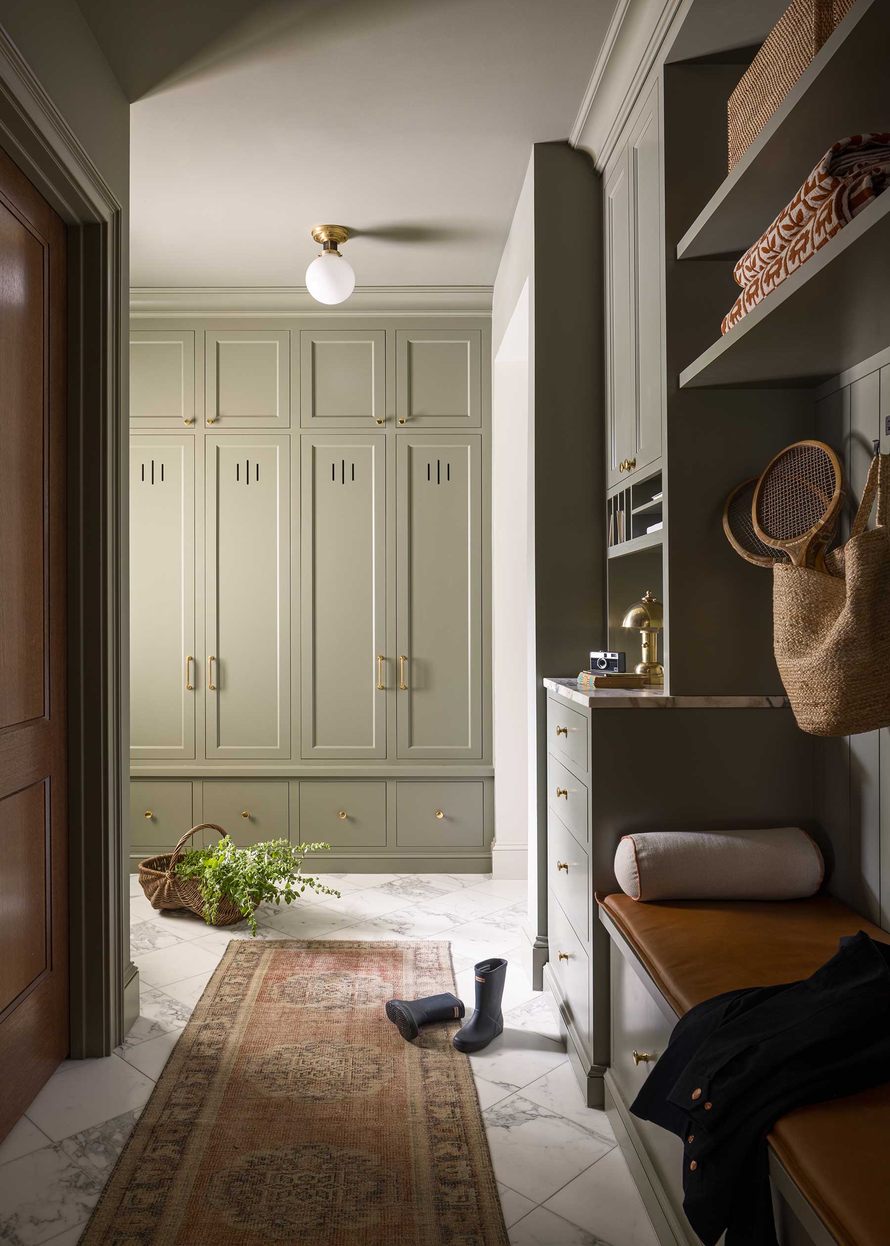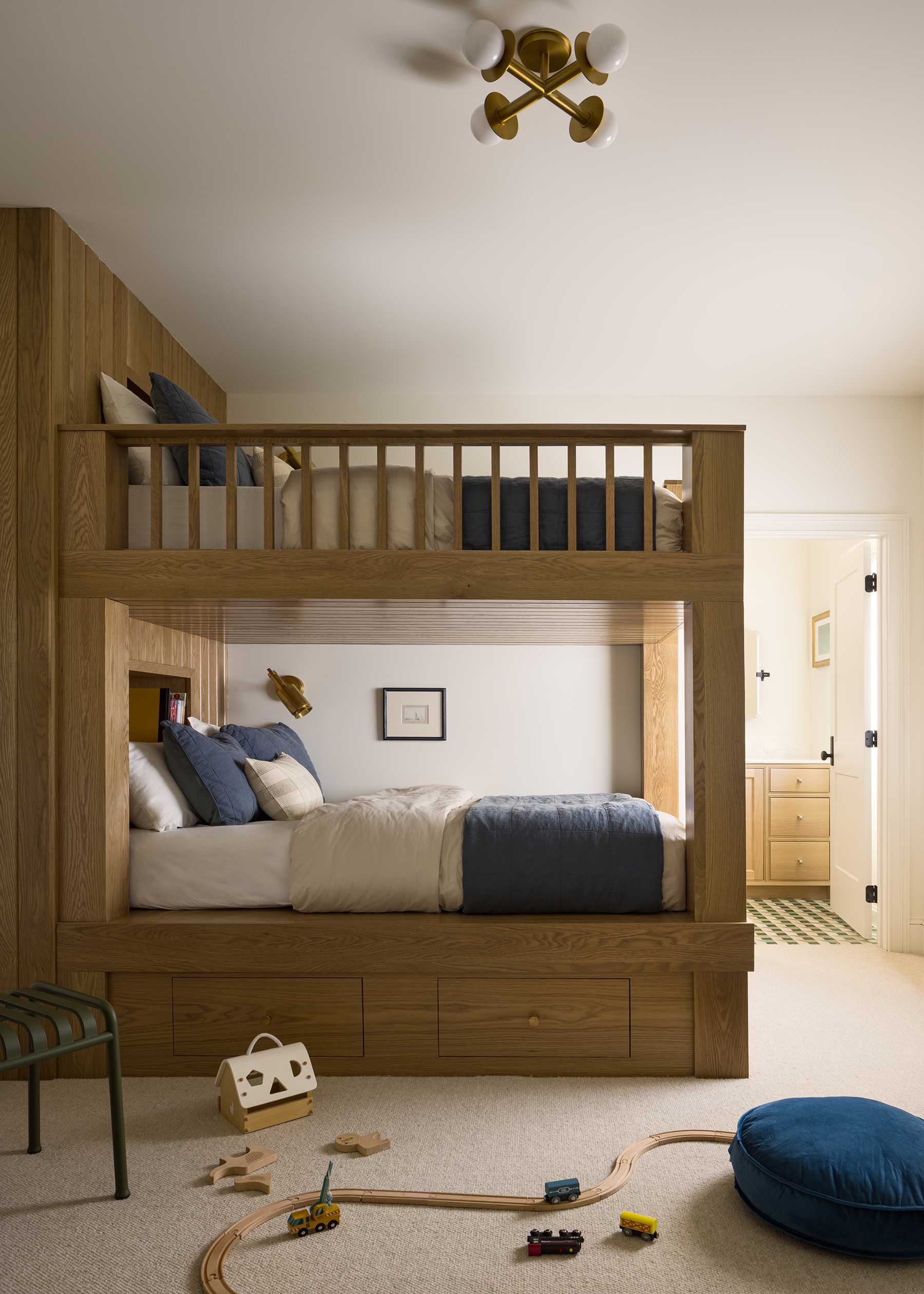 Everyday life with three boys was a design brief of its own. The mudroom bench is covered in leather rather than fabric, ready for sports gear and muddy shoes. The bunk room holds full-size beds to carry the boys through adolescence. Behind their closet lies a secret. “The Narnia closet leads to a hidden playroom where the older boys can leave their Legos safe from the toddler,” Posladek says.