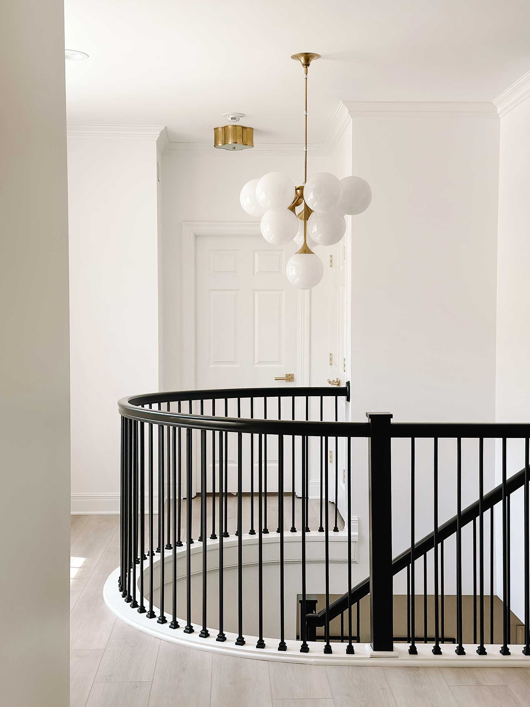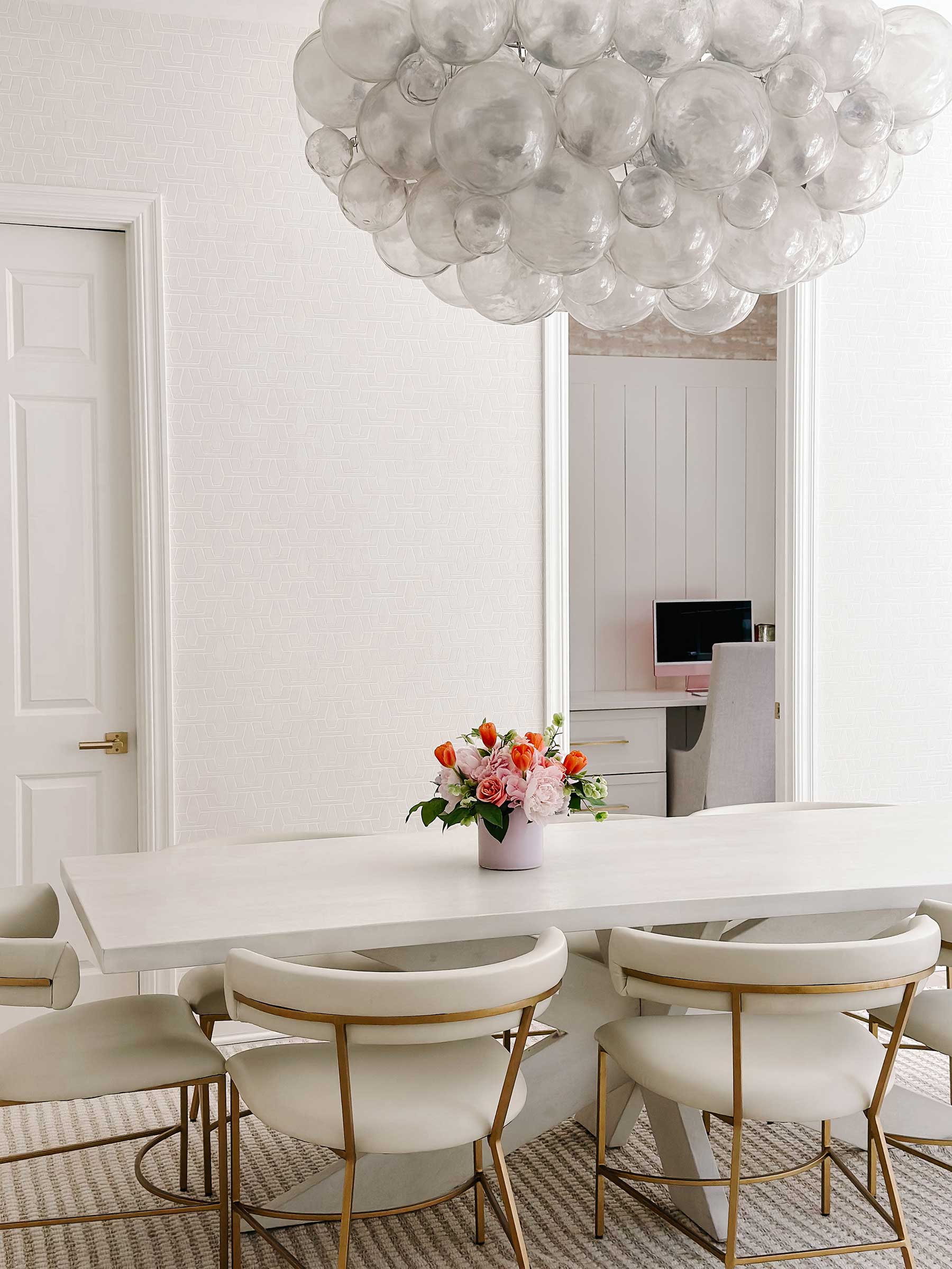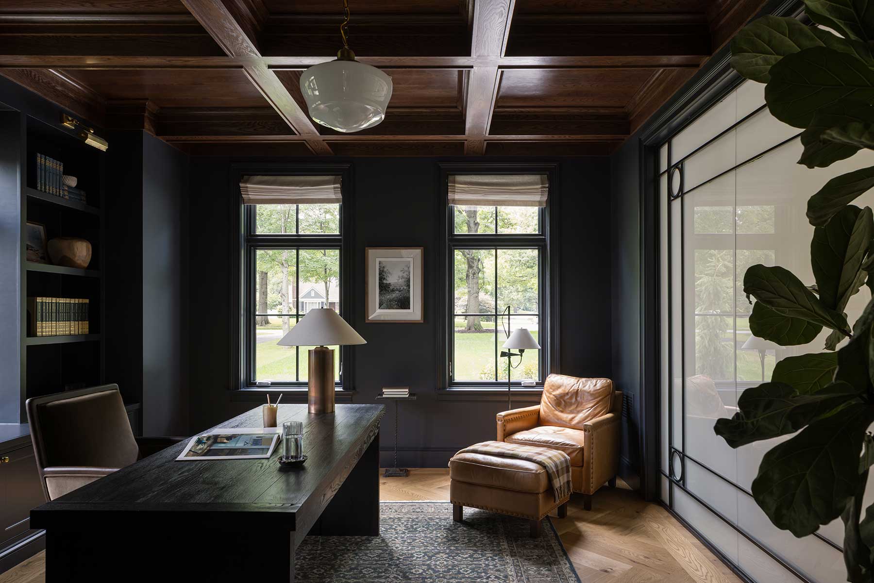 The office includes a dramatic steel-framed interior window fitted with “click glass” that turns opaque at the touch of a button. The staircase—continuous spindles with no newel posts or rosettes—was an engineering feat. “It took a year to figure out,” Posladek says. “But it gives the house both old-world resonance and modern clarity.”