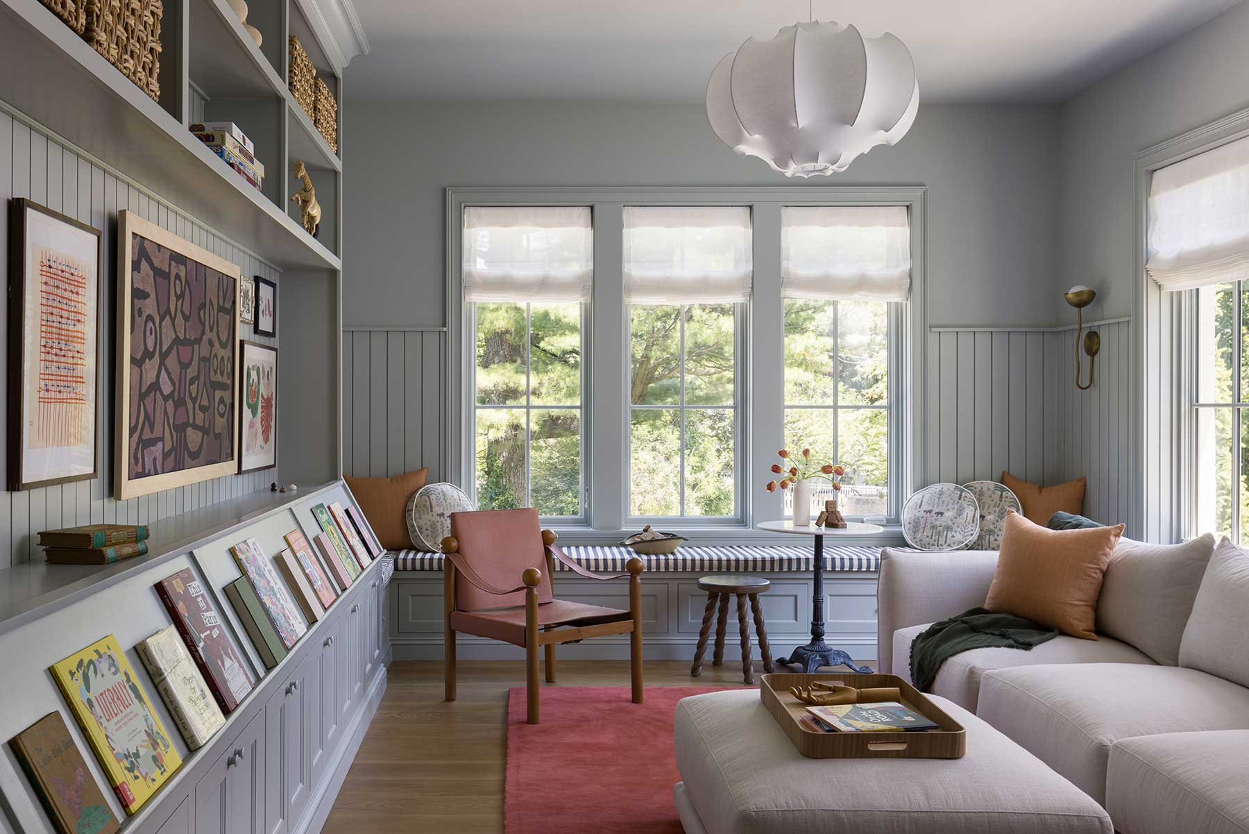 The family room offers another pause: walls and ceiling painted in pale blue, shelves stretching to the ceiling with something to read for everyone, a space that “feels like a cloud.”