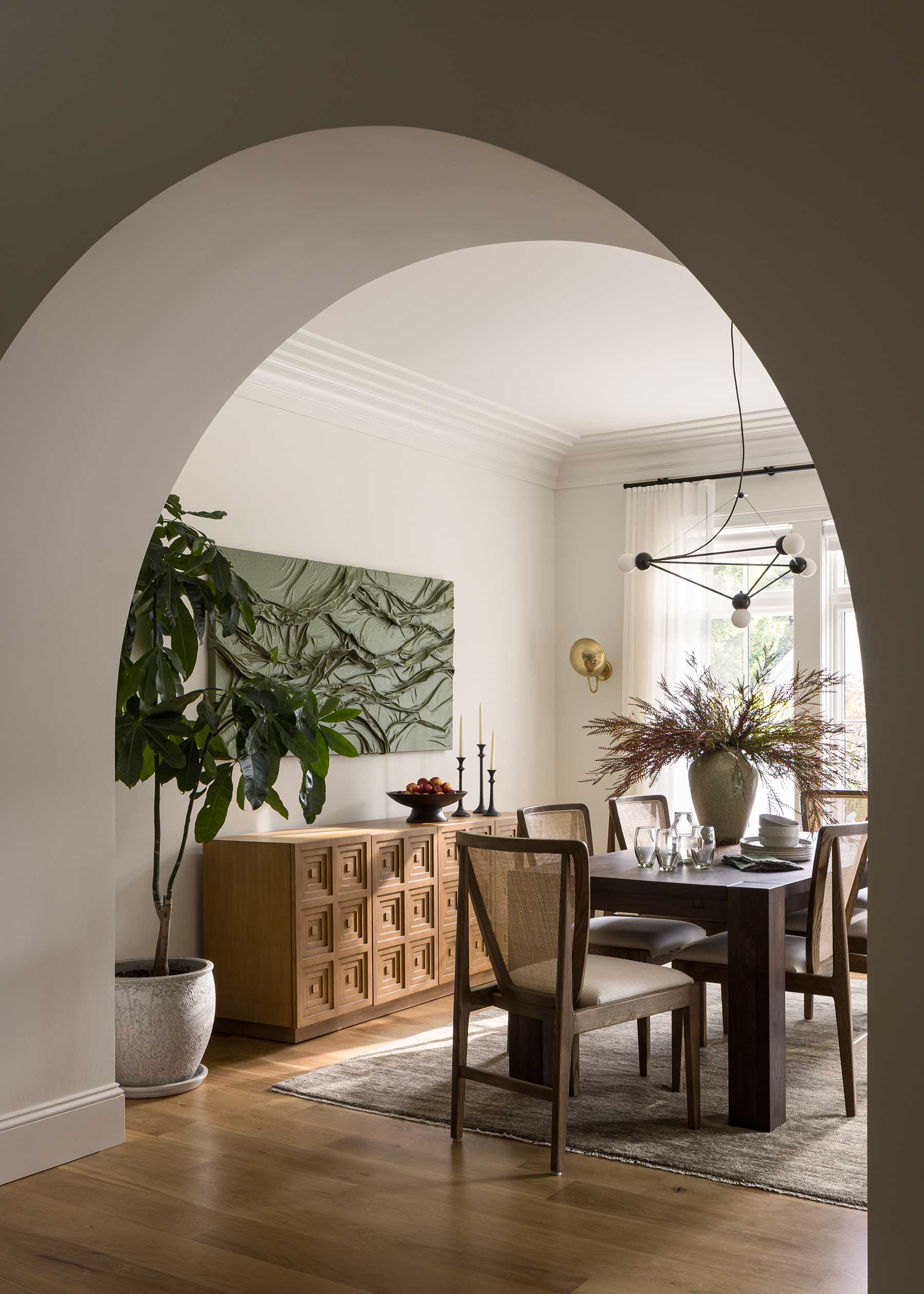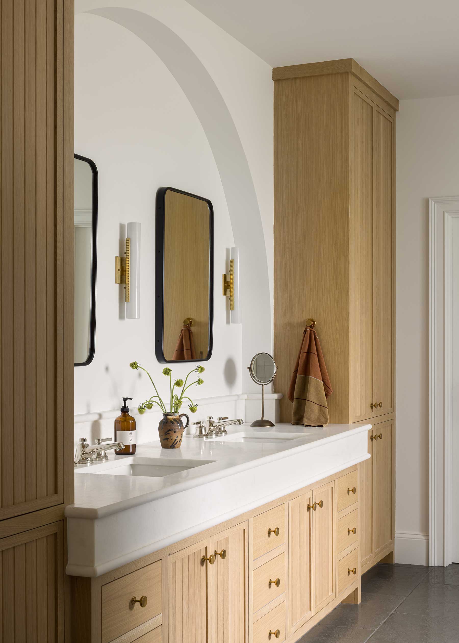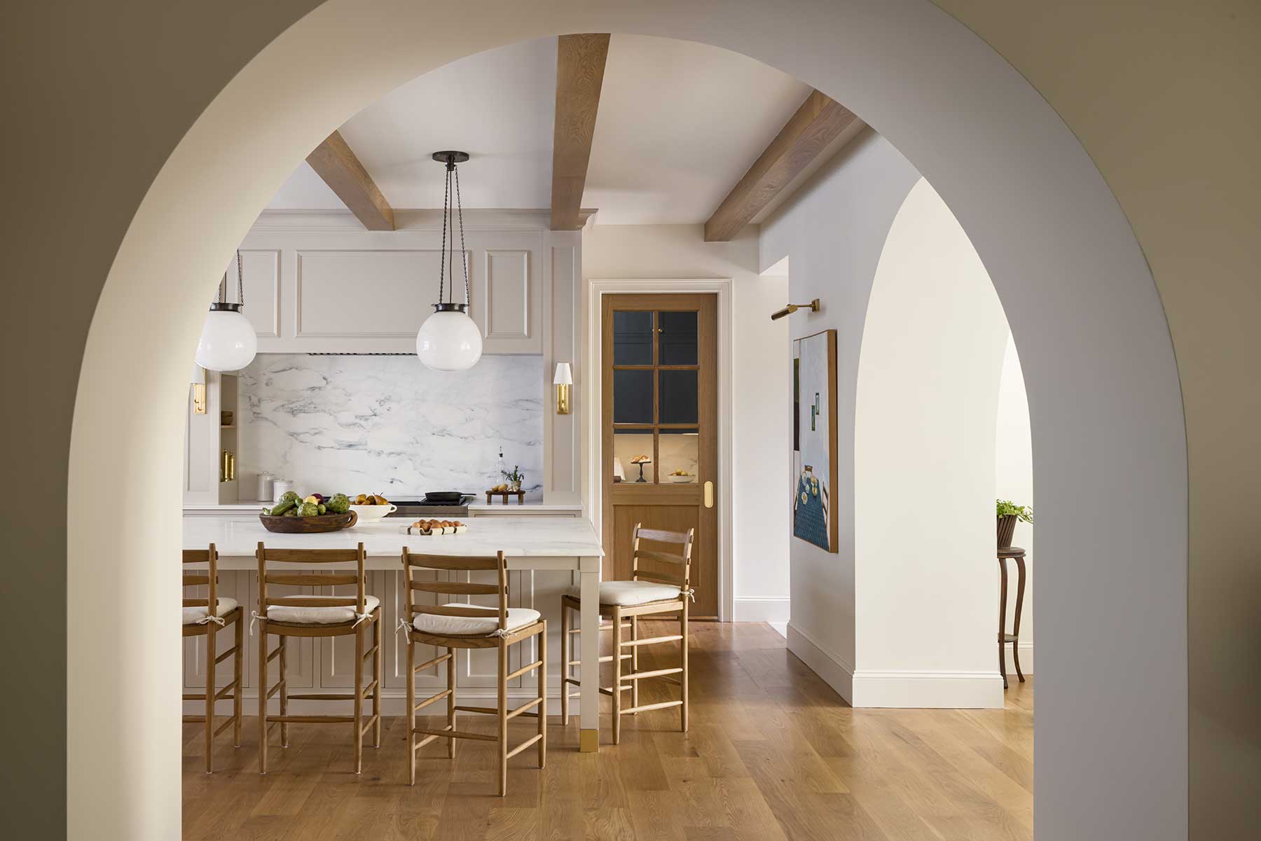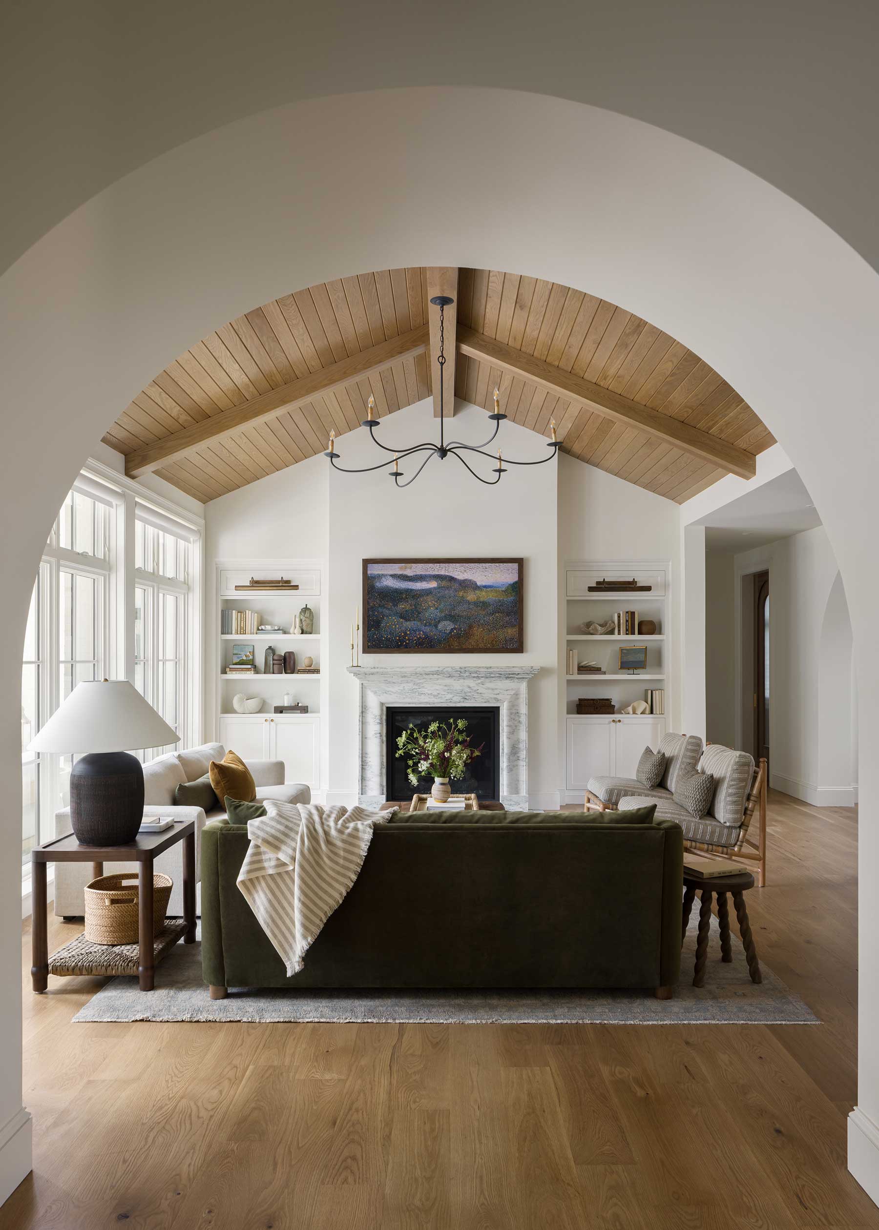 Inside, she resisted the common urge to create one vast open plan. “We wanted it to feel like it had been renovated over time,” Posladek explains. Distinct rooms flow together gracefully: arches are thick and substantial, not trendy; white oak floors carry warmth throughout; marble anchors fireplaces.