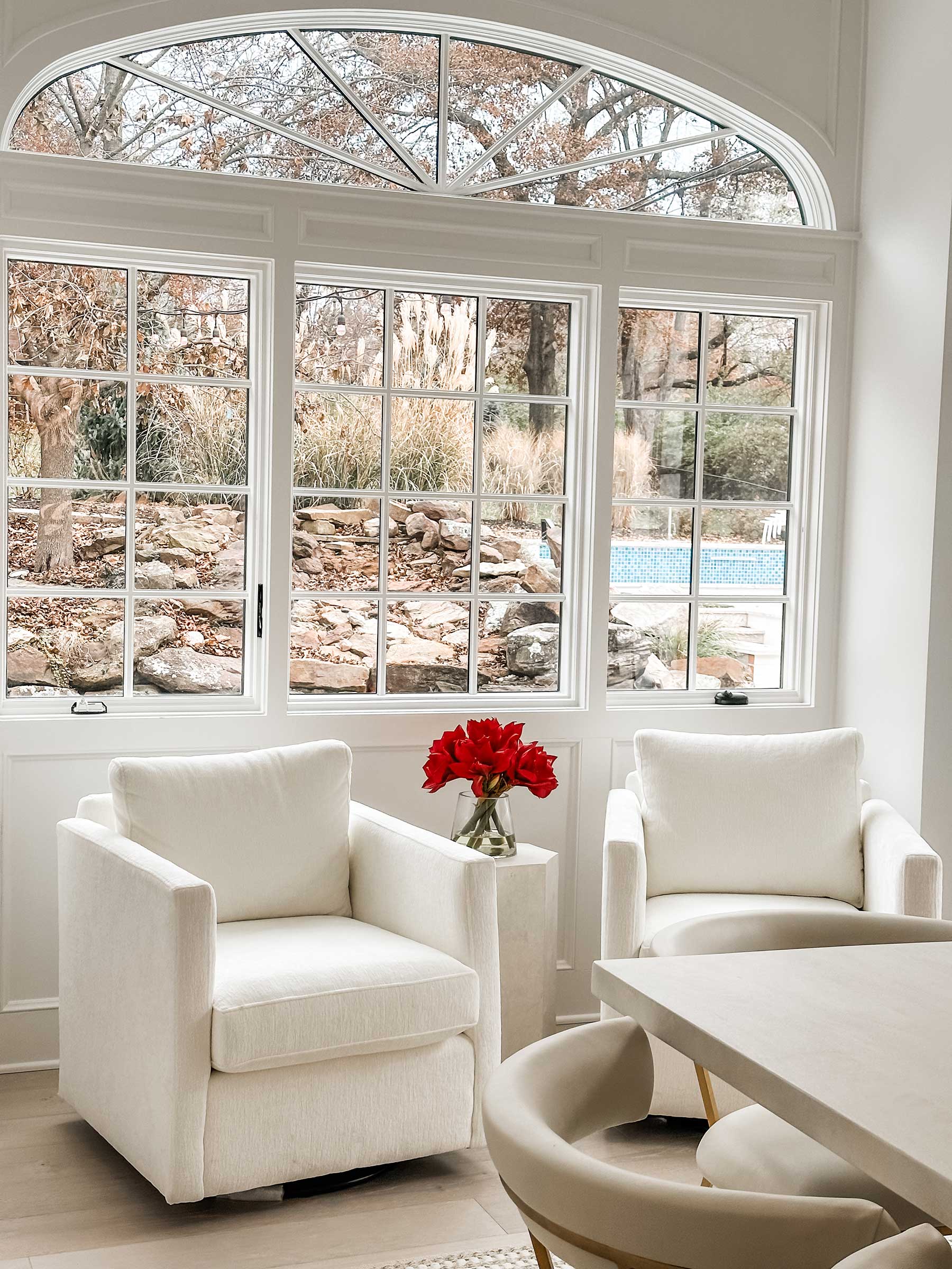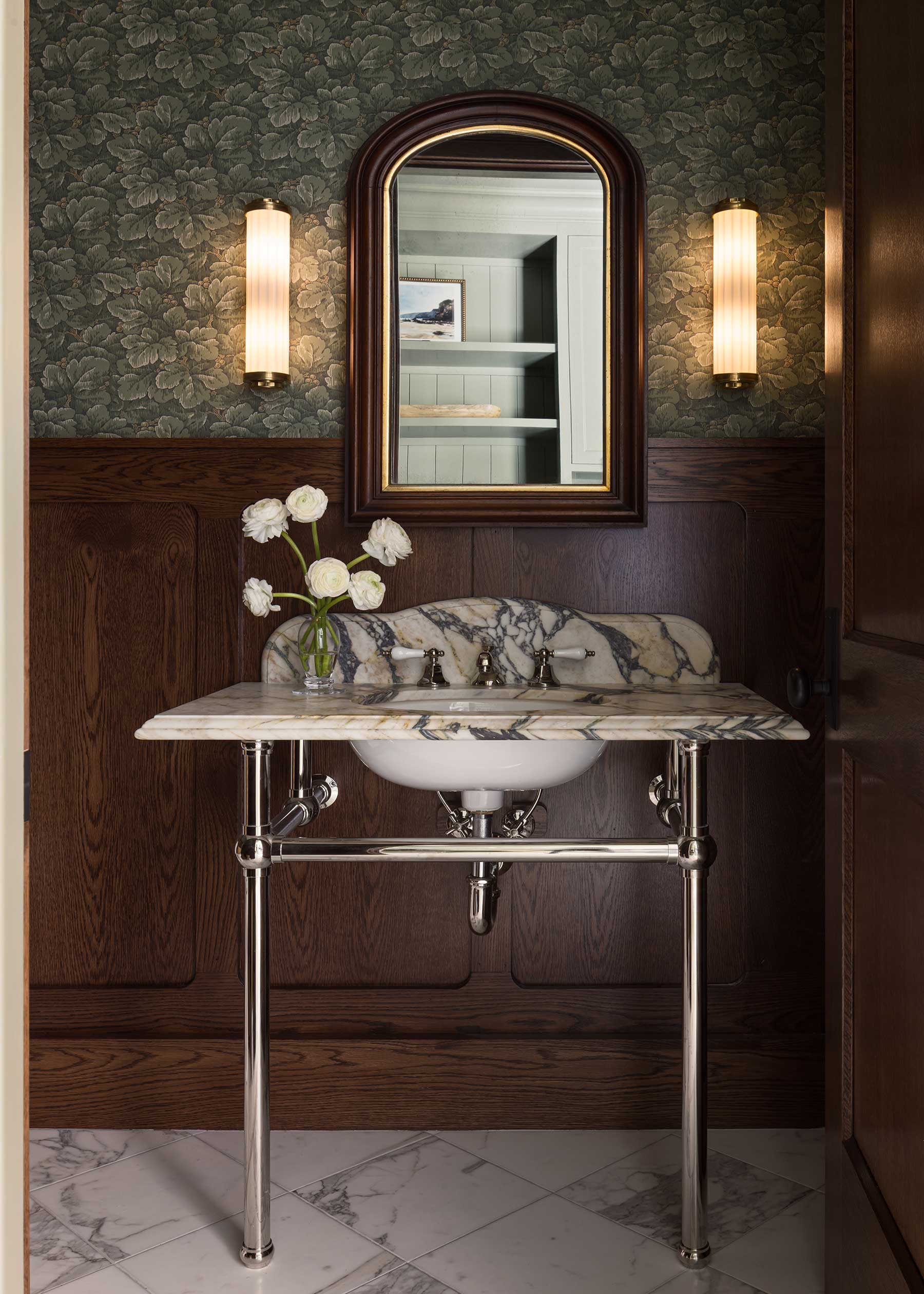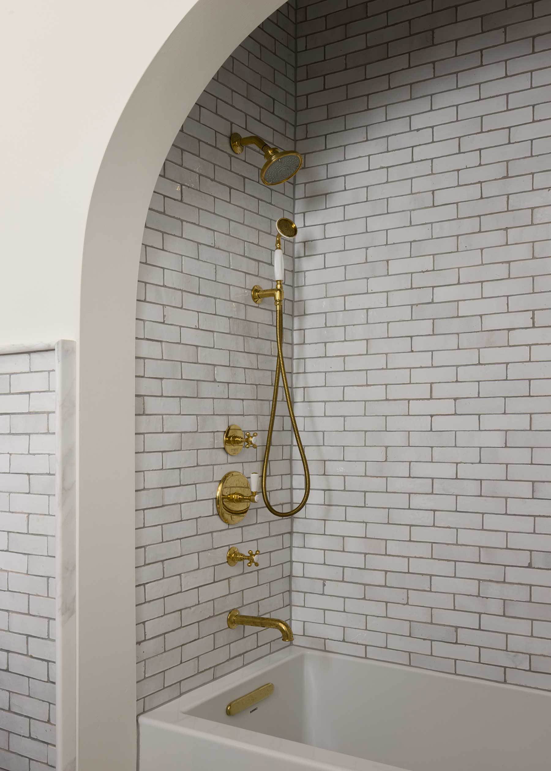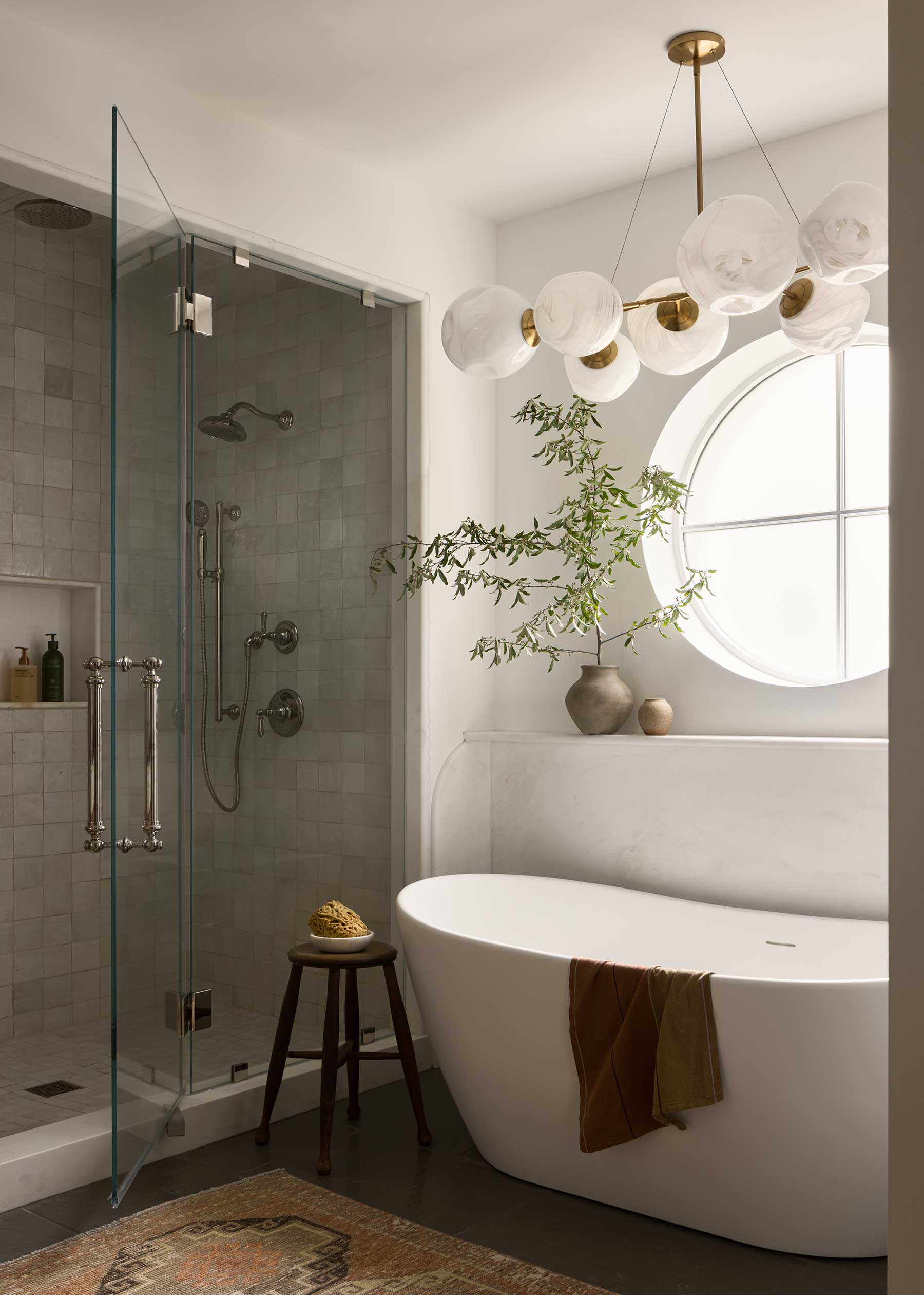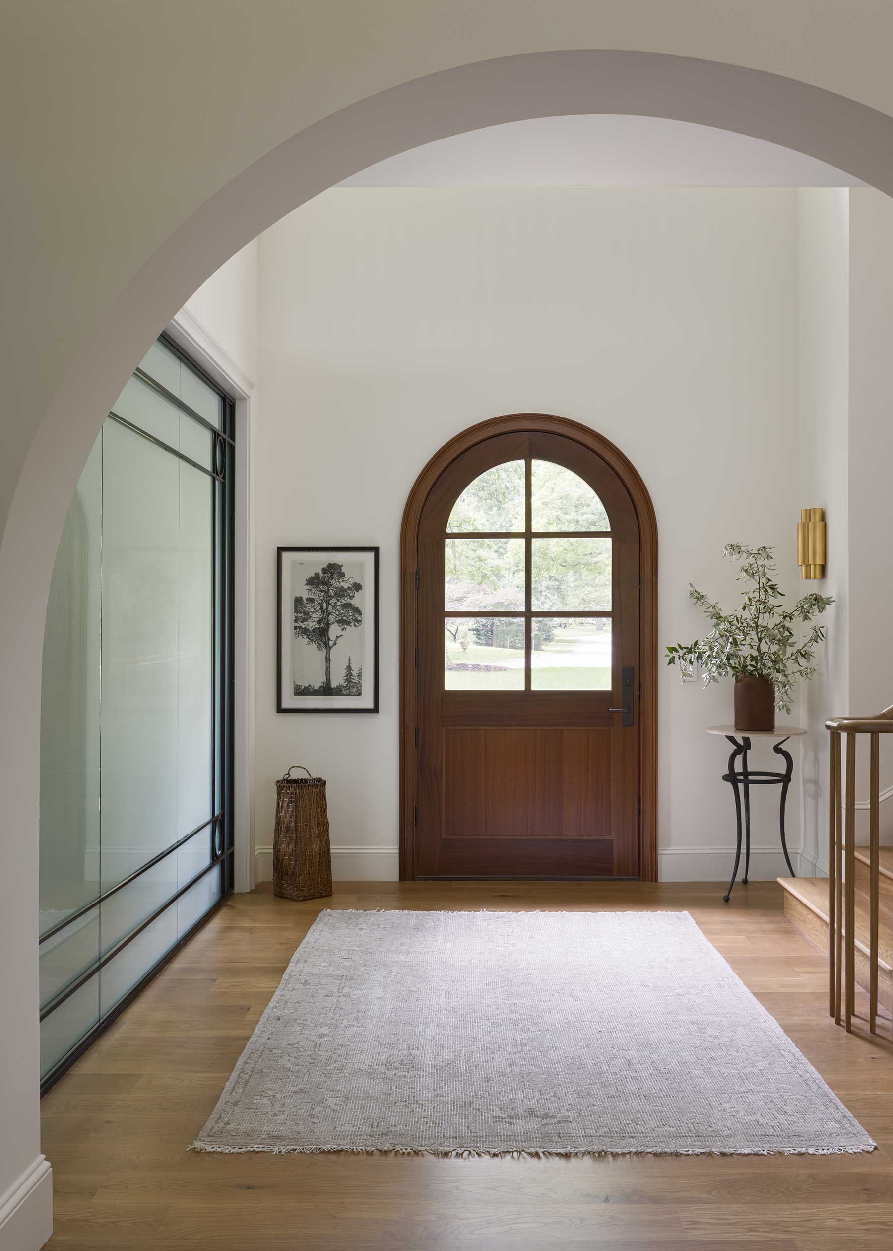 Inside, she resisted the common urge to create one vast open plan. “We wanted it to feel like it had been renovated over time,” Posladek explains. Distinct rooms flow together gracefully: arches are thick and substantial, not trendy; white oak floors carry warmth throughout; marble anchors fireplaces.
