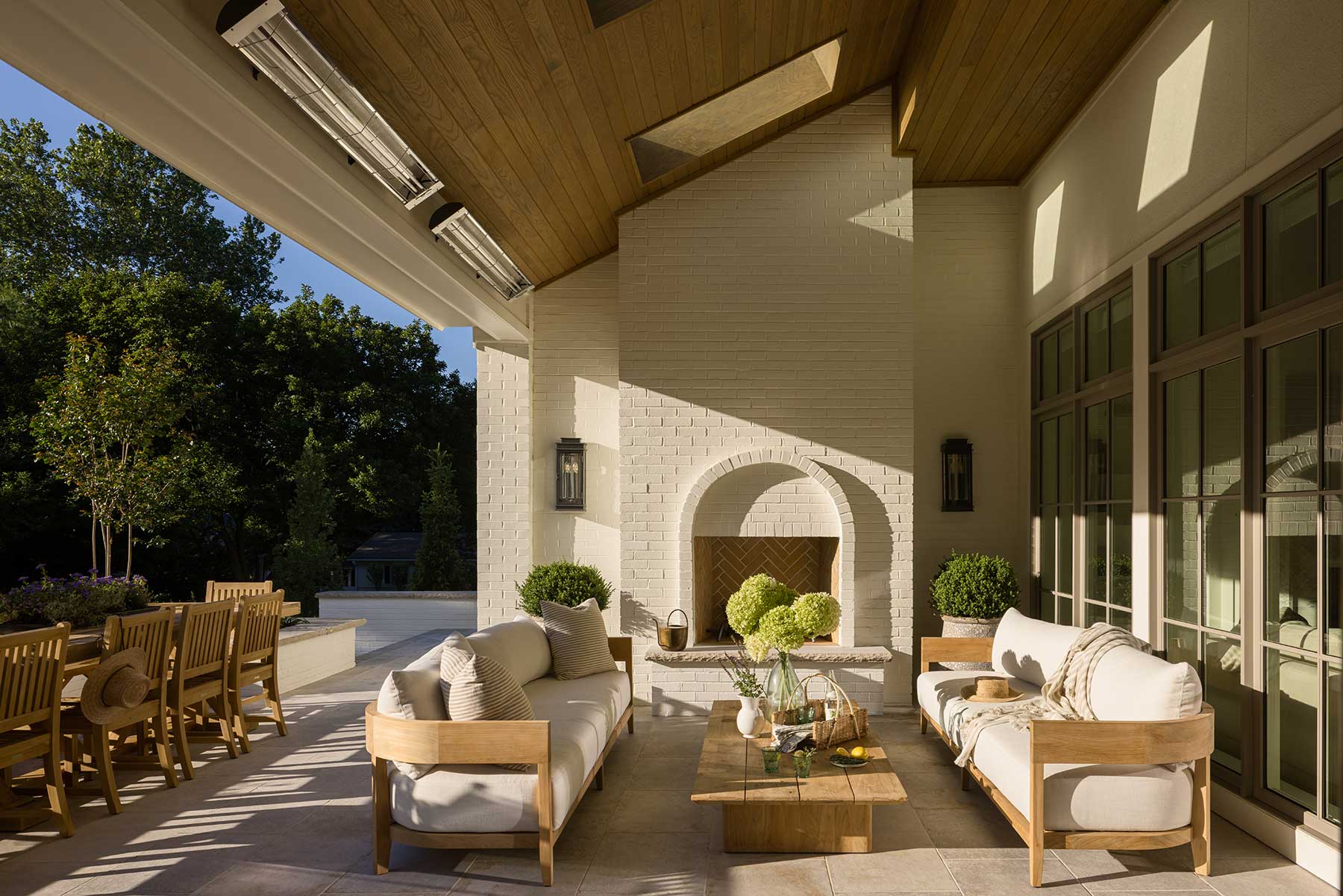 Hospitality shows up most vividly outside. At the heart of the back patio sits a 16-seat table—less a piece of furniture than a symbol of how the Fosters live. “It felt important to us, because in London we saw how much life happens around a table—long dinners, beautiful meals, people gathered together,” Leigh says. Neighborly yet secluded, the gathering place features a wood-burning fireplace for warmth, skylights that keep the adjoining living room bright, and built-in heaters that extend Kansas City’s seasons.