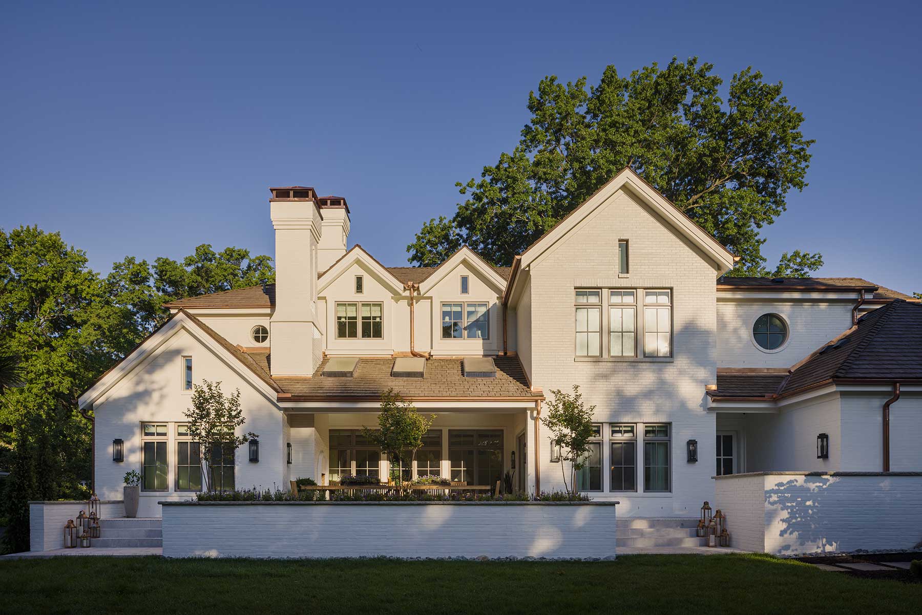 he house on Lee Boulevard doesn’t look new. Its painted brick exterior, sloped rooflines, and copper gutters already deepening with patina give it the presence of a home that could have been there for decades. A round stair window punctuates the façade, while an arched front door gestures to familiar Kansas City traditions.
