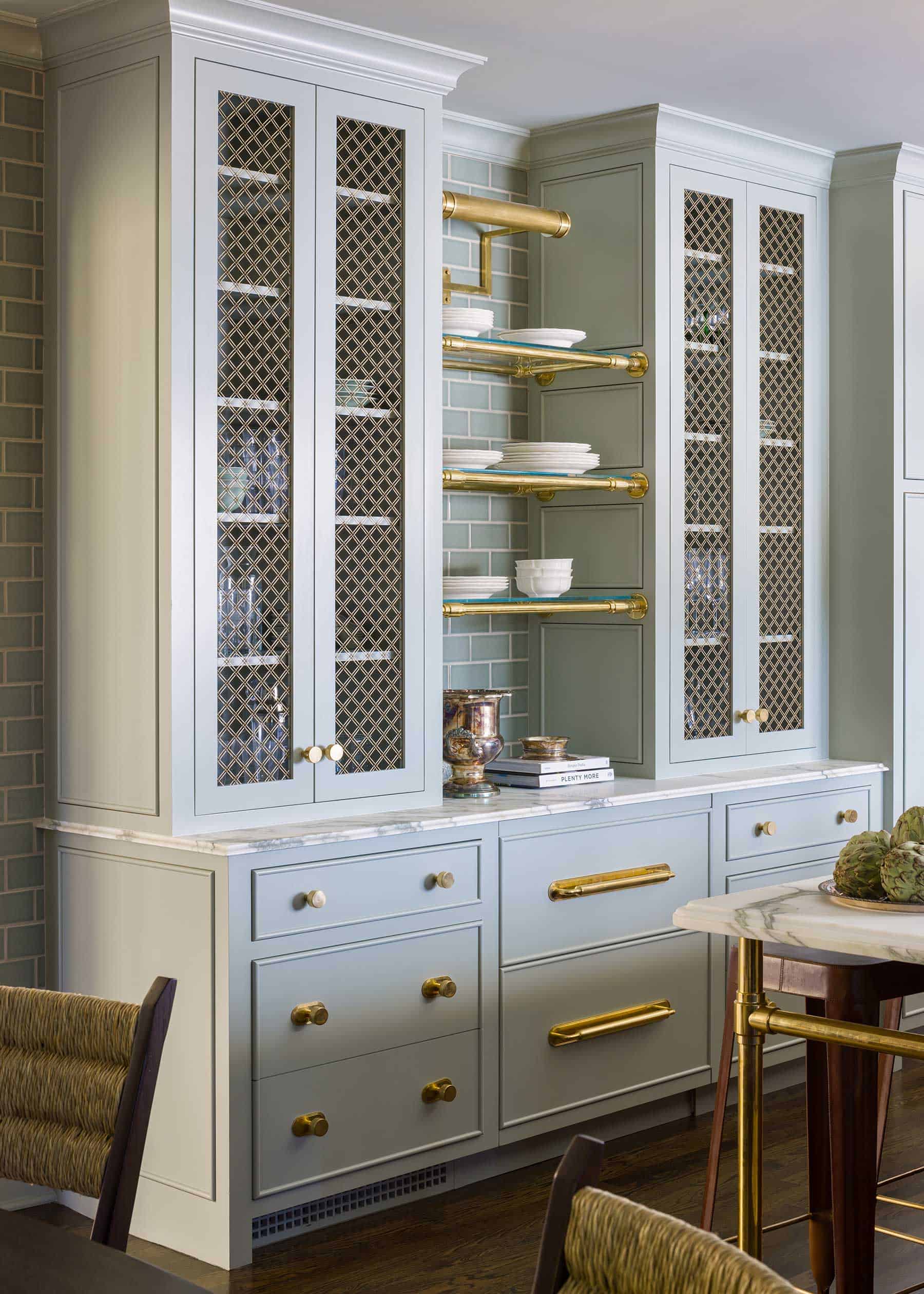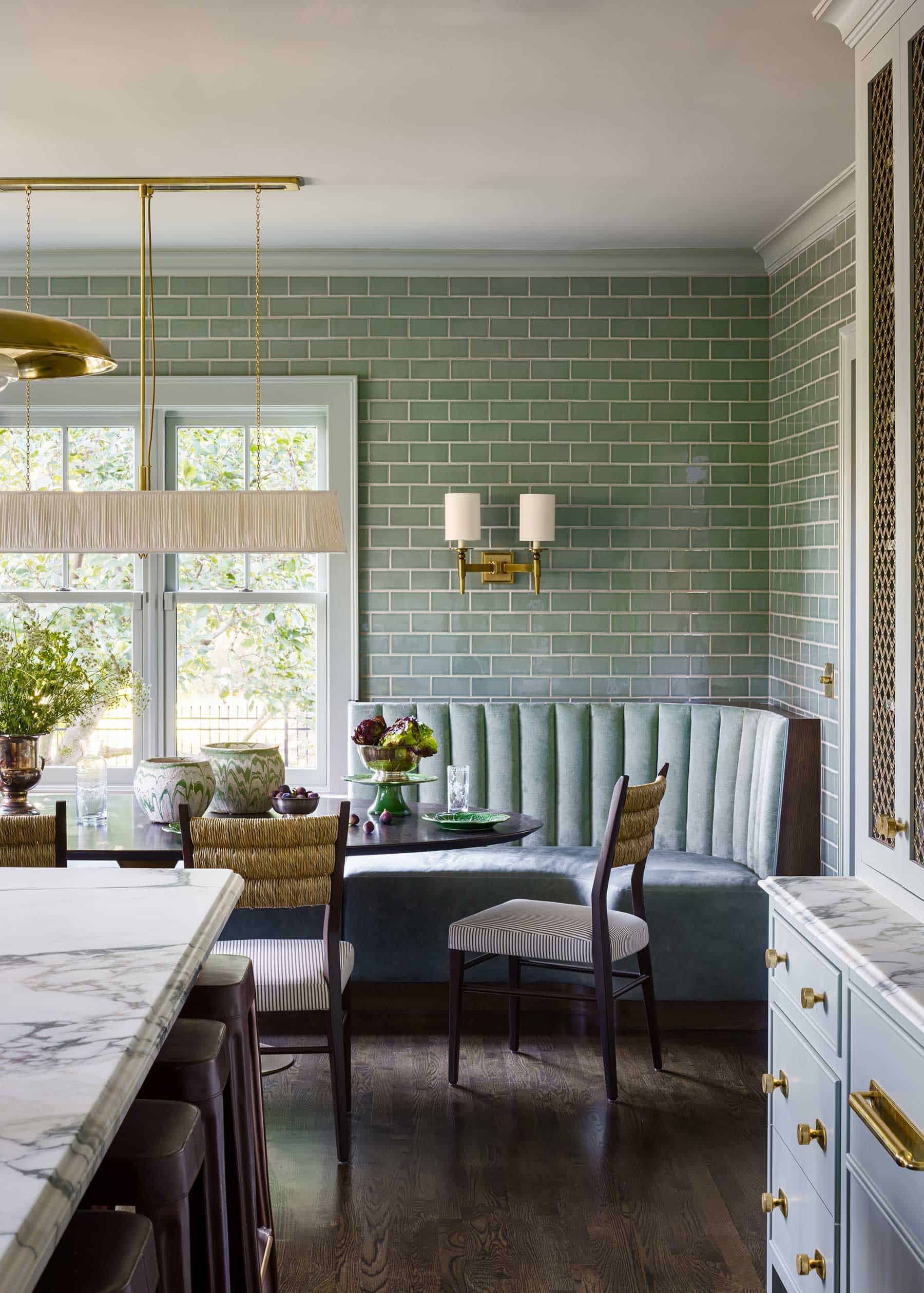 Bring on color in the kitchen, then, starting with a teal Lacanche range that photographs as blue, with brass detailing and a matching rotisserie nearby. Handmade tile wraps the space in subtle shimmer; a custom banquette offers a place for morning coffee or long dinner conversations, upholstered in leather and channeled velvet. “It’s a bold color that somehow behaves like a neutral,” Bennett notes. “Soft, calm, but with a pulse.”