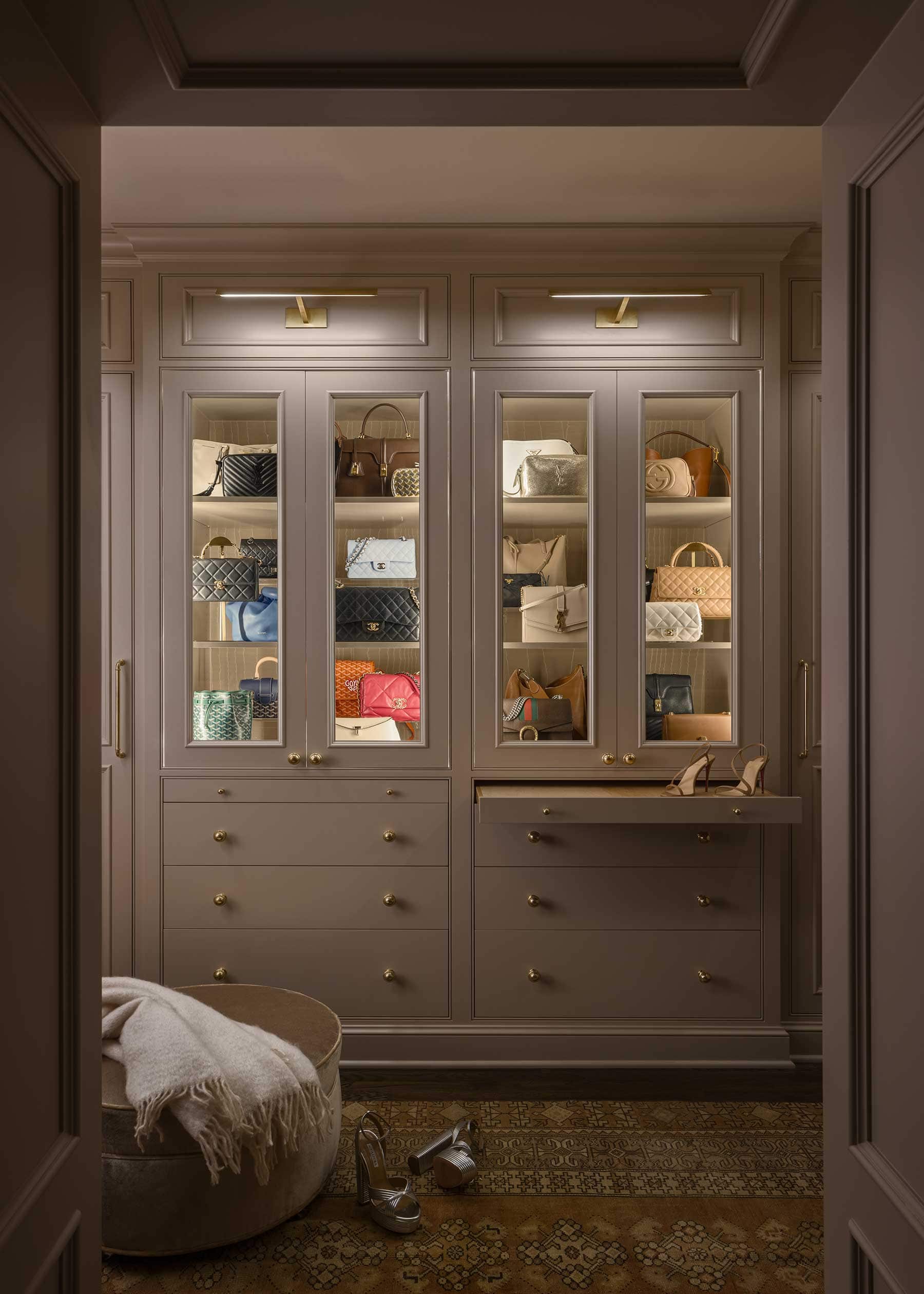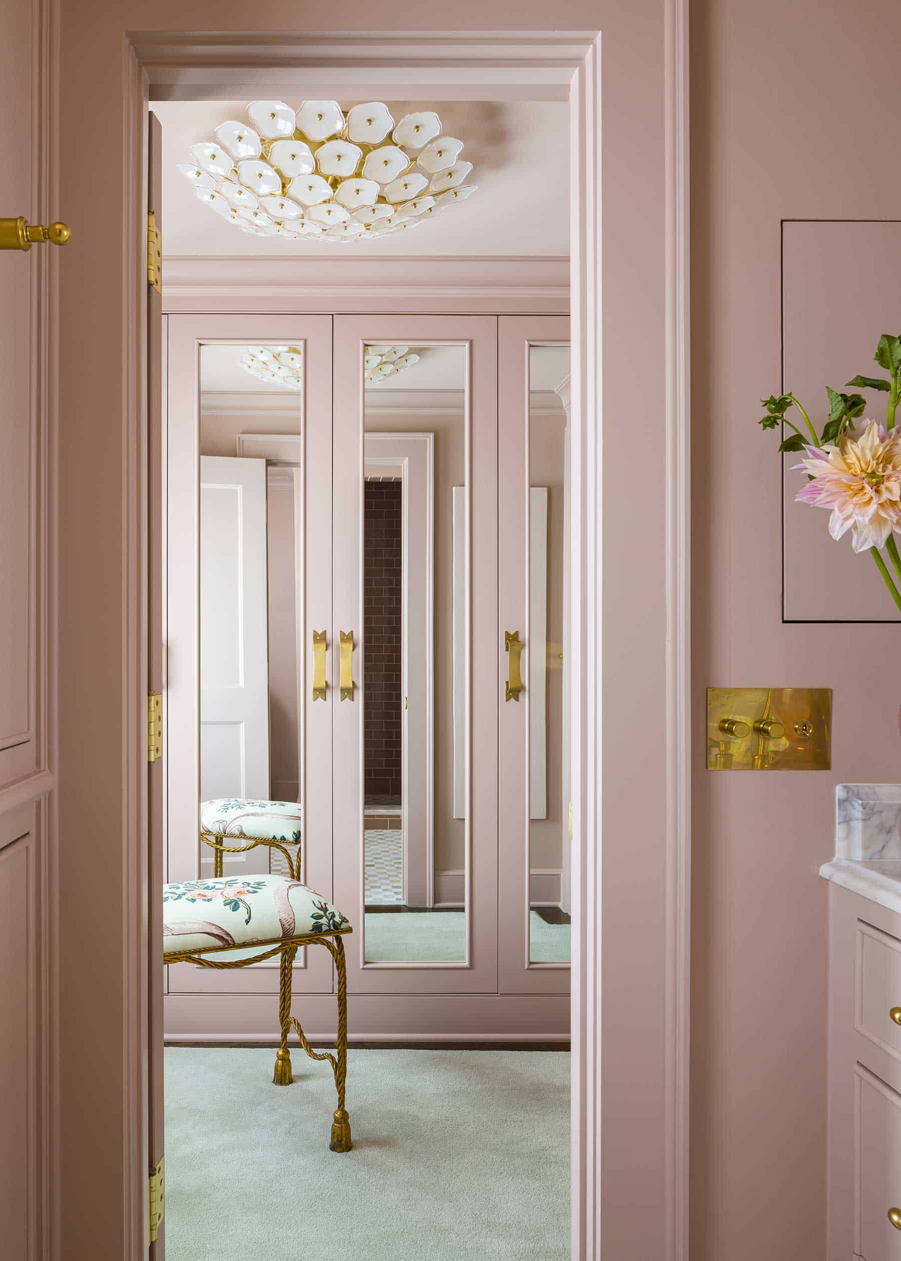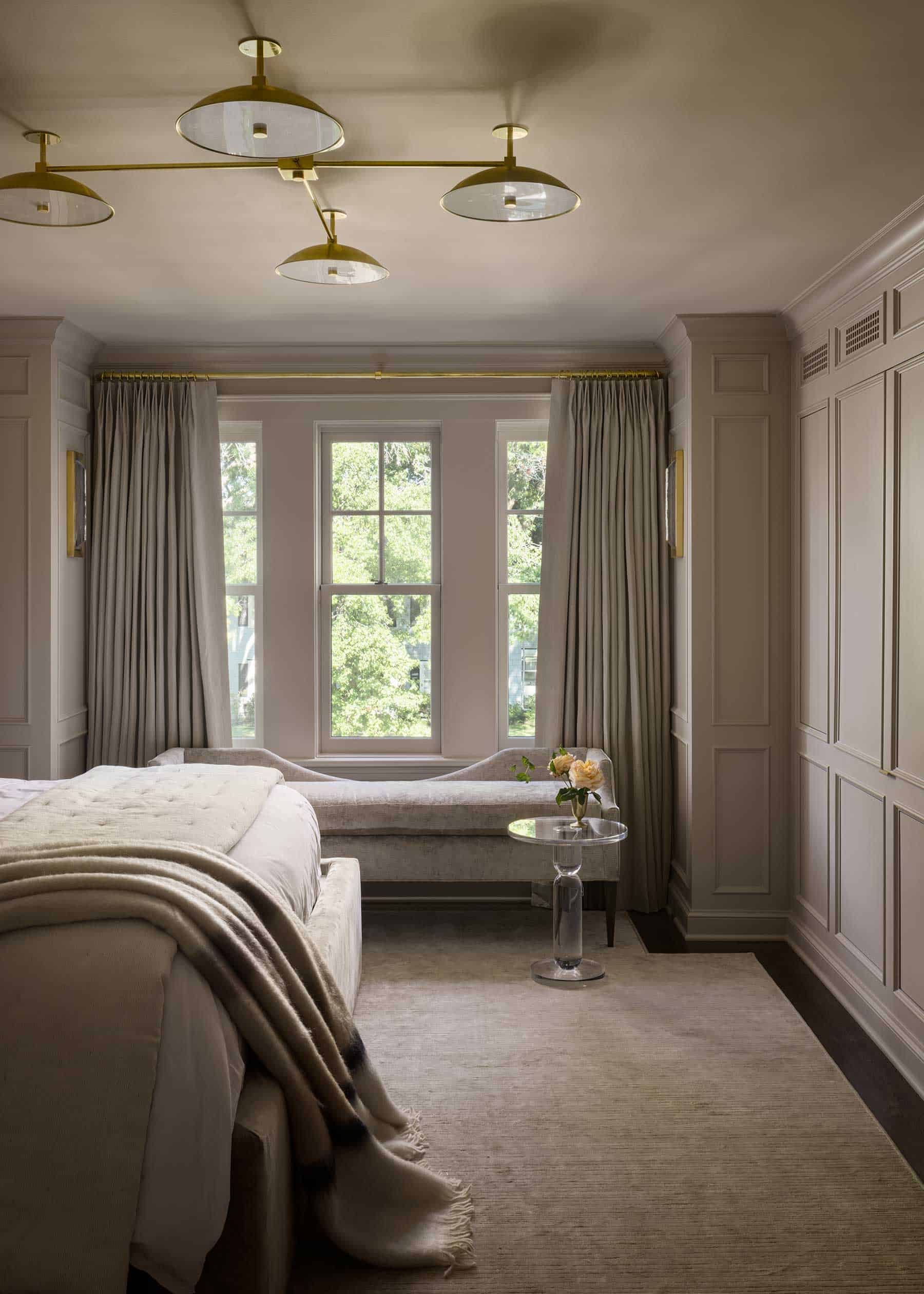 Upstairs, the mood shifts from rich to refined. The primary suite channels boutique-hotel serenity with mauve-toned paneling, hidden cabinetry, and fluted glass and brass doors in the bath. “We probably went through twenty paint colors to find a perfect mauve,” Bennett says. “It needed to feel like a cocoon—warm, moody, and elegant without trying too hard.”