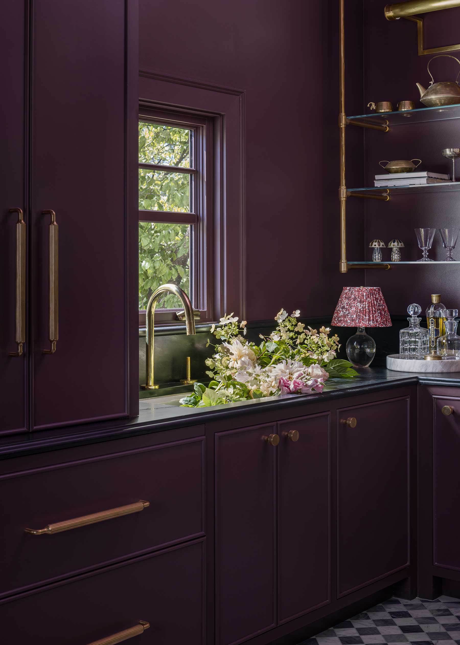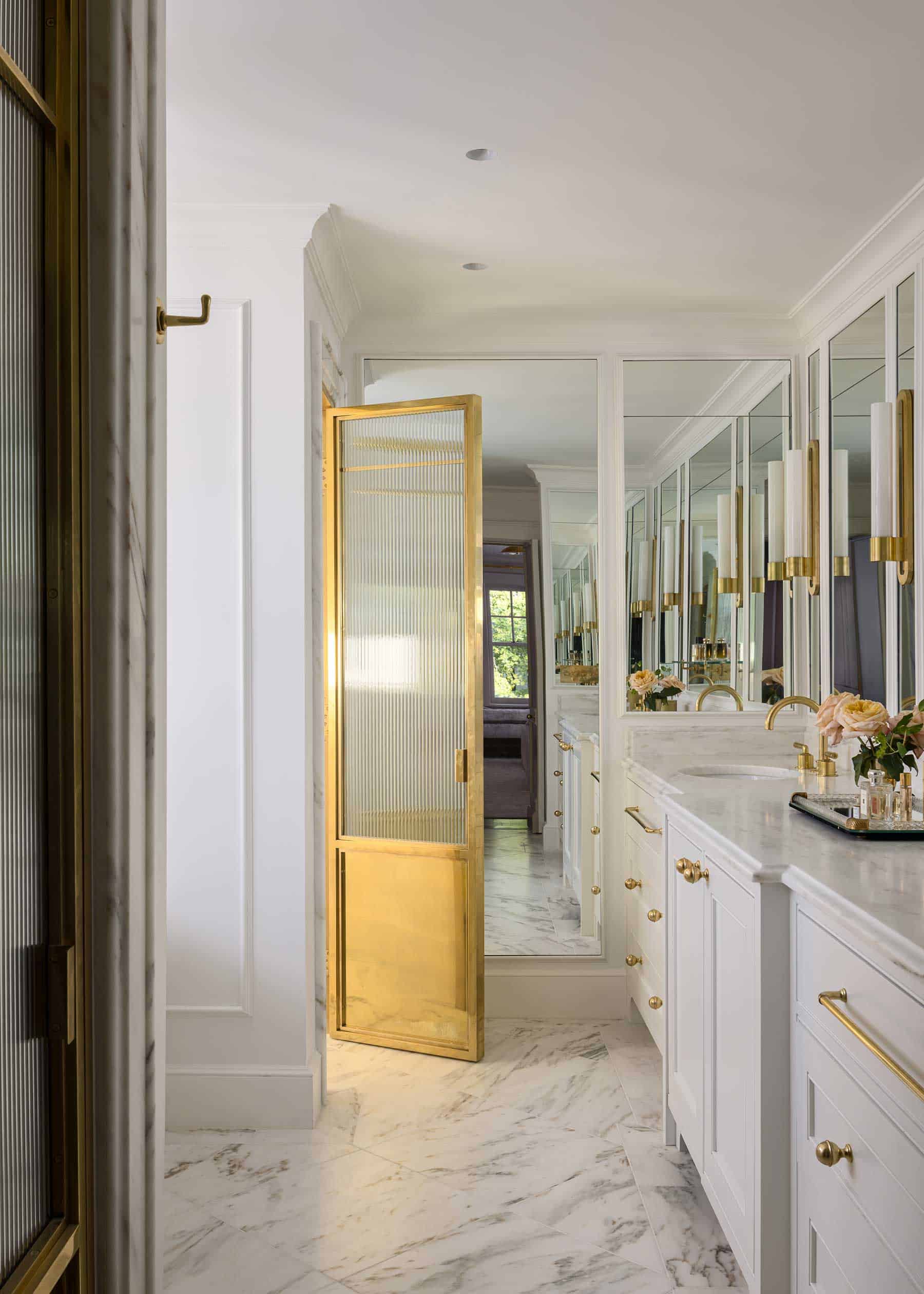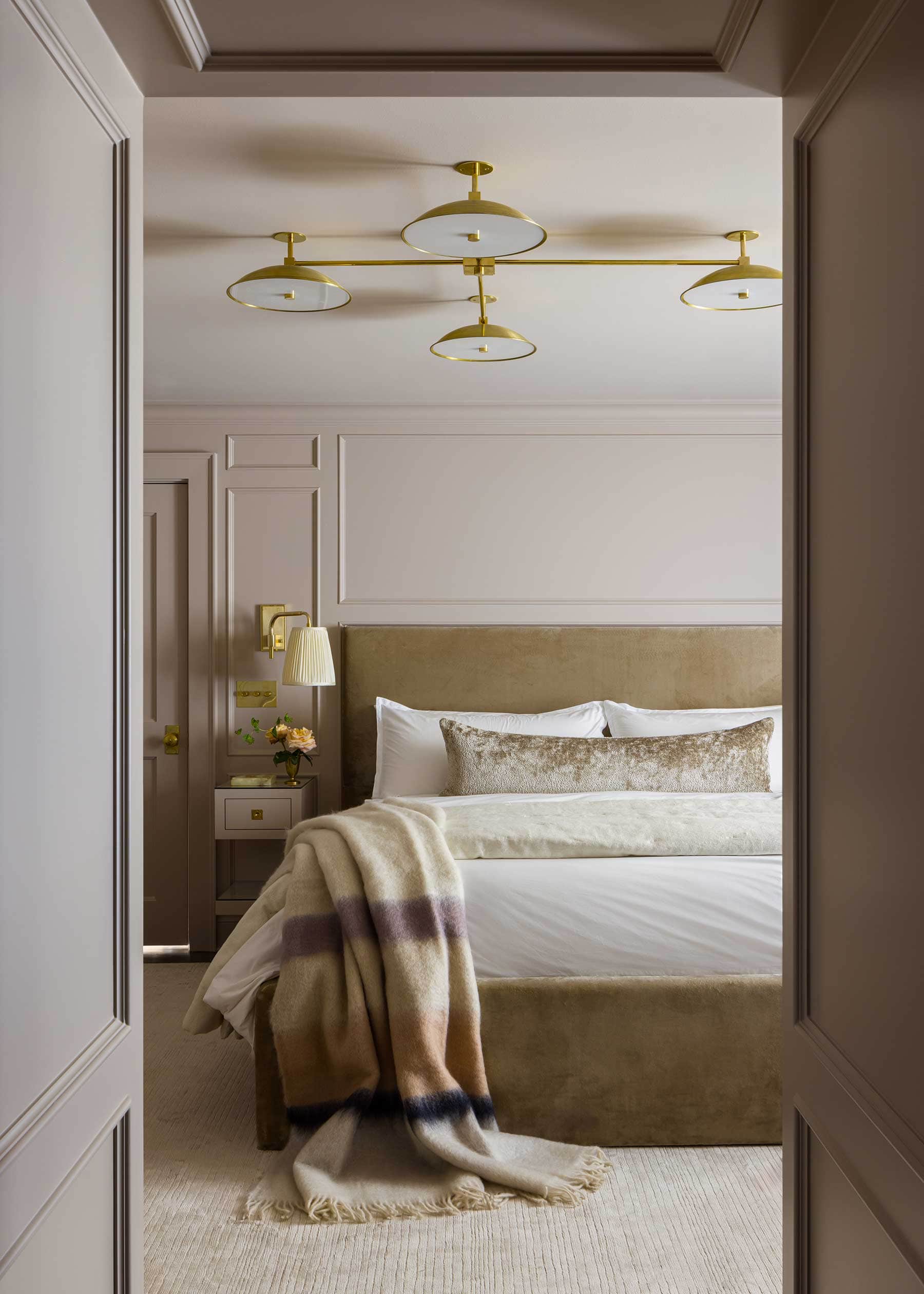 Upstairs, the mood shifts from rich to refined. The primary suite channels boutique-hotel serenity with mauve-toned paneling, hidden cabinetry, and fluted glass and brass doors in the bath. “We probably went through twenty paint colors to find a perfect mauve,” Bennett says. “It needed to feel like a cocoon—warm, moody, and elegant without trying too hard.”