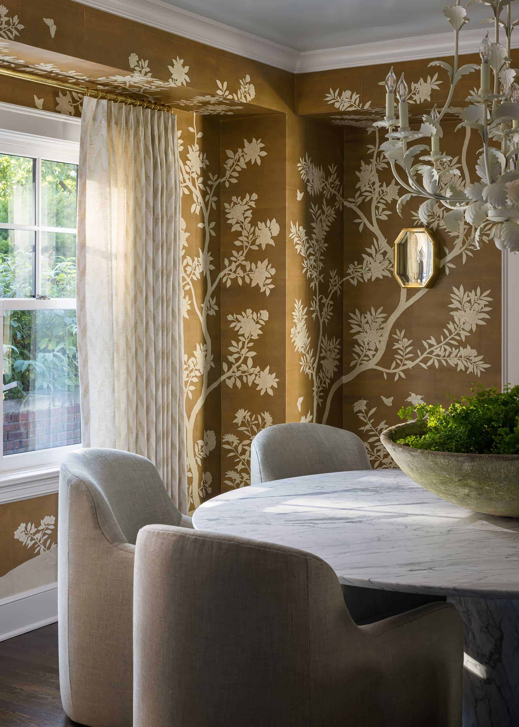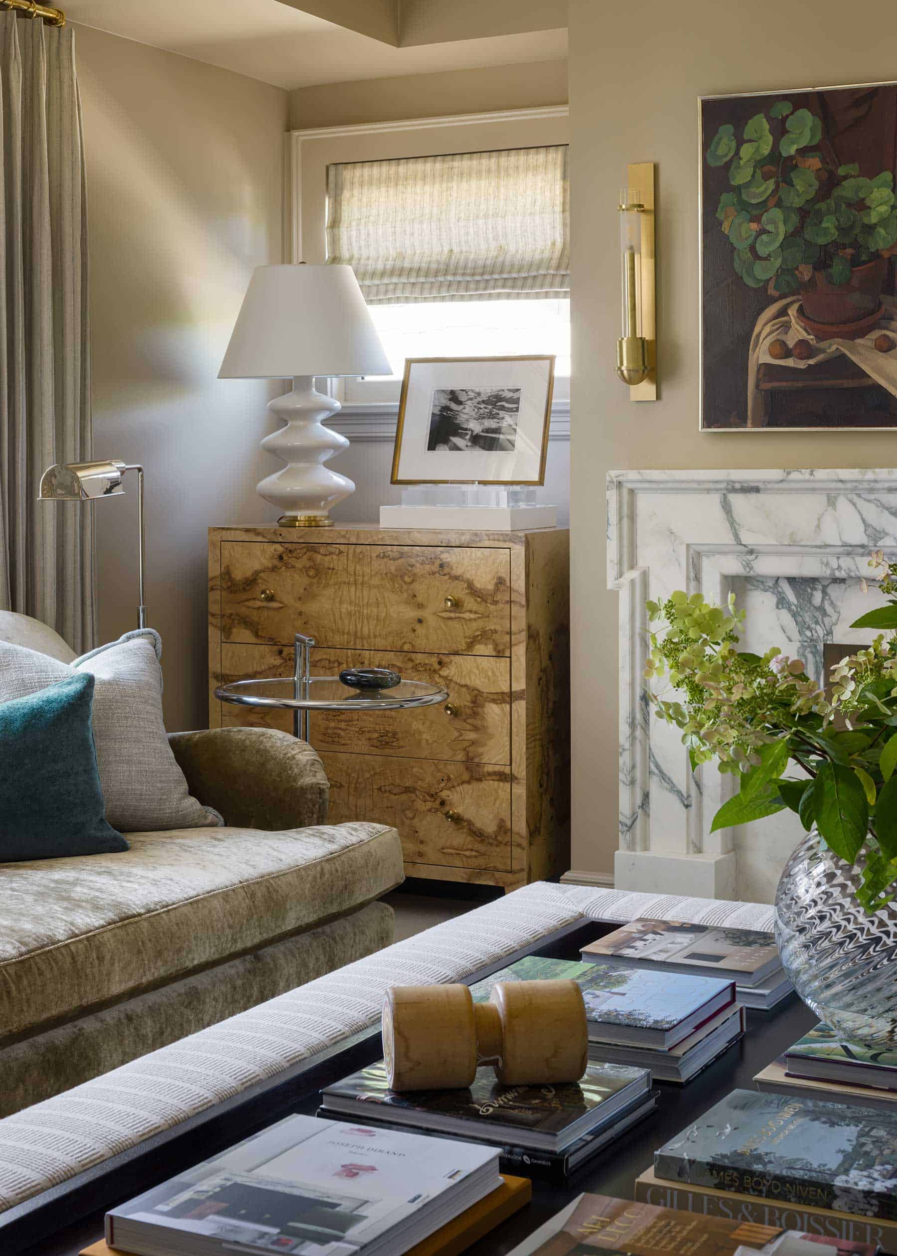 That respect for proportion defines every room. In the dining room, a hand-painted Gracie wallpaper in tobacco and cream grounds the palette in quiet luxury. The adjacent living room layers marble, burl wood, and velvet under sculptural brass lighting; it feels like an invitation to linger rather than impress, though it does both.