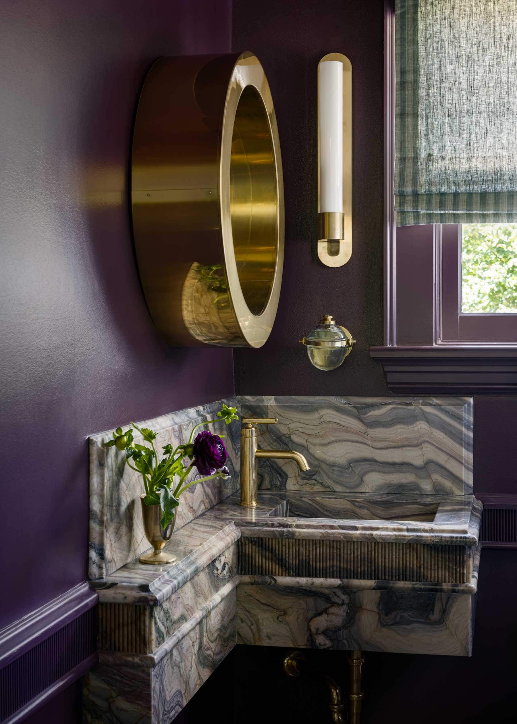 Even the smallest spaces feel intentional. The “party powder” bath is tucked under the stairs but is not to be ignored: “It’s small, but it’s unforgettable,” Bennett says. Every detail counts, she says of the ribbed Fantasy Brown marble corner sink, warm brass, and European soap vessel that feels more sculpture than fixture.