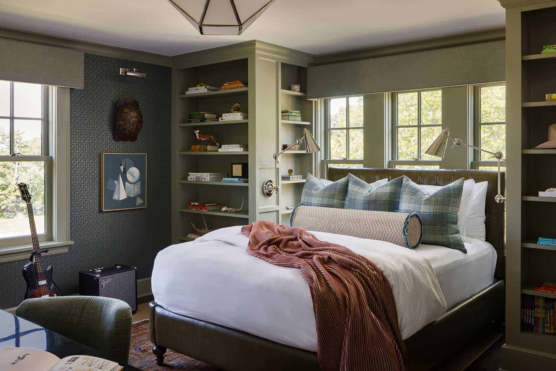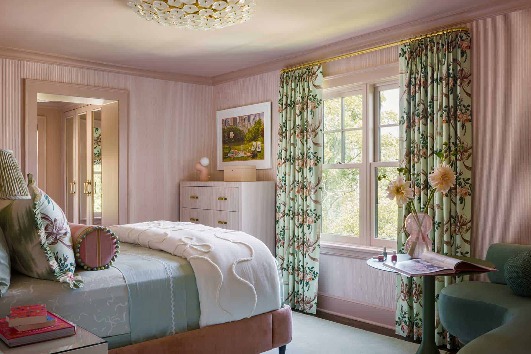 Each bedroom also tells a story. The daughter’s suite is a confection of Pierre Frey roses and ribbons, striped wallpaper, and brass accents. The space will age as gracefully as its owner. The son’s room, lined with built-in bookcases around the bed, nods to a young collector’s curiosity, with a marble-and-nickel bath that’s both masculine and timeless.
