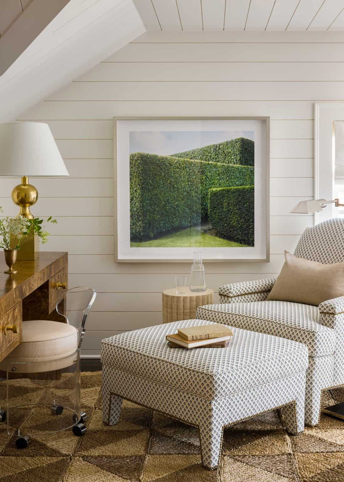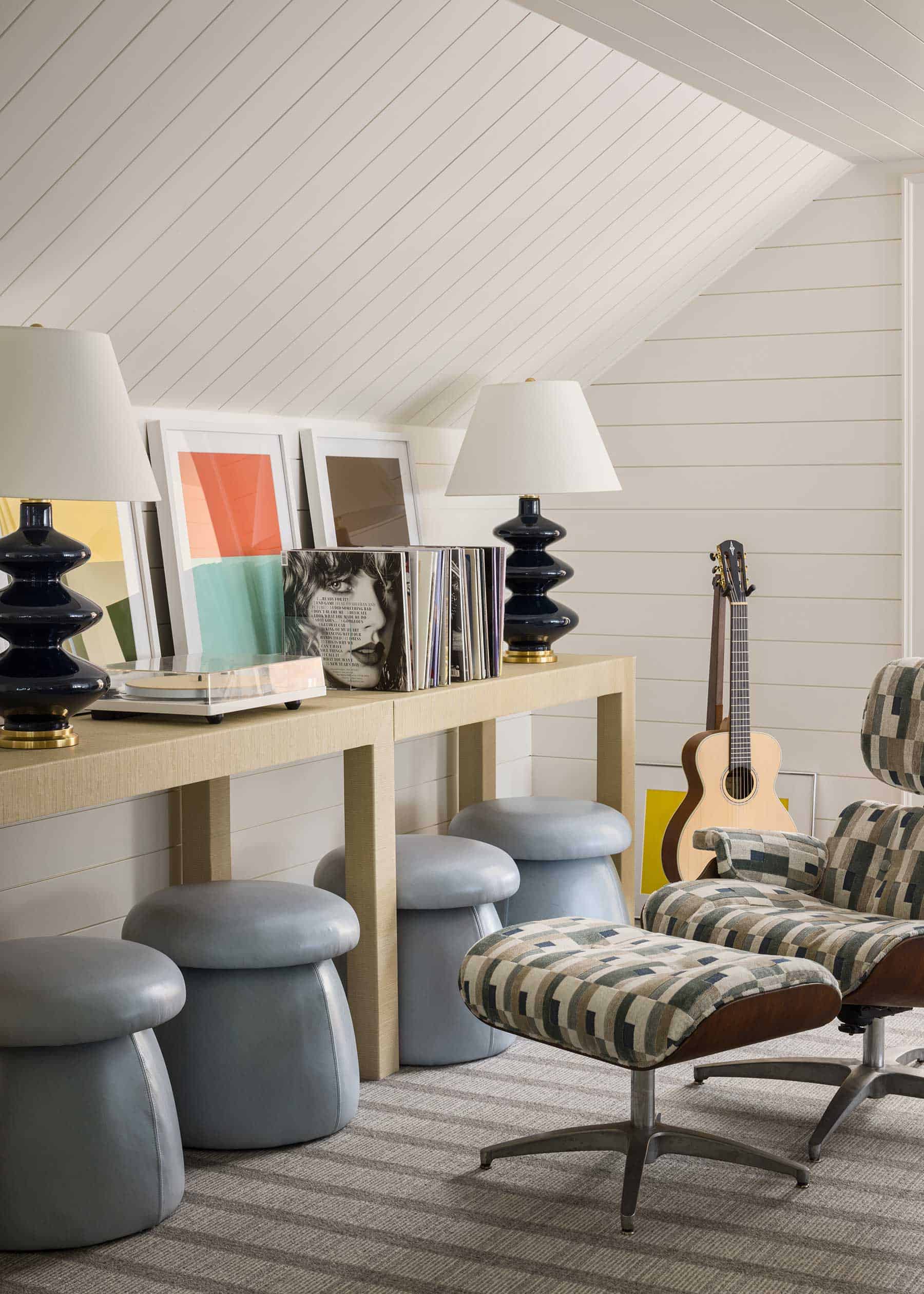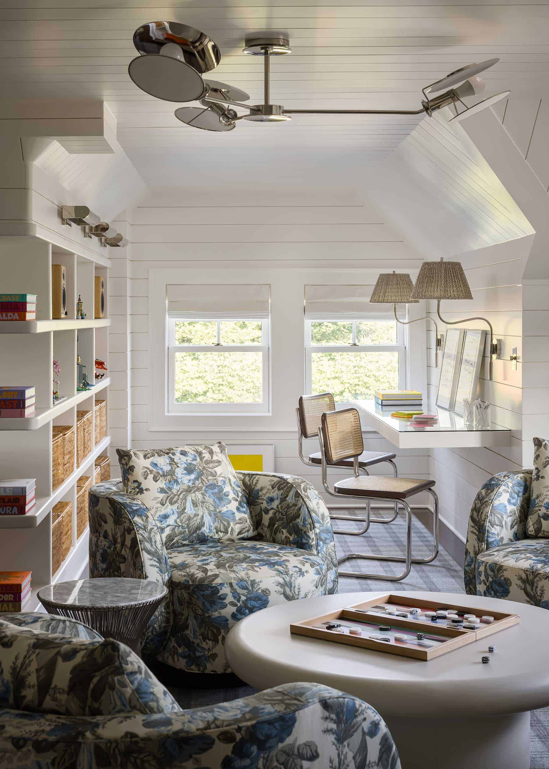 Up on the third floor, what was once an unfinished attic is now a family loft of white shiplap, swivel chairs, and board-game energy. There’s even a guest suite tucked under the eaves, a quiet retreat dressed in navy and linen tones. Light pours through new dormers, softening the roofline and making the top floor feel like an airy escape.